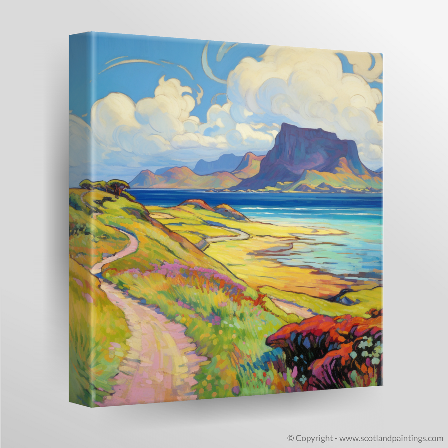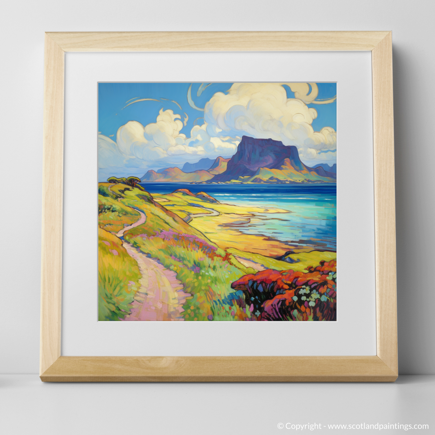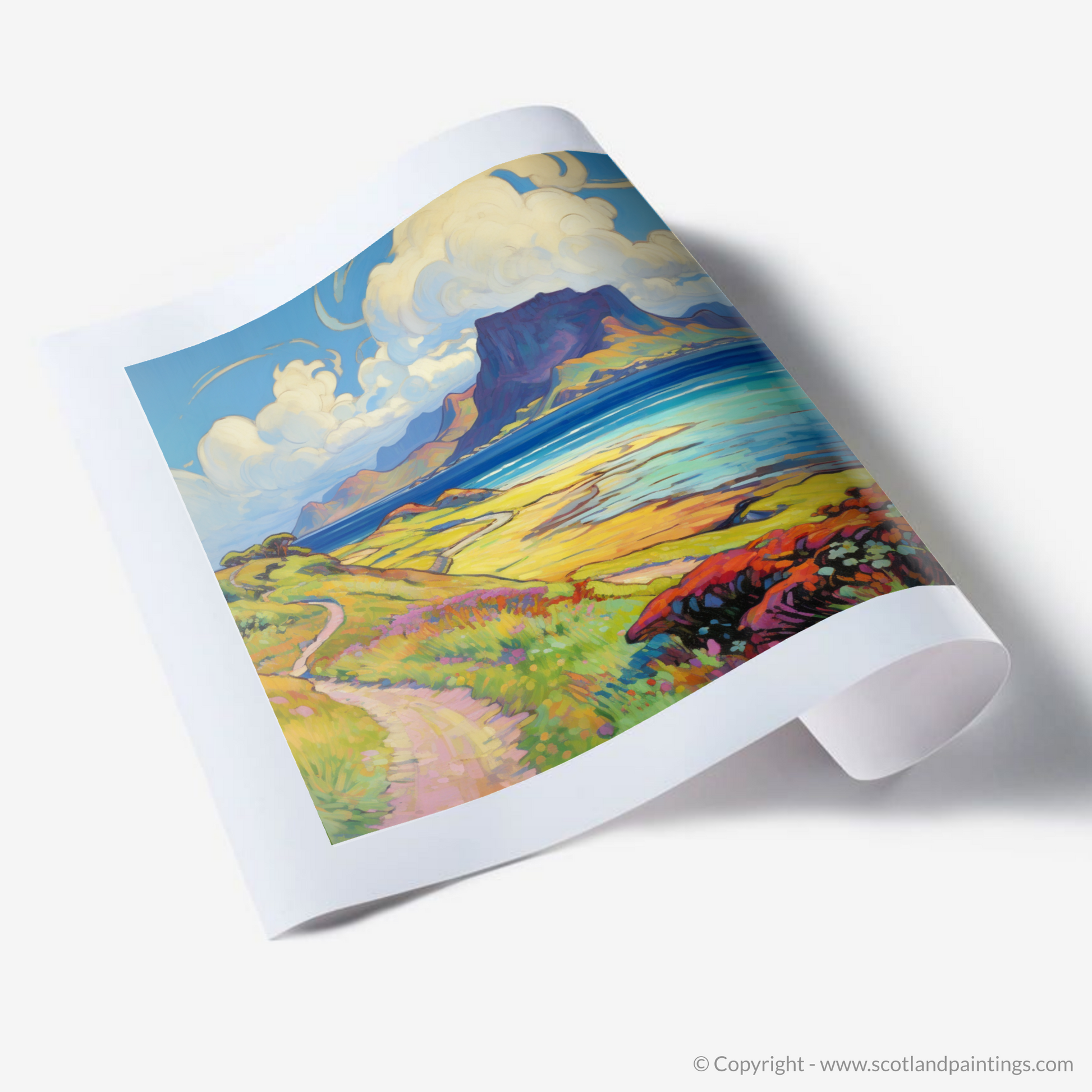 Capturing the essence of a serene Scottish summer, this arresting print takes viewers to the enchanting Isle of Eigg, nestled within the Inner Hebrides. With its vivid palette and fluid brushstrokes characteristic of the Impressionist style, the artwork evokes a sense of warmth, vibrancy, and the fleeting beauty of summer.