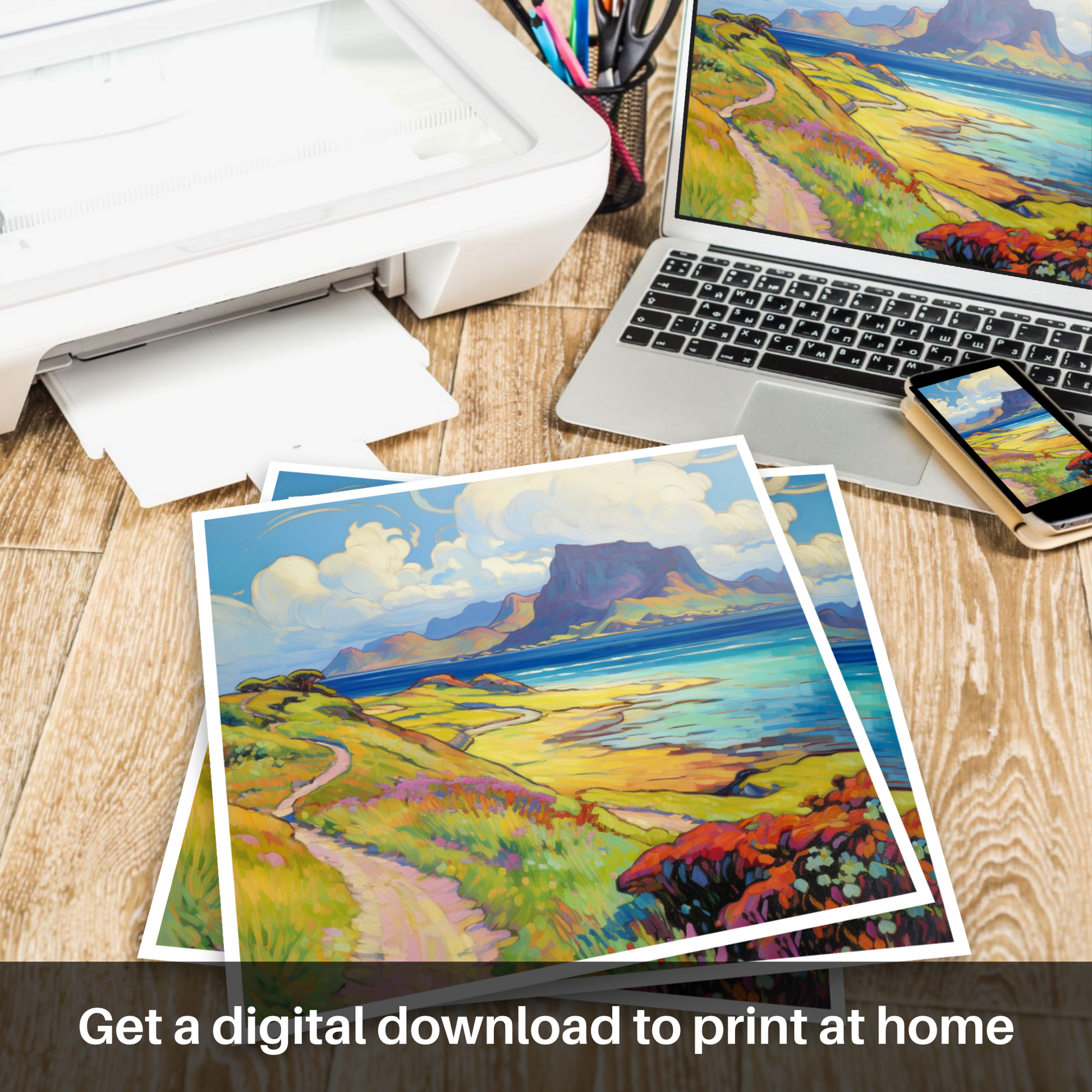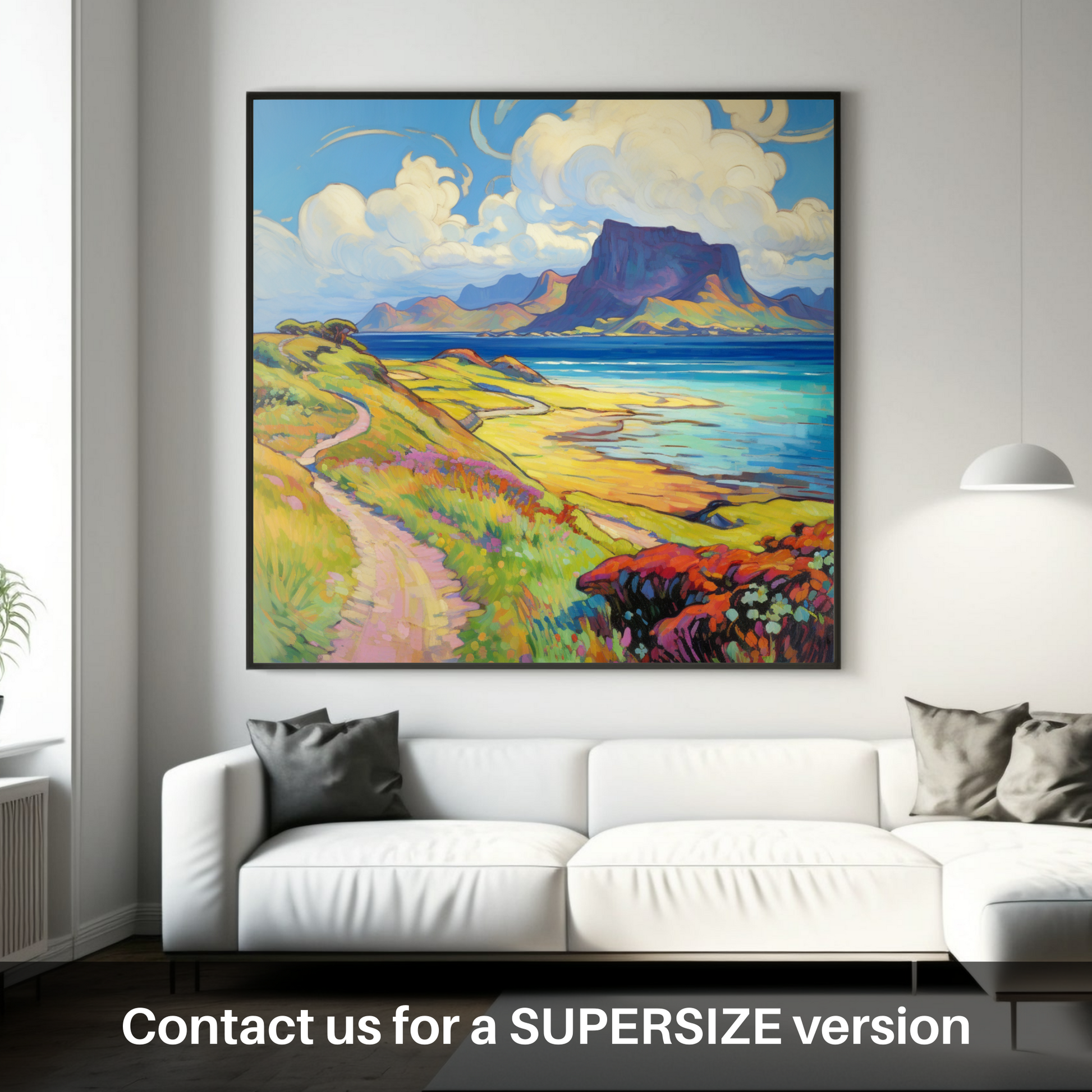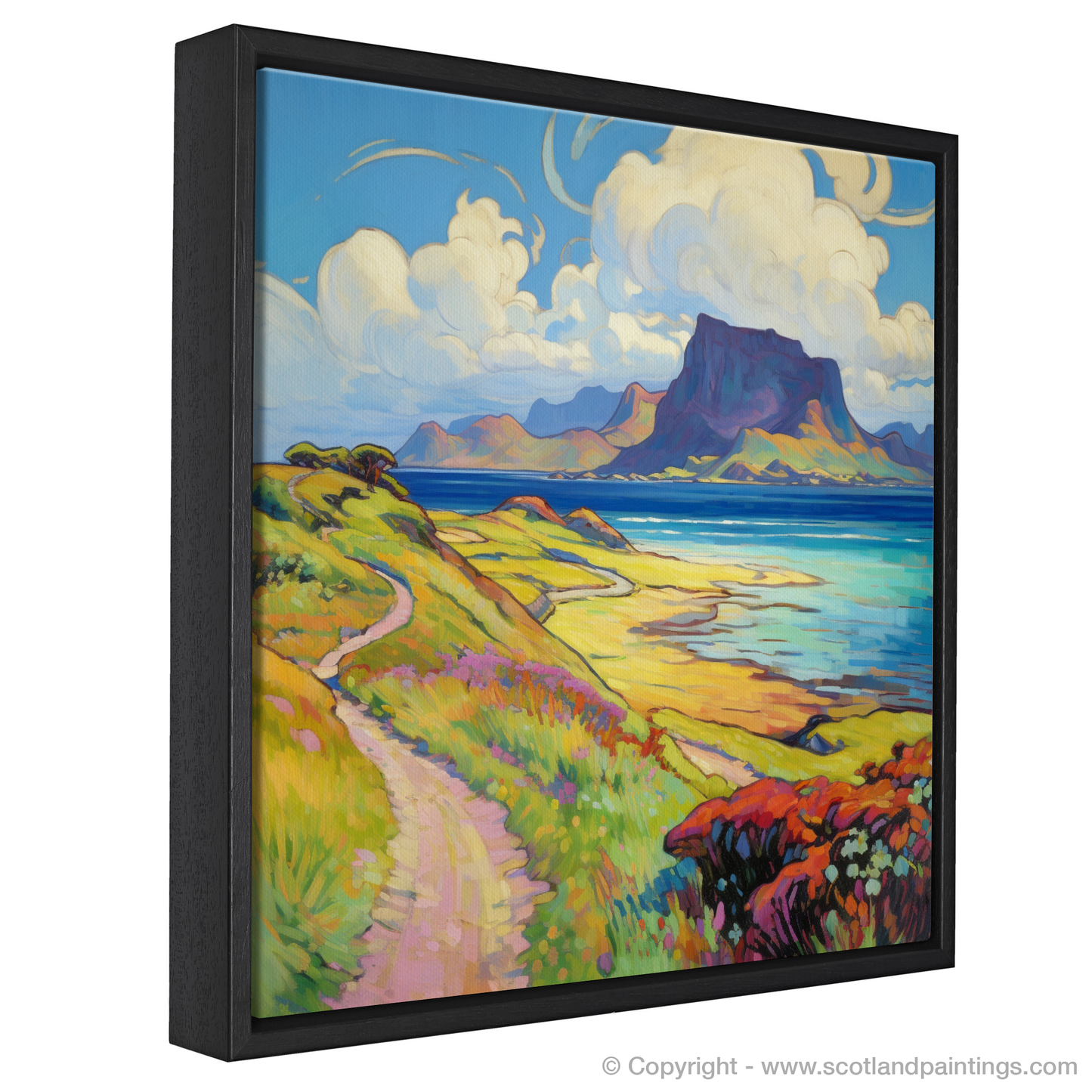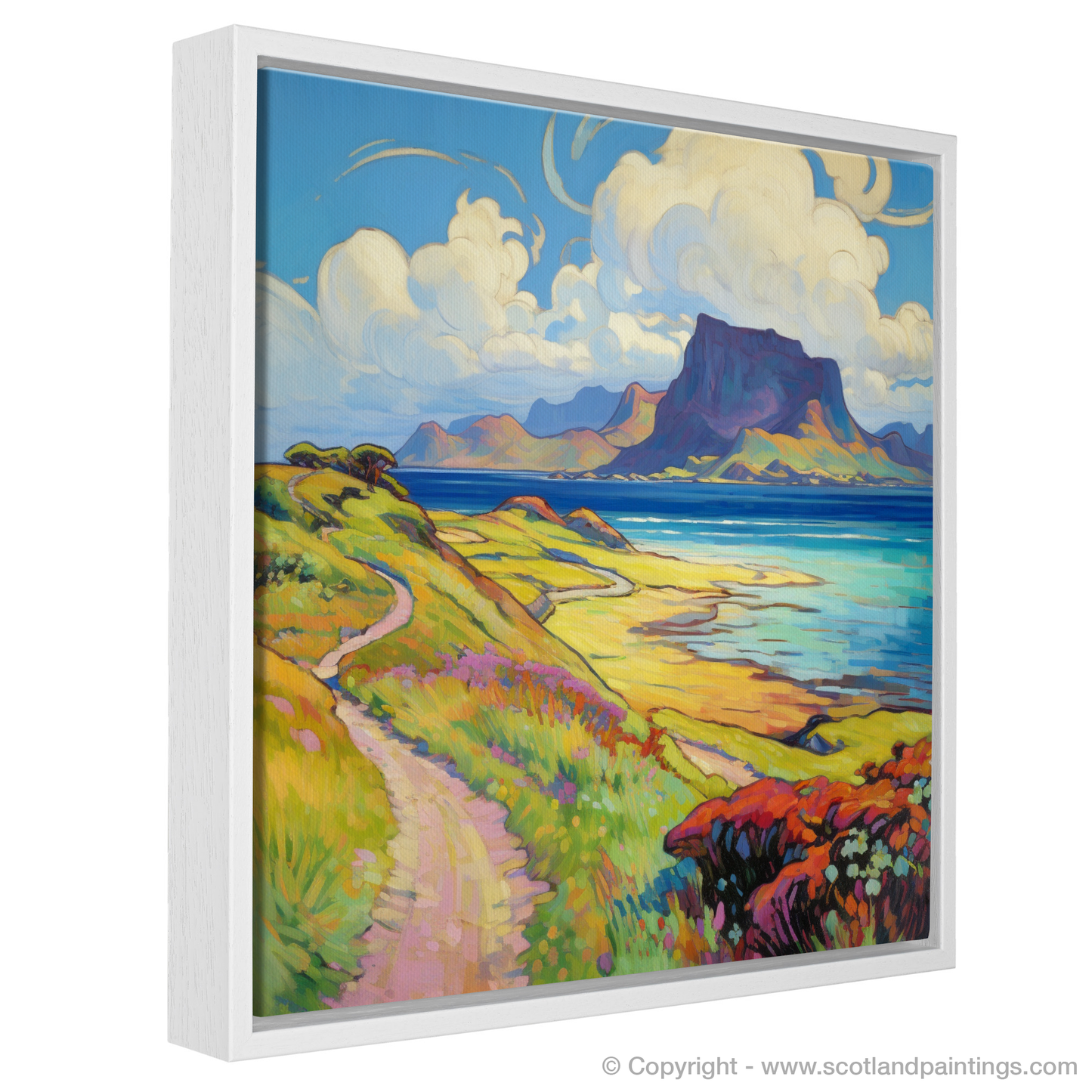 Capturing the essence of a serene Scottish summer, this arresting print takes viewers to the enchanting Isle of Eigg, nestled within the Inner Hebrides. With its vivid palette and fluid brushstrokes characteristic of the Impressionist style, the artwork evokes a sense of warmth, vibrancy, and the fleeting beauty of summer.