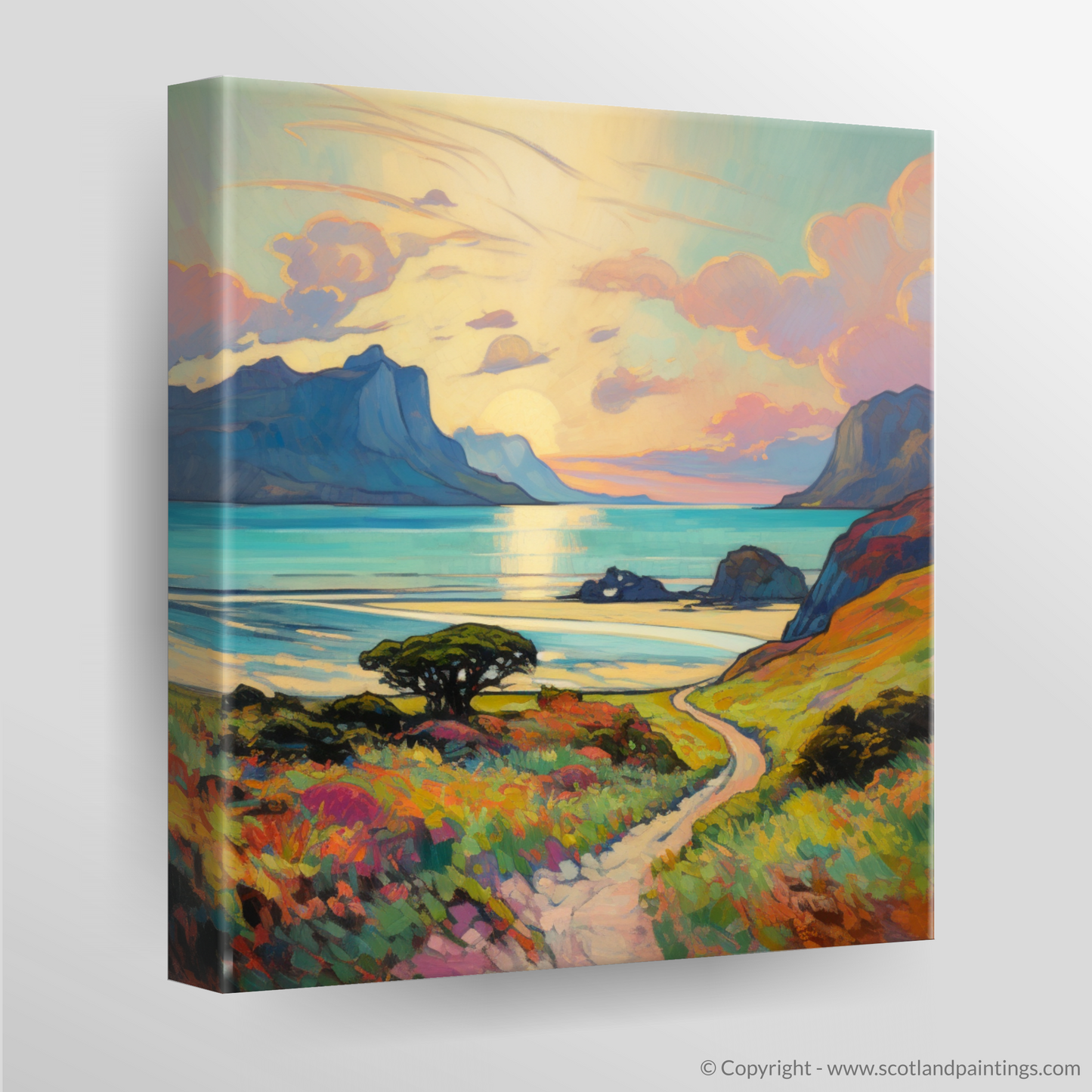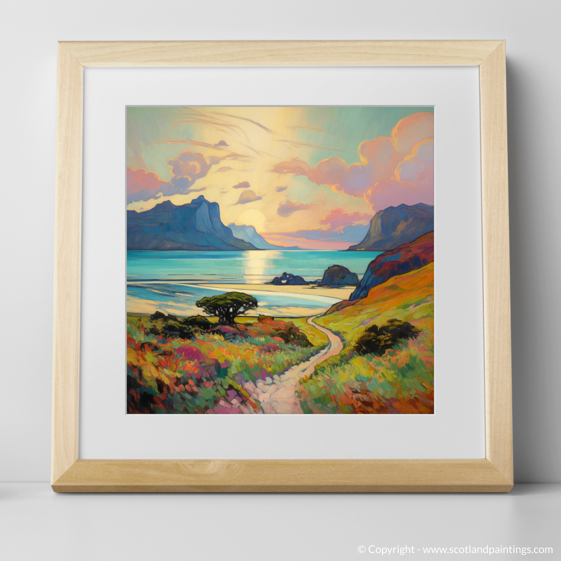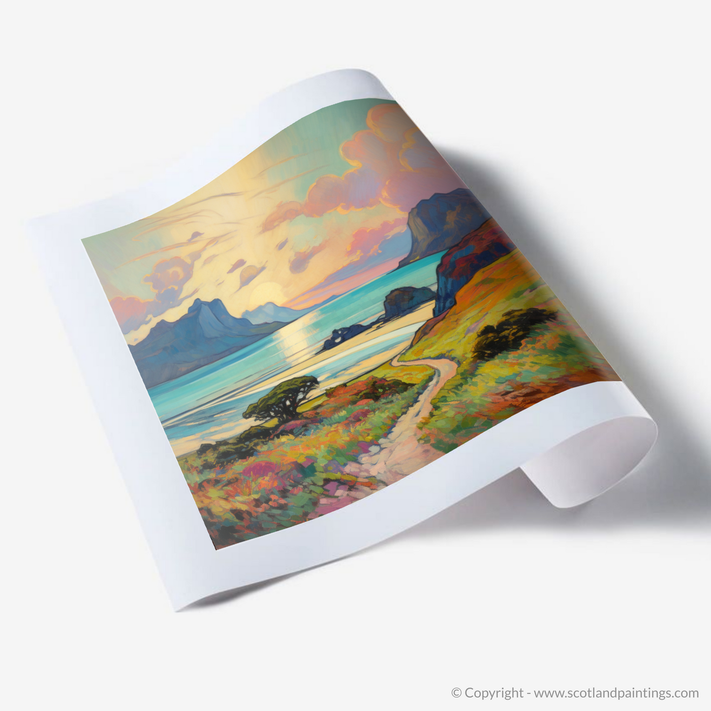 Captured in the evocative style of Impressionism, this exquisite print showcases the breathtaking beauty of the Isle of Eigg, nestled within the Inner Hebrides during the warm embrace of summer. The composition beckons the viewer into a vivid landscape, where the play of light and colour coalesce into a symphony of visual delight.