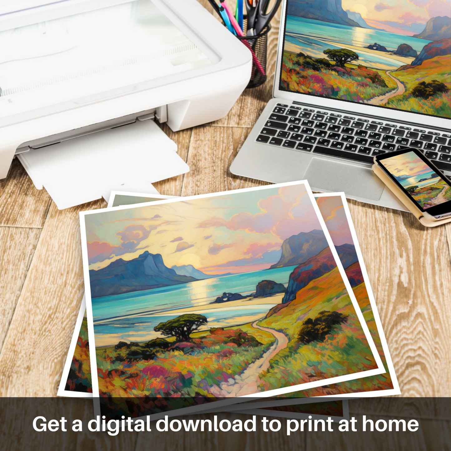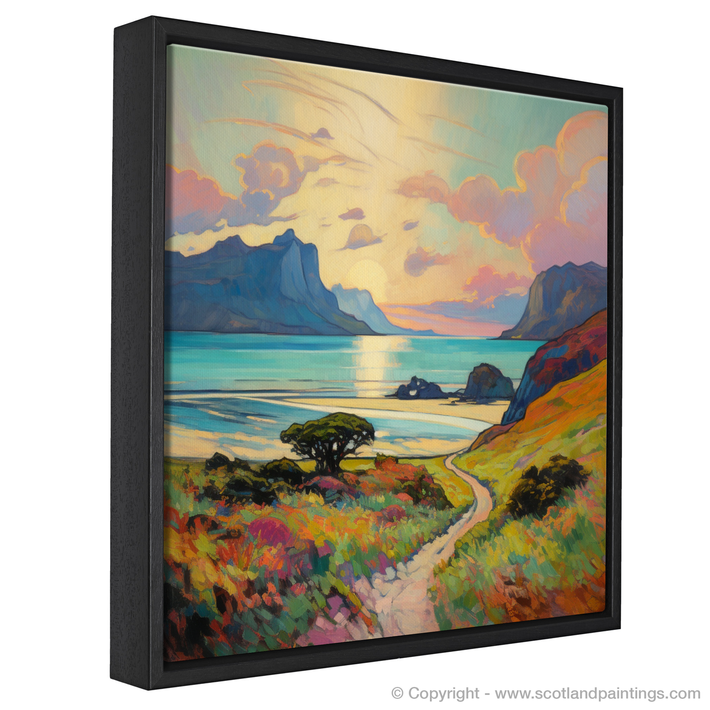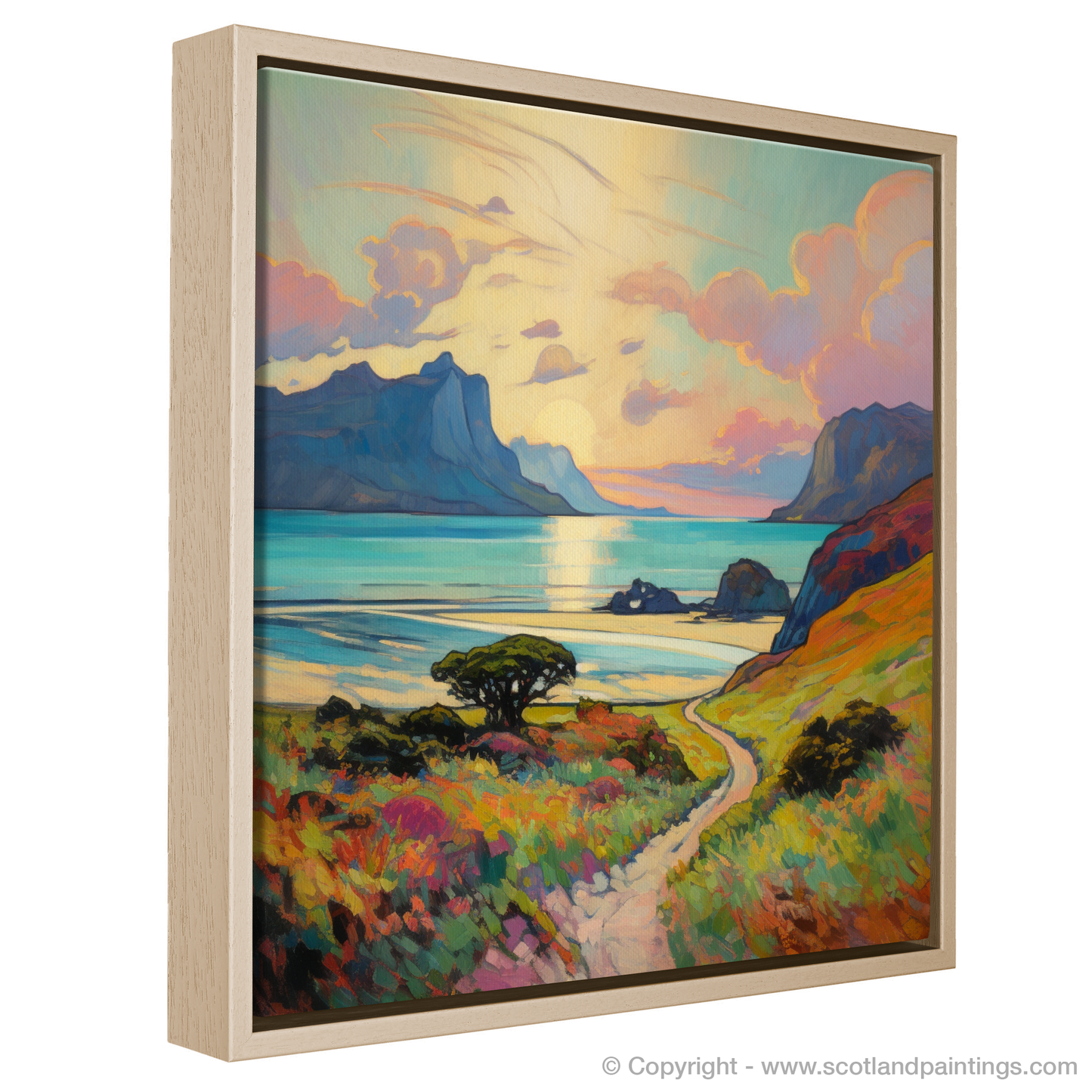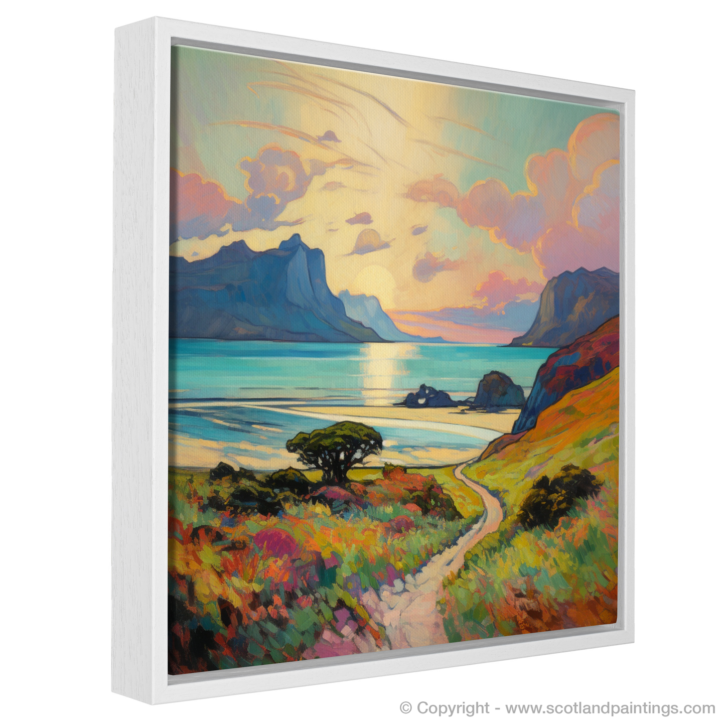 Captured in the evocative style of Impressionism, this exquisite print showcases the breathtaking beauty of the Isle of Eigg, nestled within the Inner Hebrides during the warm embrace of summer. The composition beckons the viewer into a vivid landscape, where the play of light and colour coalesce into a symphony of visual delight.