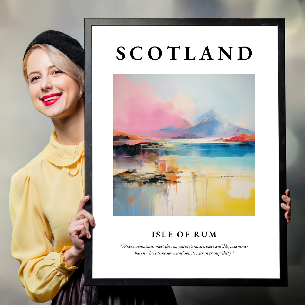 The poster features the word “SCOTLAND” at the top in bold lettering, drawing the eye to the mesmerising abstract painting below. The artwork captures the Isle of Rum’s untamed landscapes with strokes of vibrant pinks and blues, blending with earthier tones that evoke the tranquil meeting of sea and mountains. Beneath the visual symphony, the quote “Where mountains meet the sea, nature's masterpiece unfolds; a summer haven where time slows and spirits soar in tranquillity” echoes the painting’s serene yet invigorating spirit.
