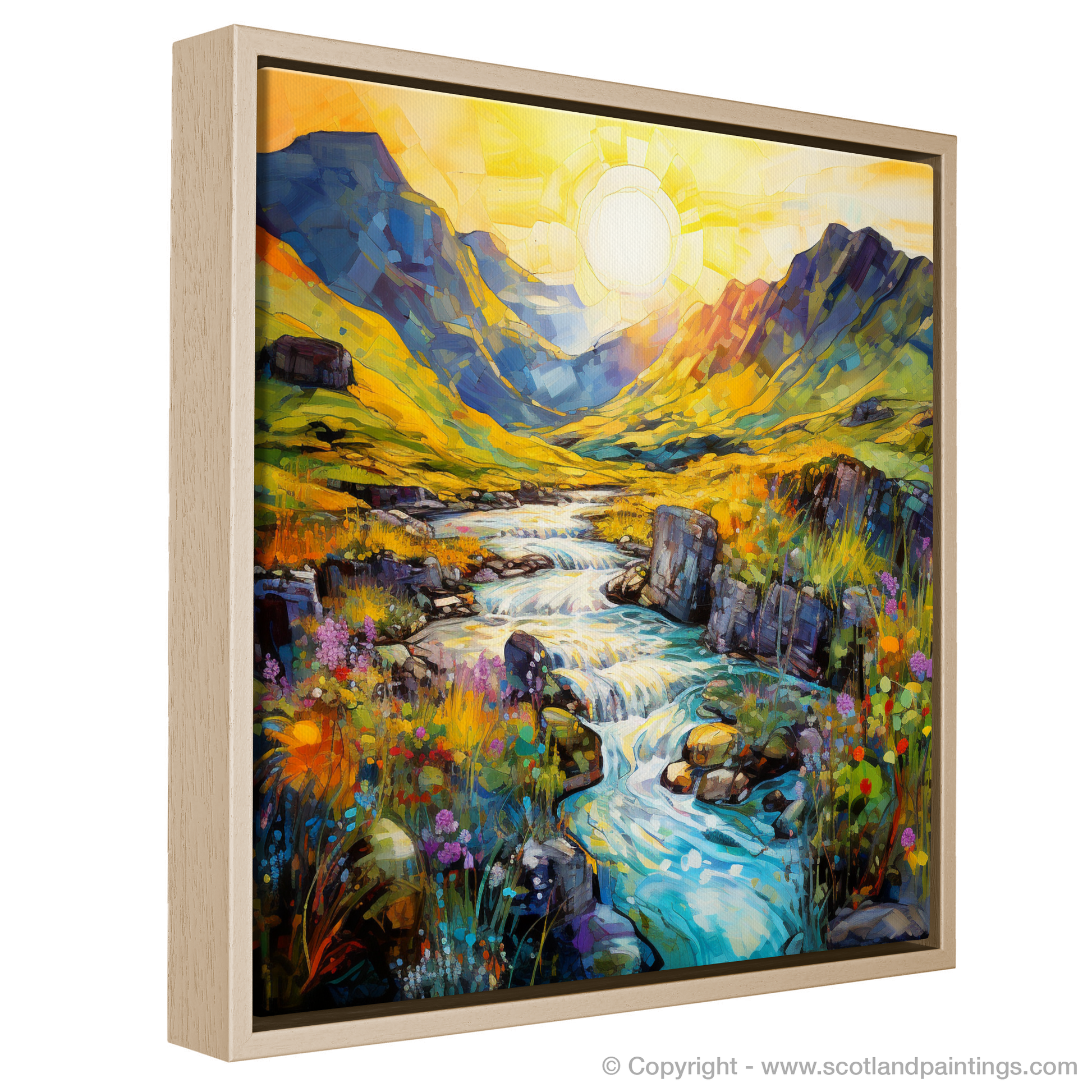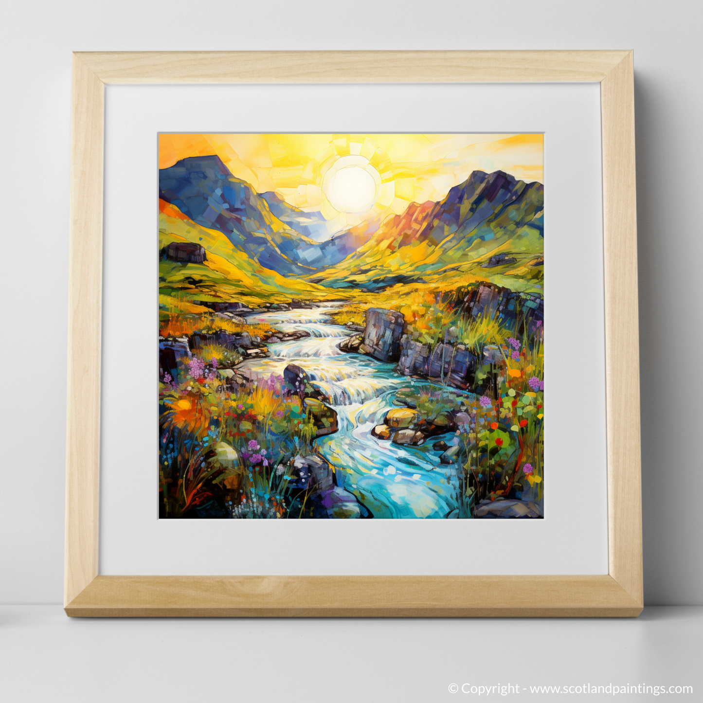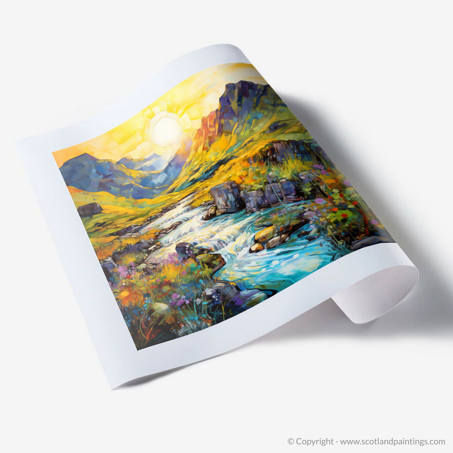 Captured in the enchanting light of a summer's golden hour, this exquisite print evokes the magical essence of the Isle of Skye's Fairy Pools. With brushstrokes that dance and blend into a mesmerising symphony of colour, this piece transports you to the heart of Scotland’s untamed beauty.