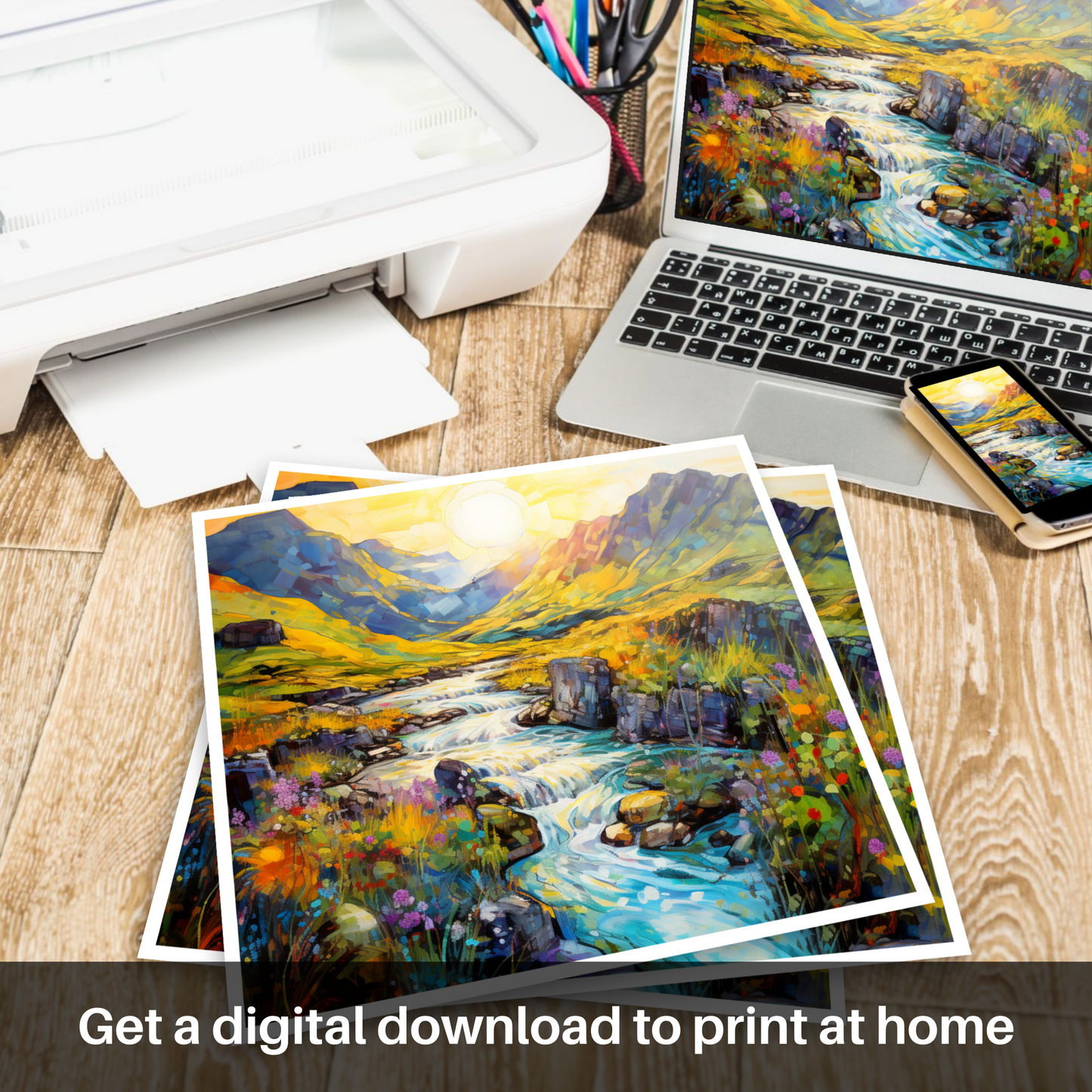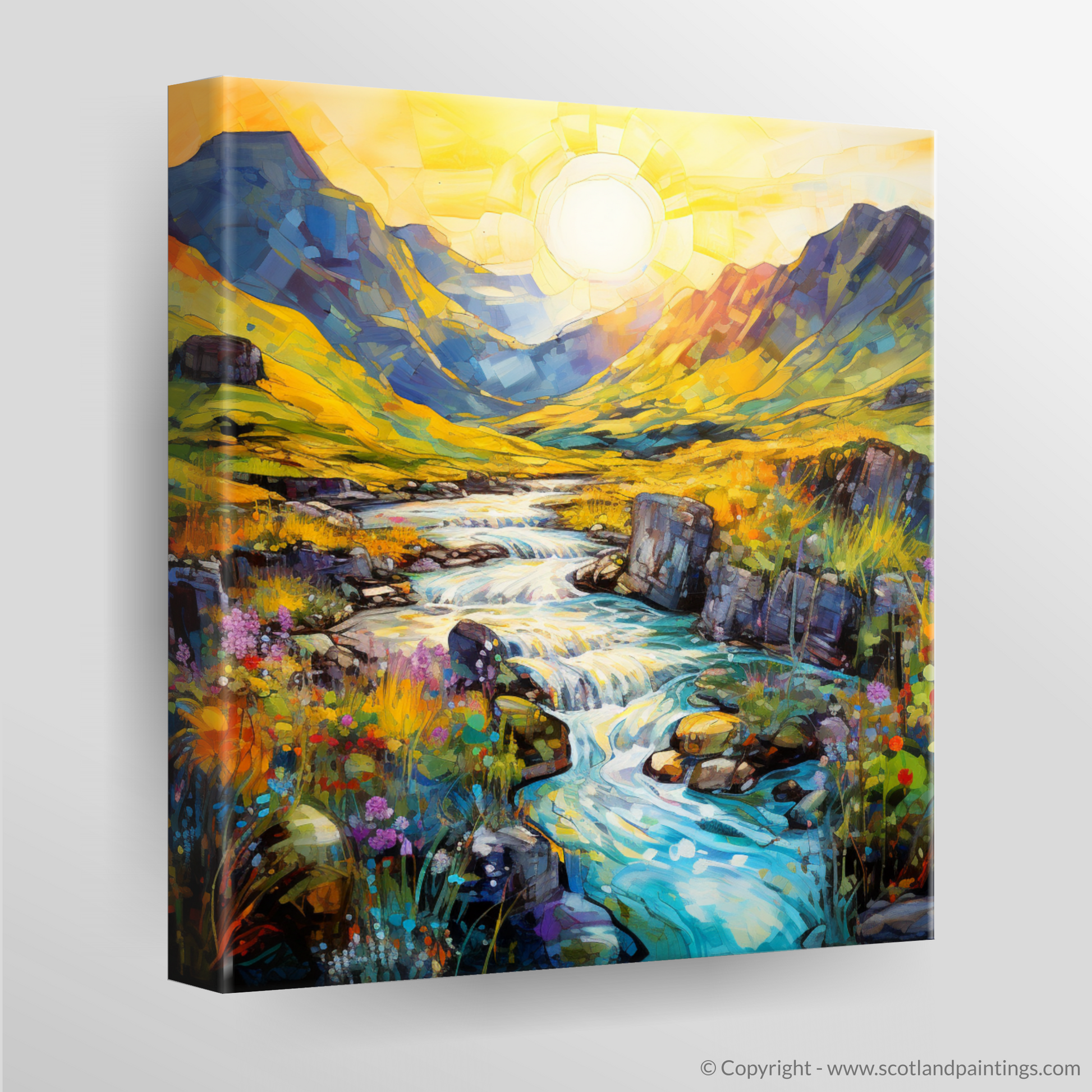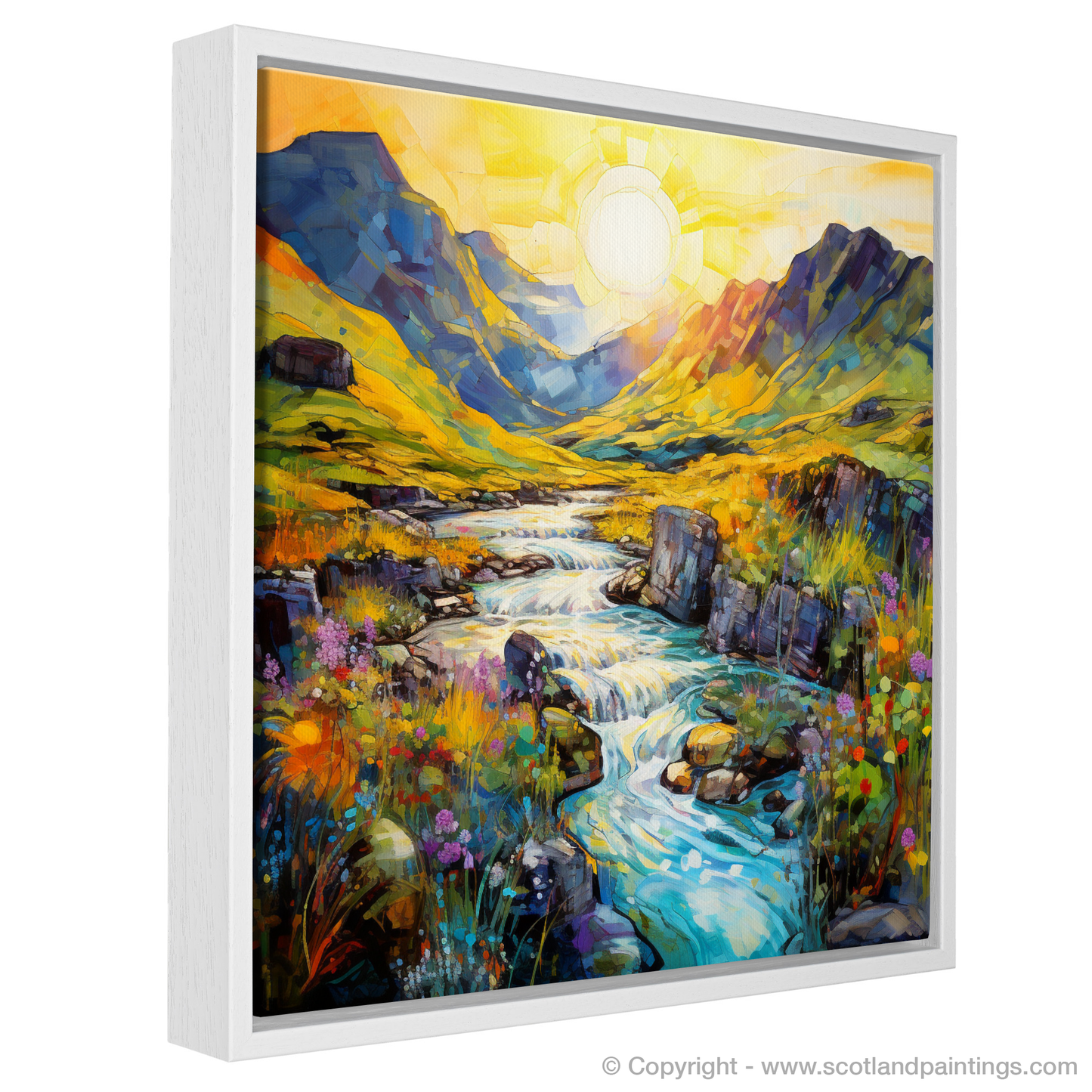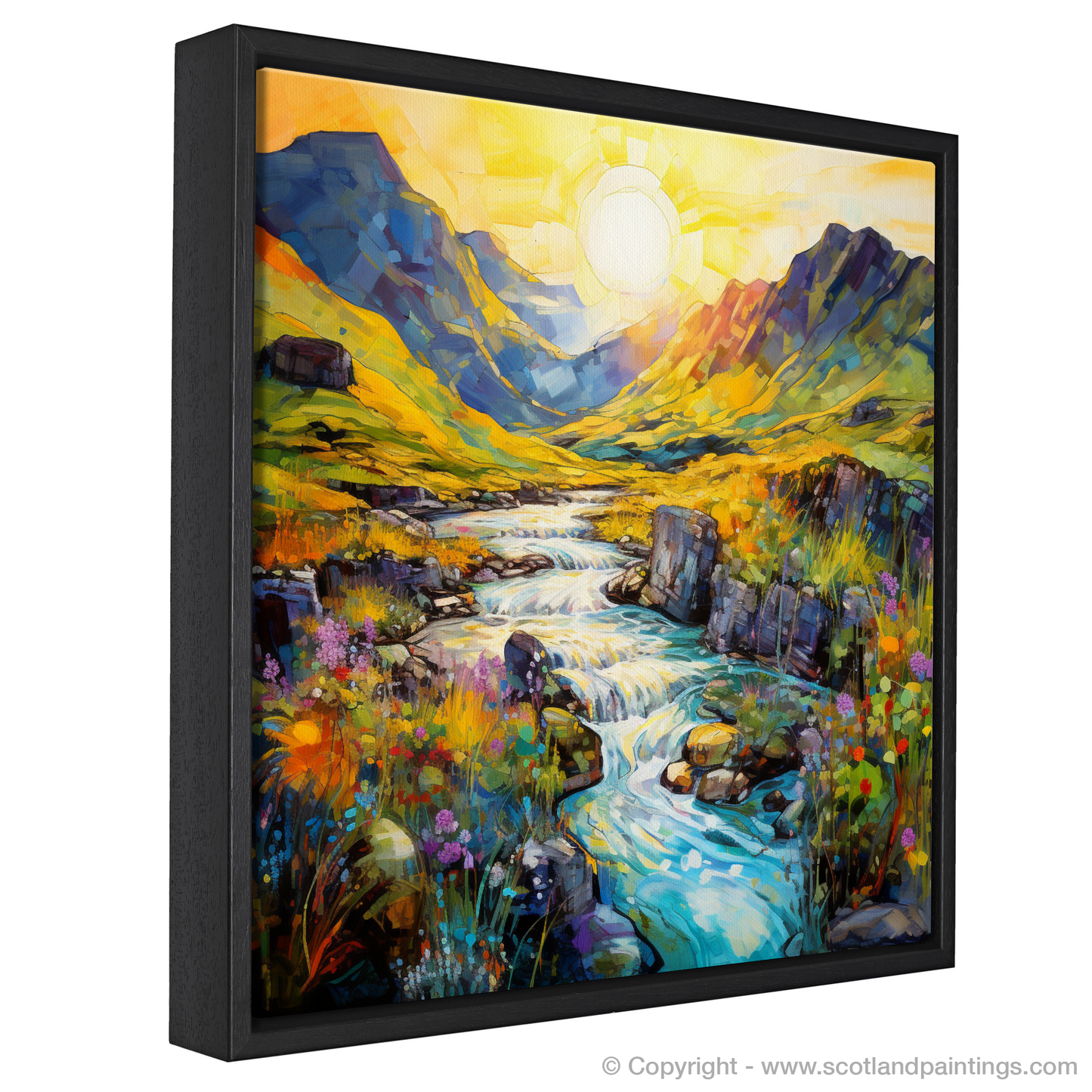 Captured in the enchanting light of a summer's golden hour, this exquisite print evokes the magical essence of the Isle of Skye's Fairy Pools. With brushstrokes that dance and blend into a mesmerising symphony of colour, this piece transports you to the heart of Scotland’s untamed beauty.