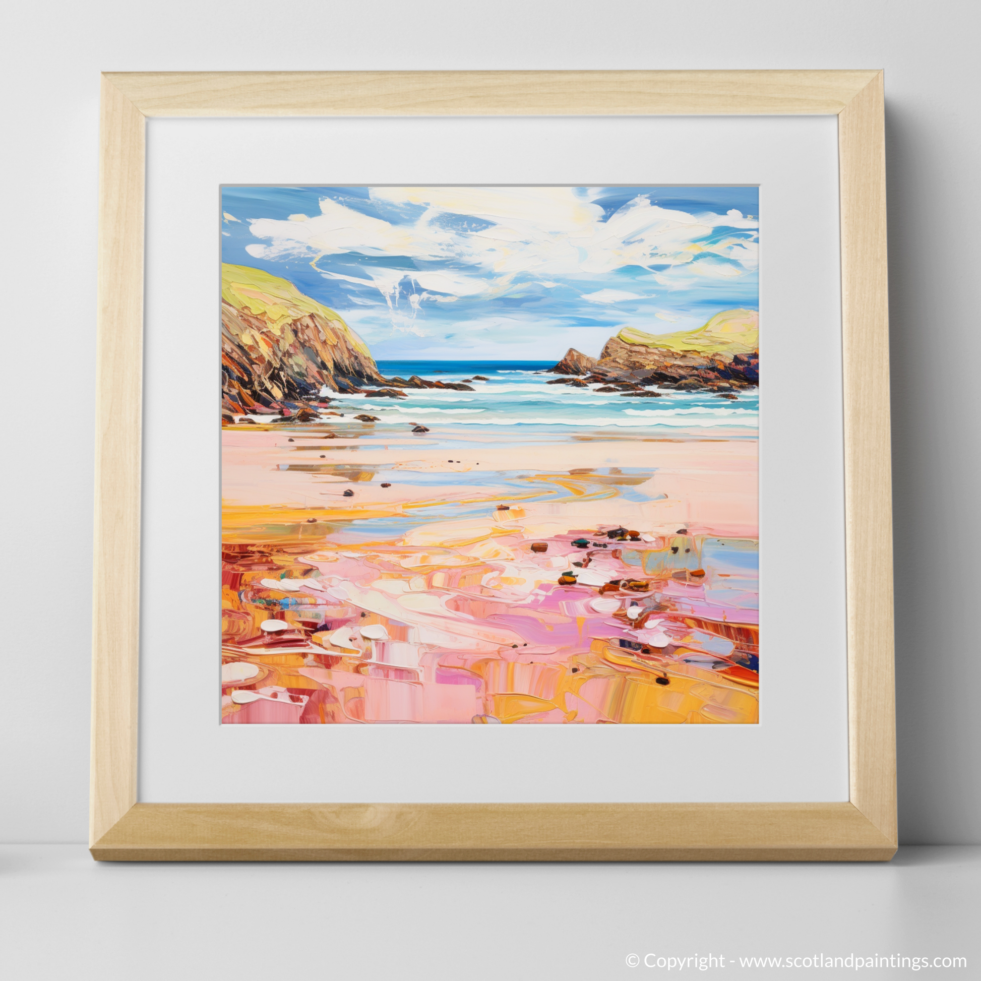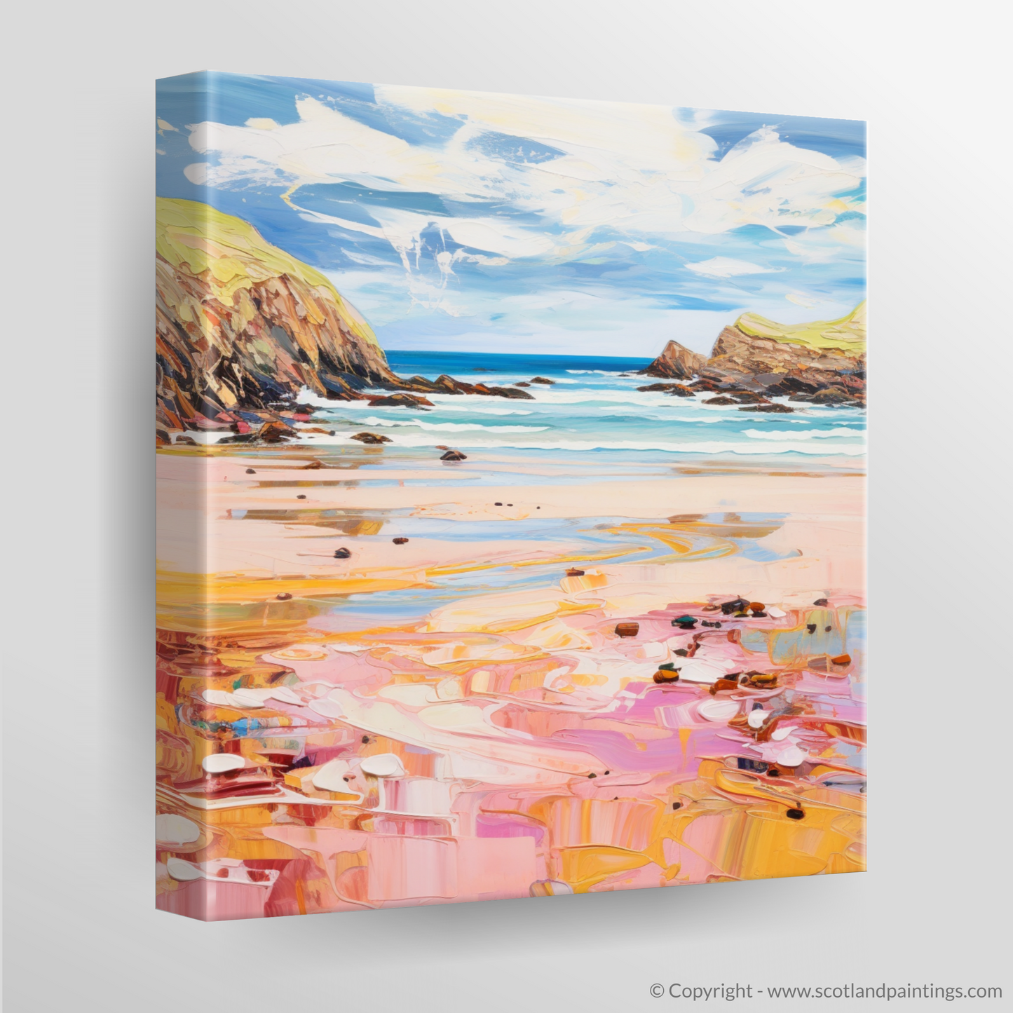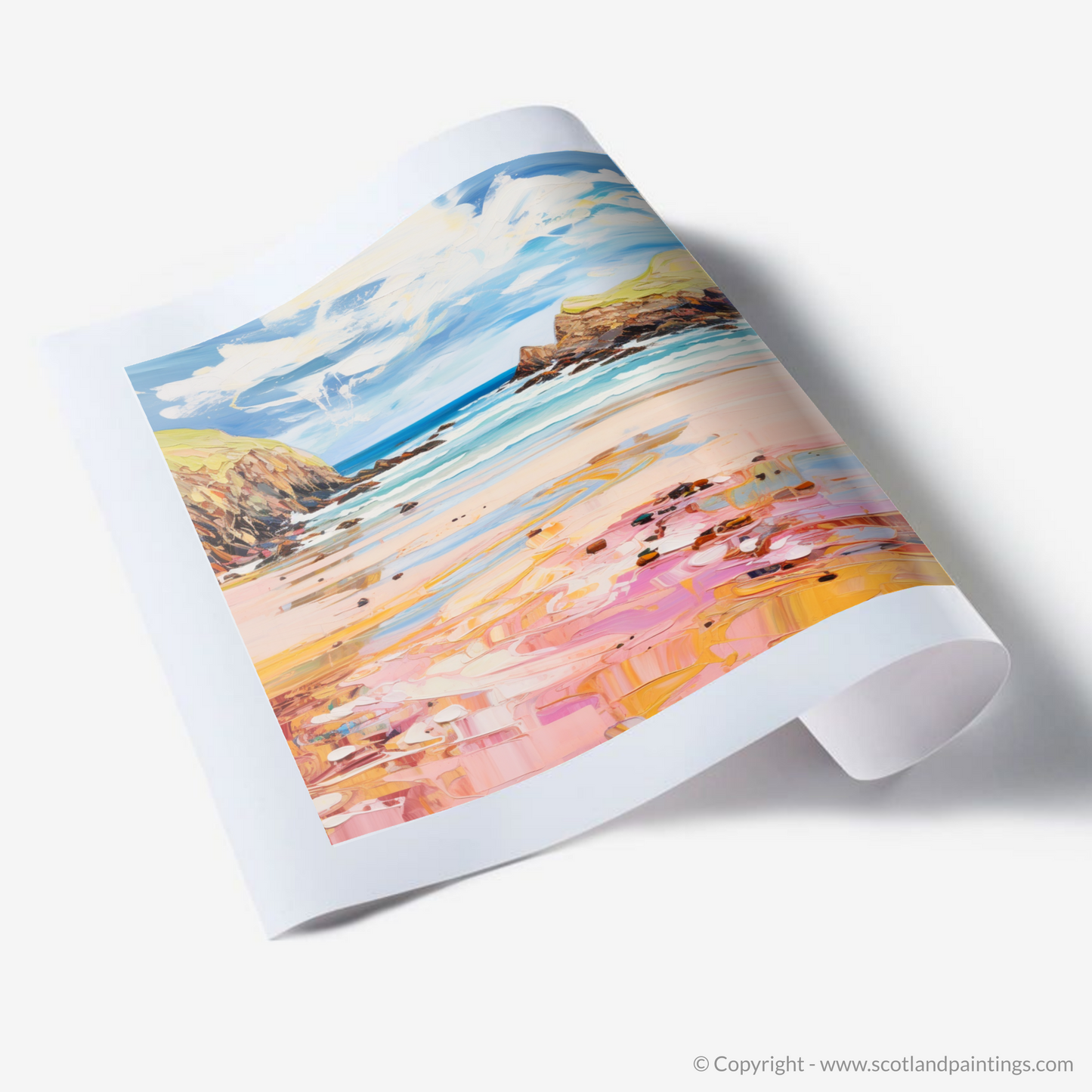 As your gaze falls upon this picture, you'll be transported to the serene shores of Scotland, where the golden sand glistens under the sun's gentle caress. The pink and peach undertones in the sand ripple across the canvas, creating a dreamlike reflection of the summer sky. Soft shades of blue and turquoise dance across the waters, illustrating the gentle ebb and flow of the tide against the rugged coastline.