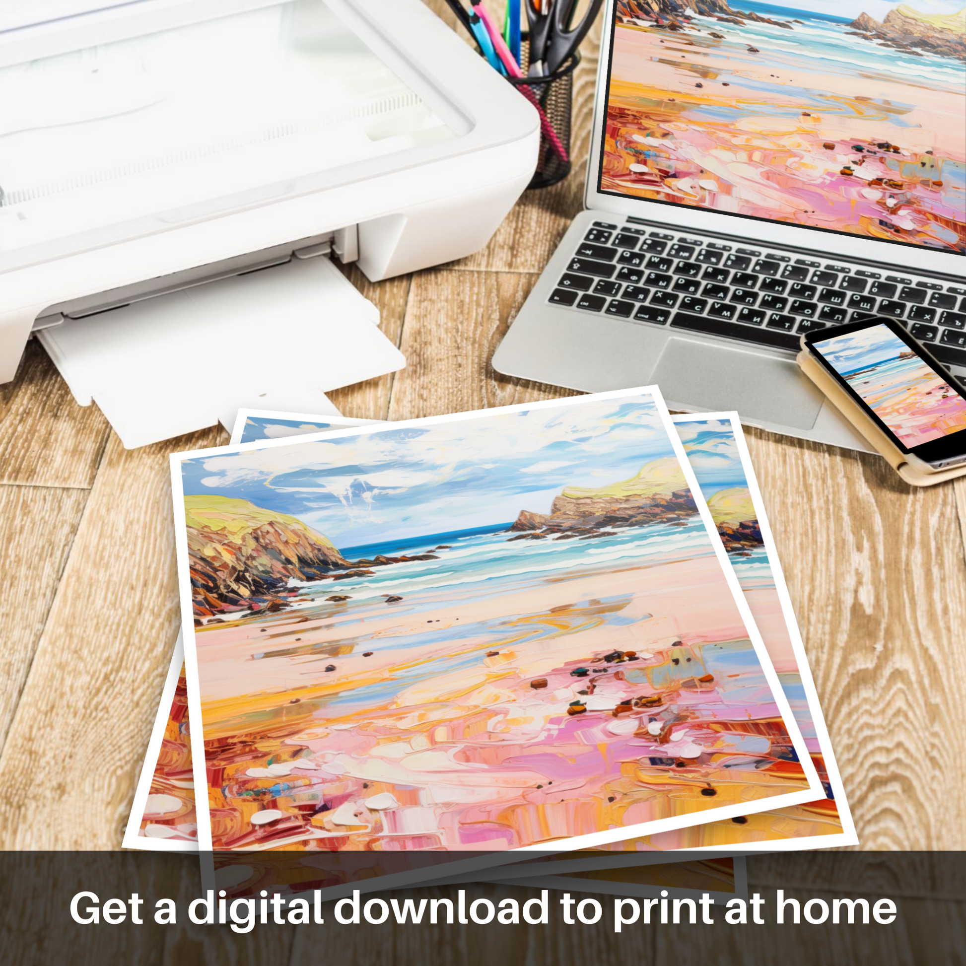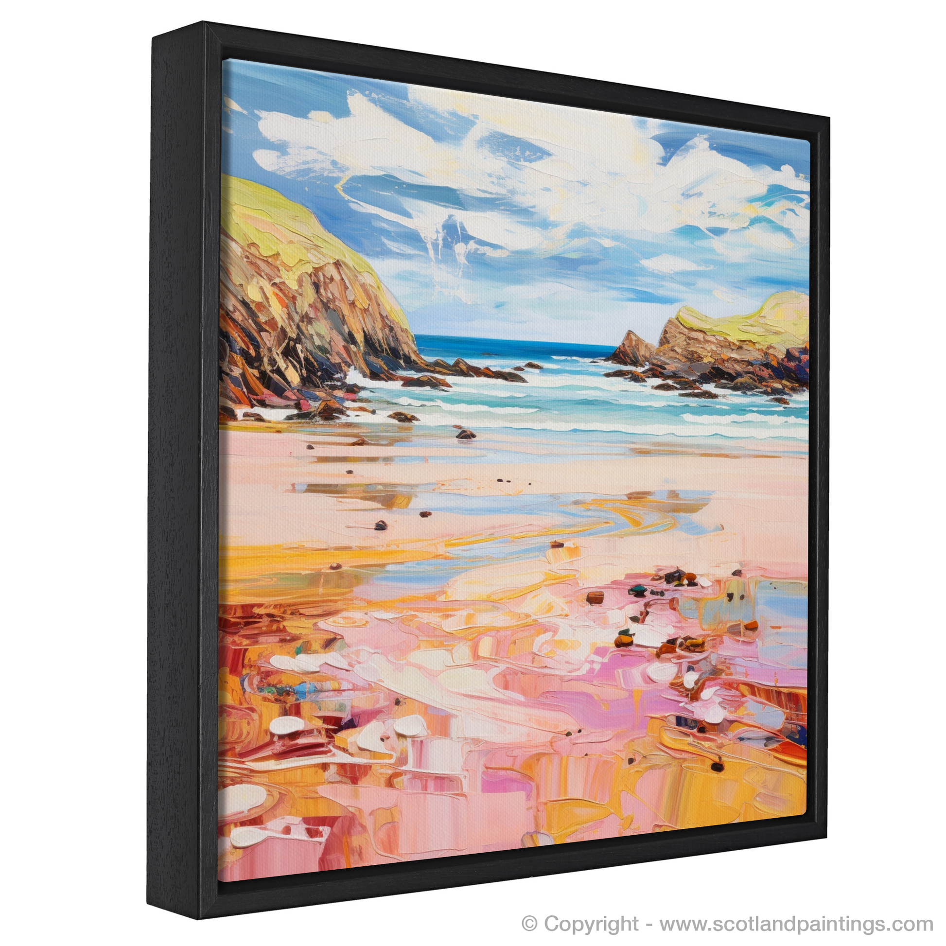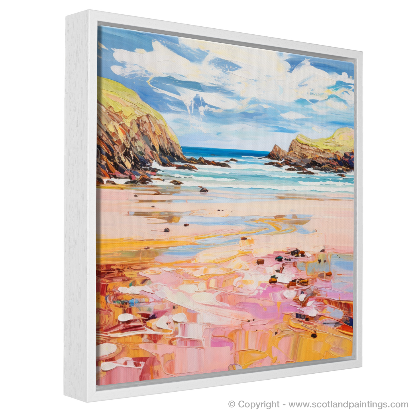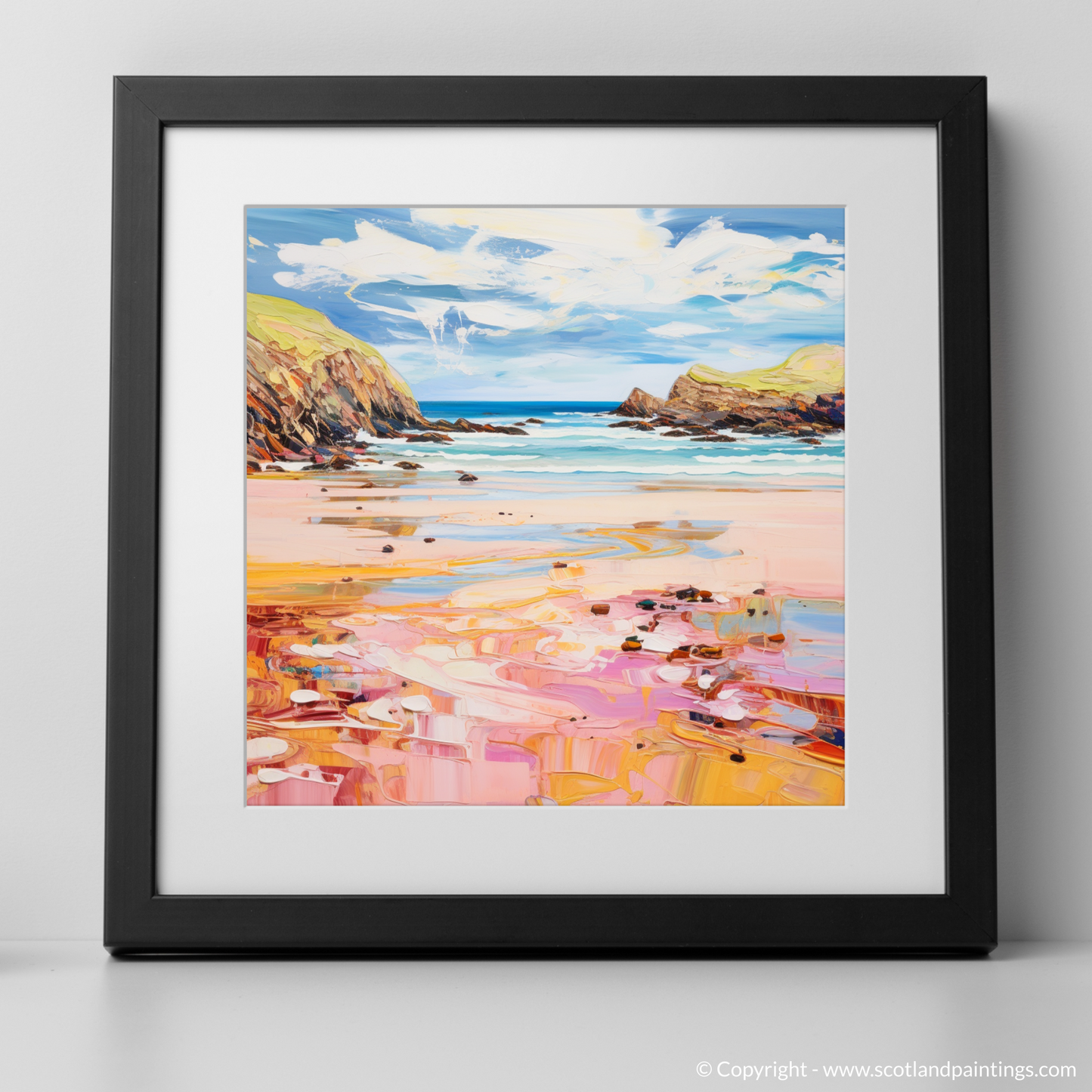 As your gaze falls upon this picture, you'll be transported to the serene shores of Scotland, where the golden sand glistens under the sun's gentle caress. The pink and peach undertones in the sand ripple across the canvas, creating a dreamlike reflection of the summer sky. Soft shades of blue and turquoise dance across the waters, illustrating the gentle ebb and flow of the tide against the rugged coastline.
