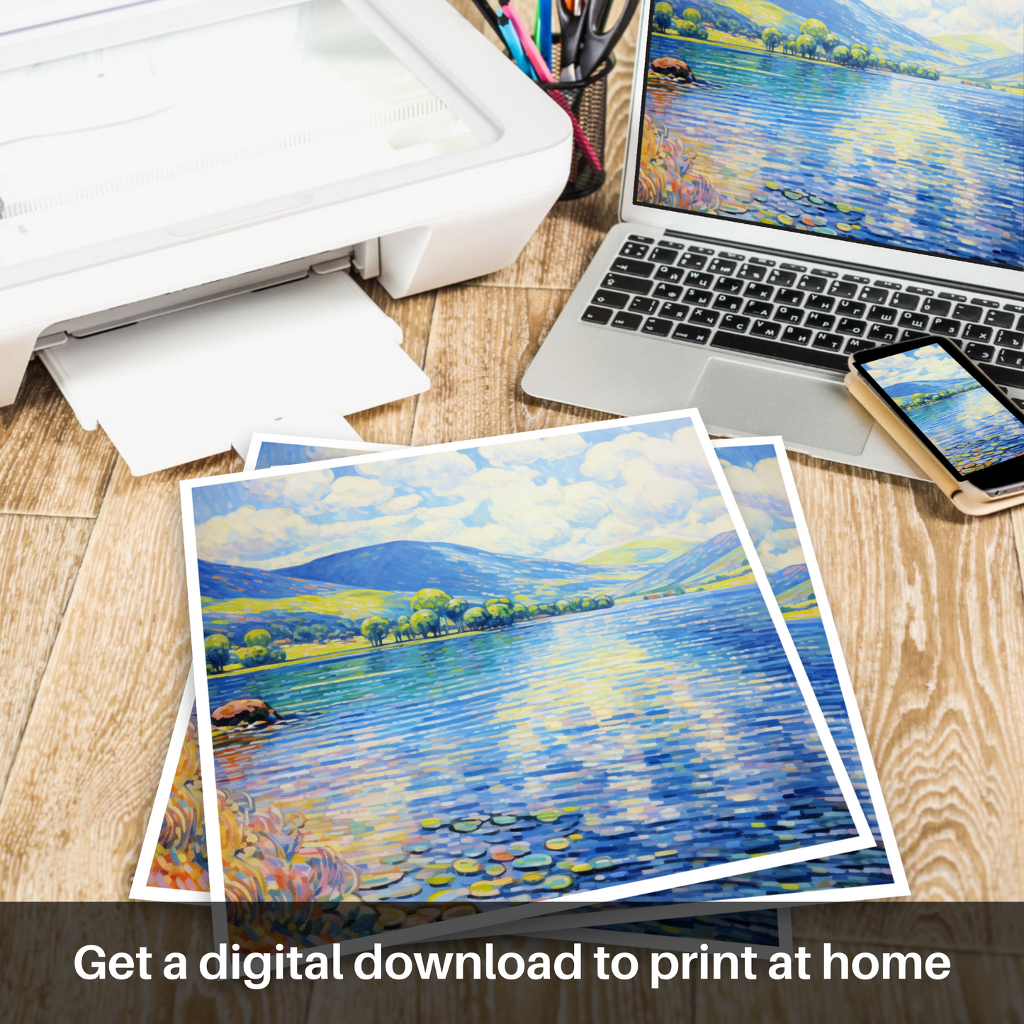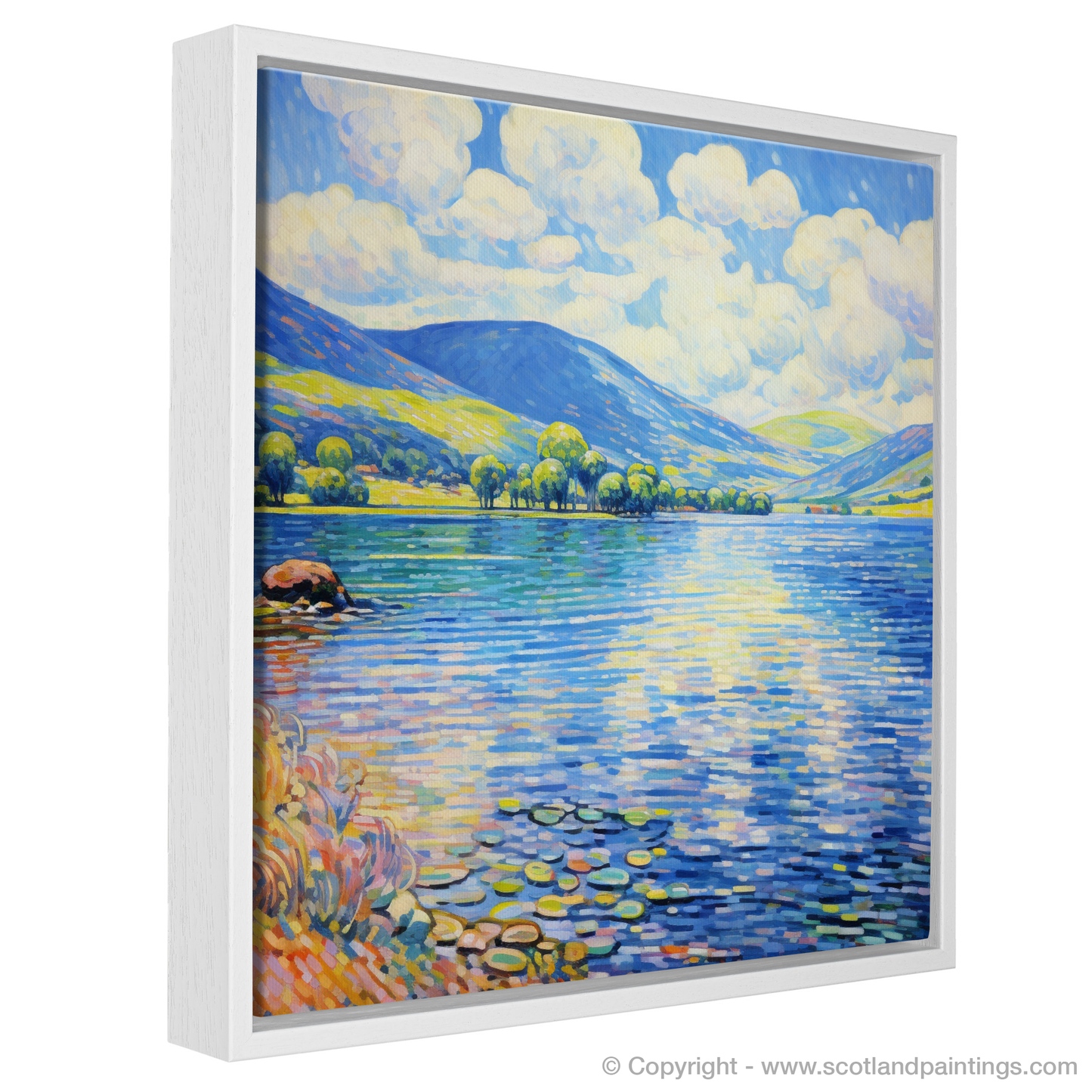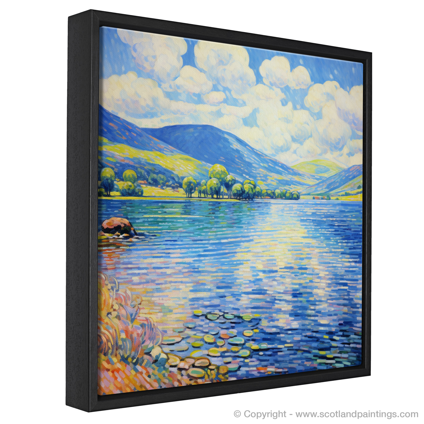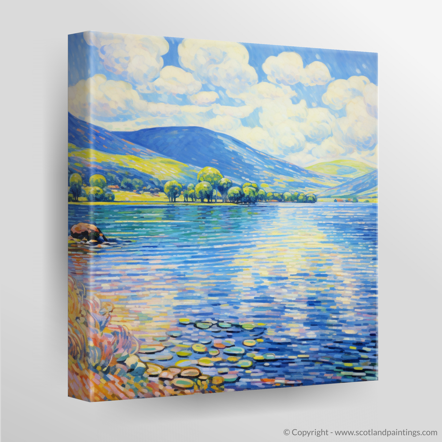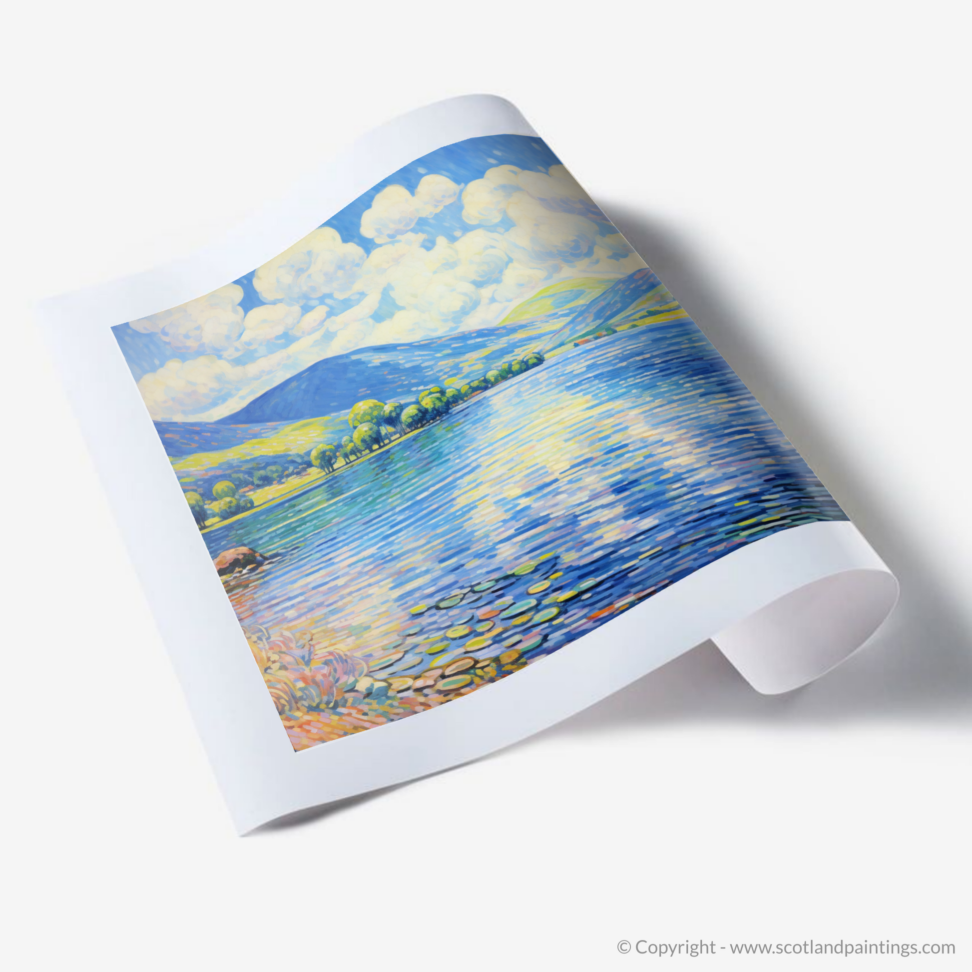 Capturing the serene elegance of Loch Tay during the vibrant summer months, this enchanting print invites the viewer to bask in the picturesque landscape of Perthshire. The artwork, brimming with the charm of Impressionism, displays a harmonious symphony of bright, dappling light and colour.