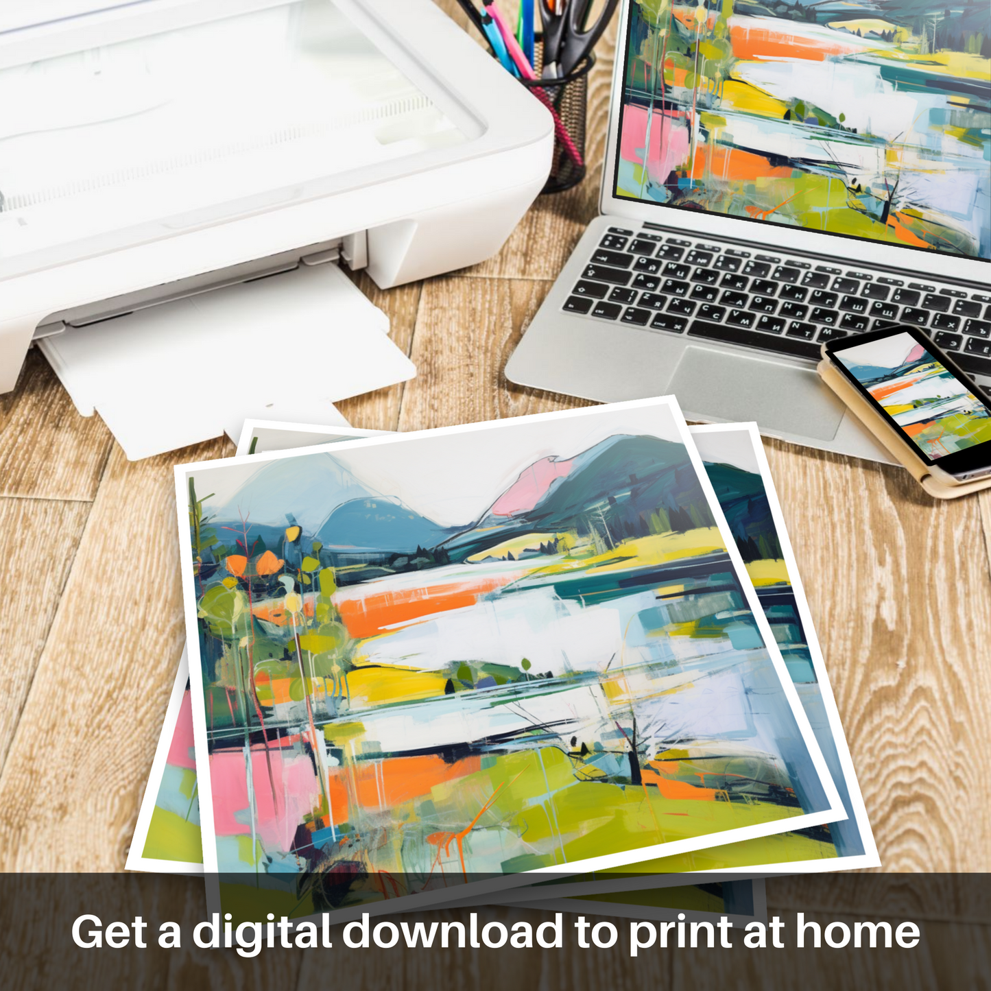 Visual elements suggest reflections in the loch's glassy surface, hinting at a world as rich below the waterline as it is above. Splashes of colour give the impression of wildflowers dotting the terrain, and thin, energetic lines perhaps allude to the vegetation and wildlife that thrive in this lush, verdant environment.