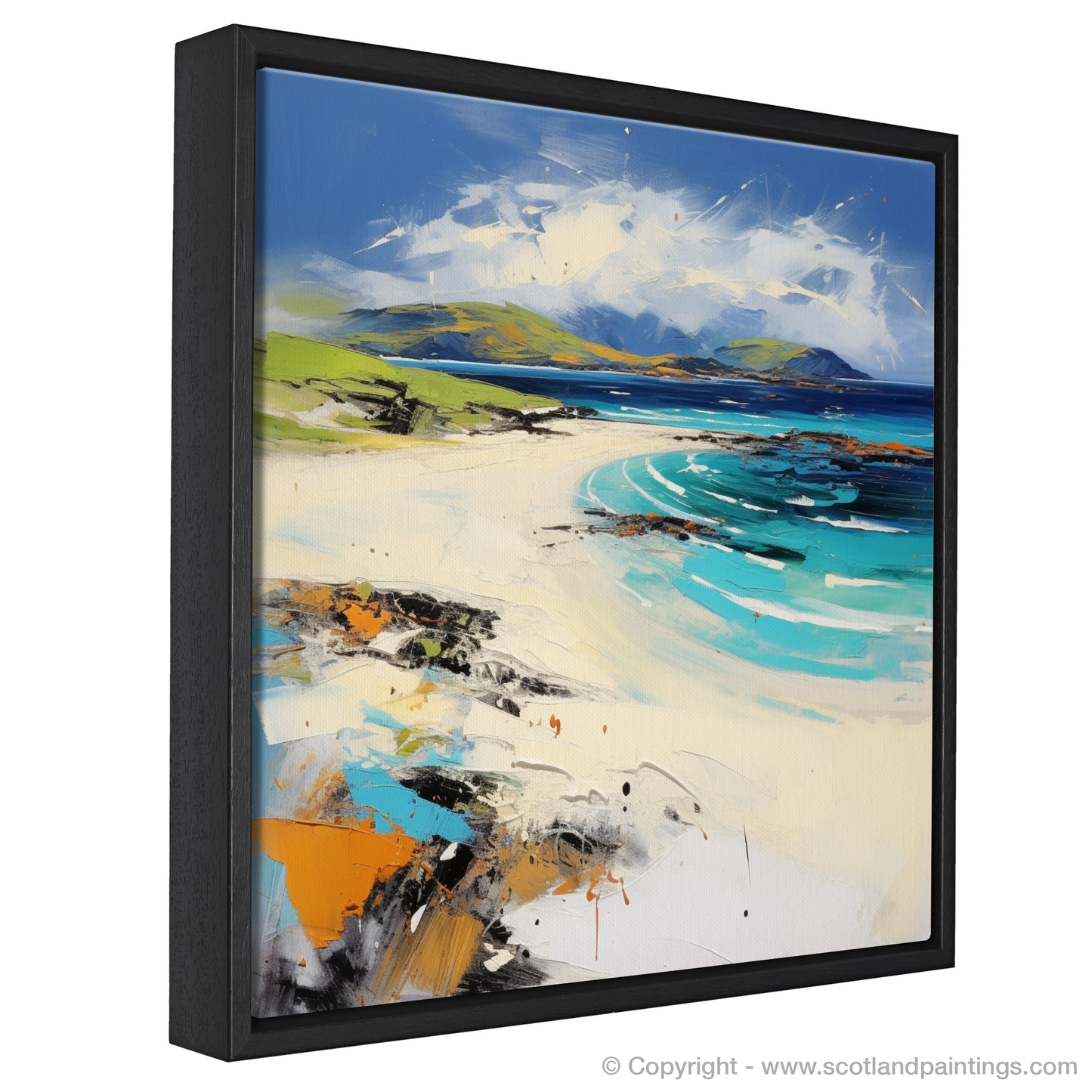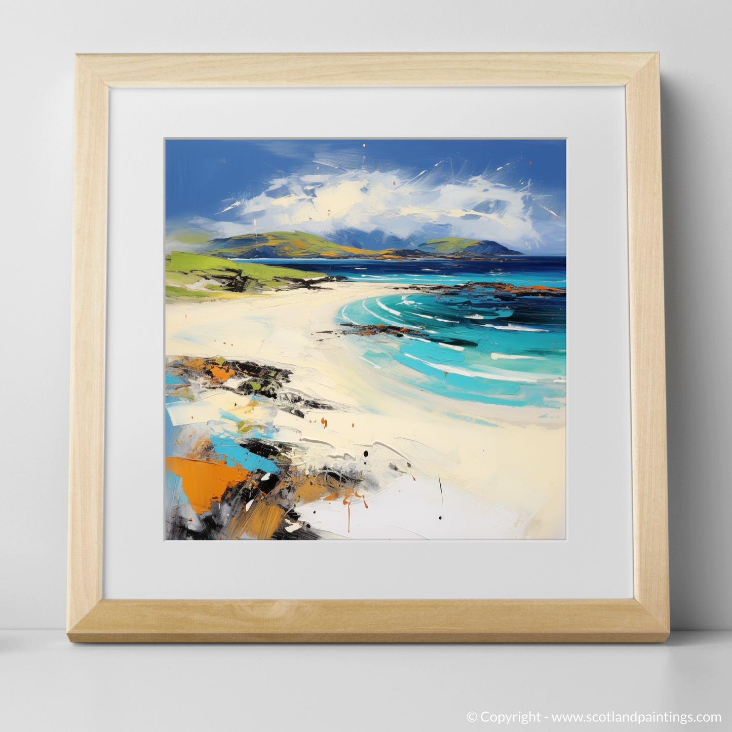 This evocative print captures the essence of Scarista Beach on the Isle of Harris, bringing the vibrancy of a Scottish summer to life through abstract expression. The composition presents a dynamic interplay of colour and form, where broad strokes of electric blues and turquoises evoke the swirling tides and crystalline waters. Wisps of white and pale hues suggest the softness of sunlit sand, while darker, textured patches mirror the rugged, seaweed-draped rocks that punctuate the shoreline.