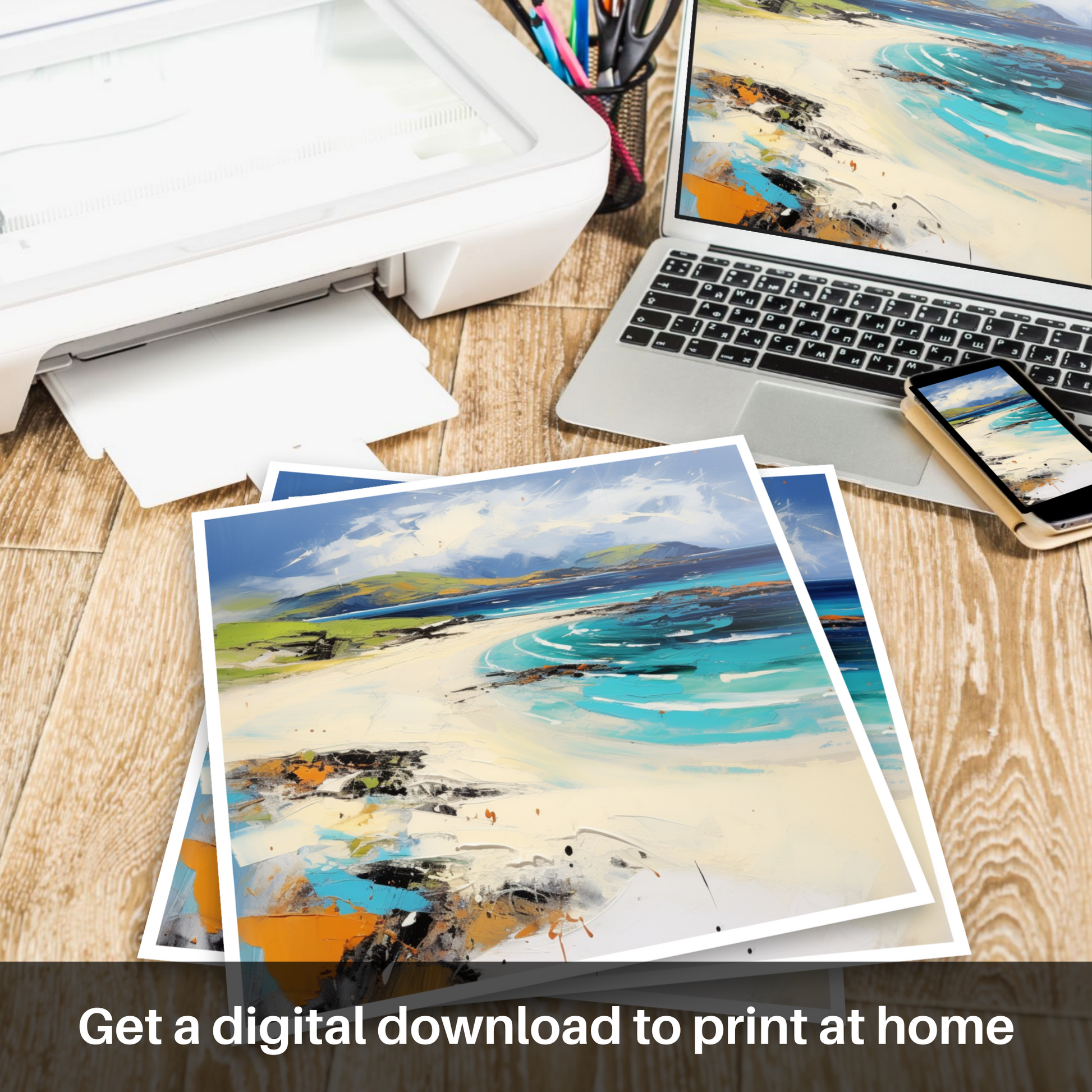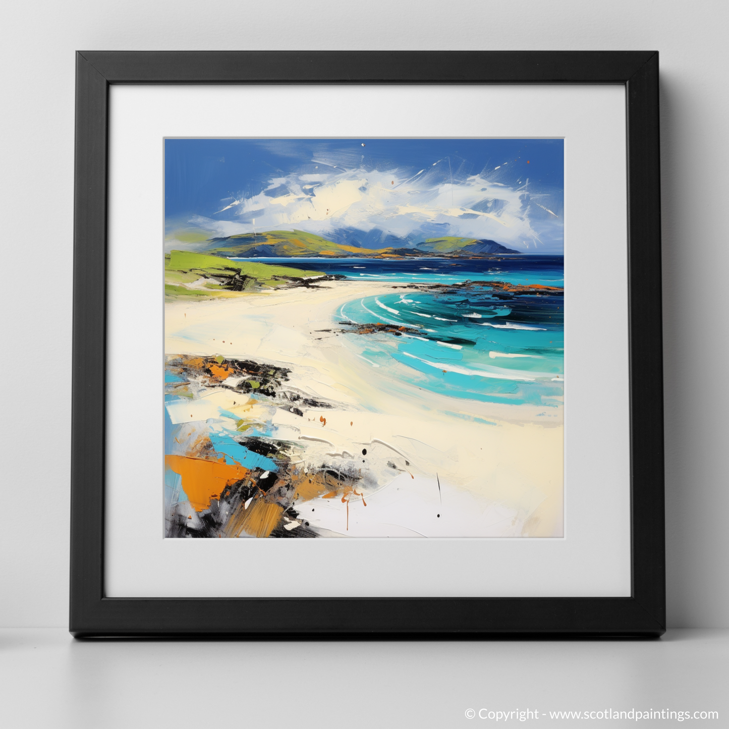 This print is a symphony of abstract forms, with each dab, line, and smear working in concert to convey the untamed beauty of the Hebridean landscape. It's a piece that doesn't just represent a location but rather transports the viewer through a sensory experience of colour, movement, and the sheer force of nature. Whether as a focal point or a complement to a curated space, this print is poised to stir the imagination and inspire a connection to the wild Scottish coasts.