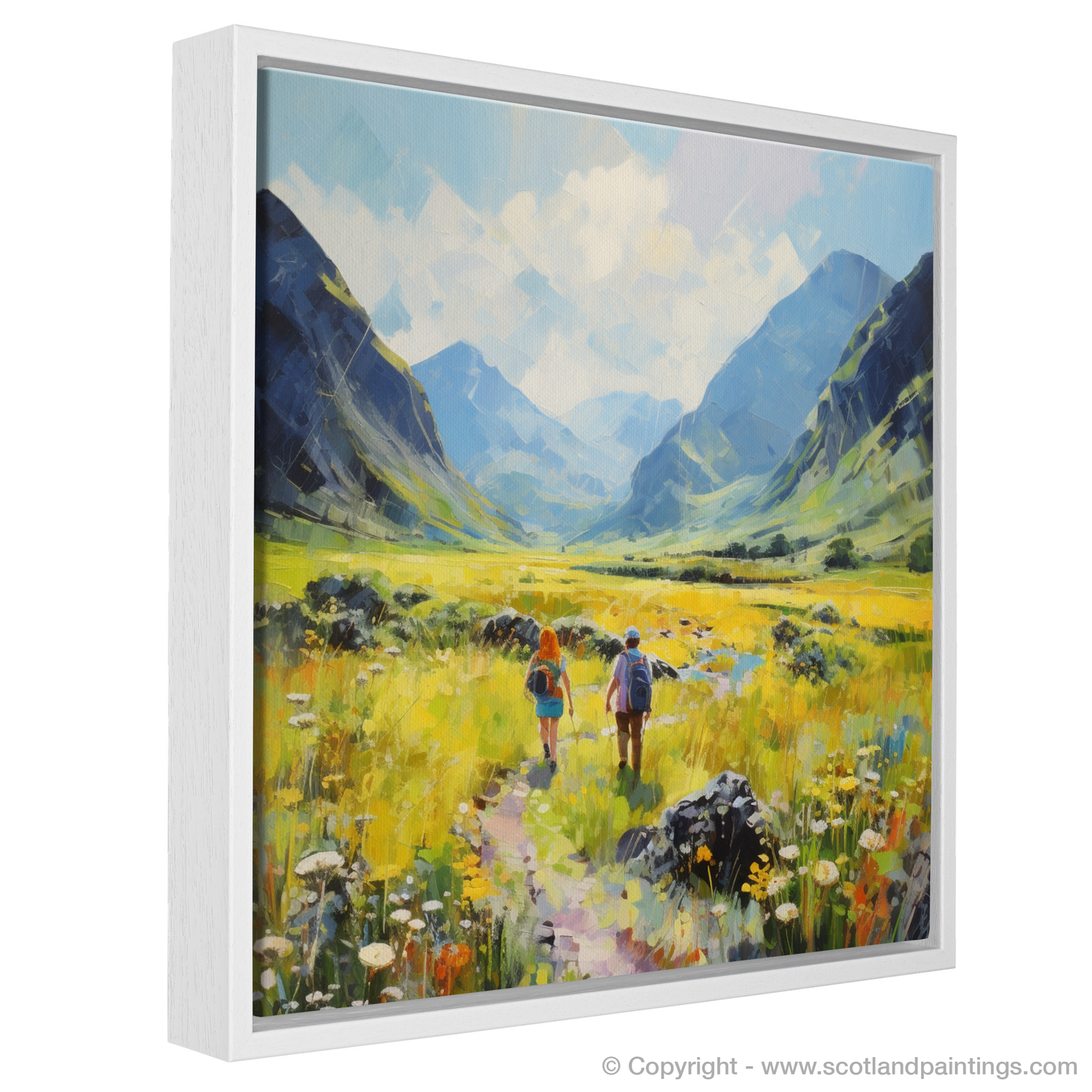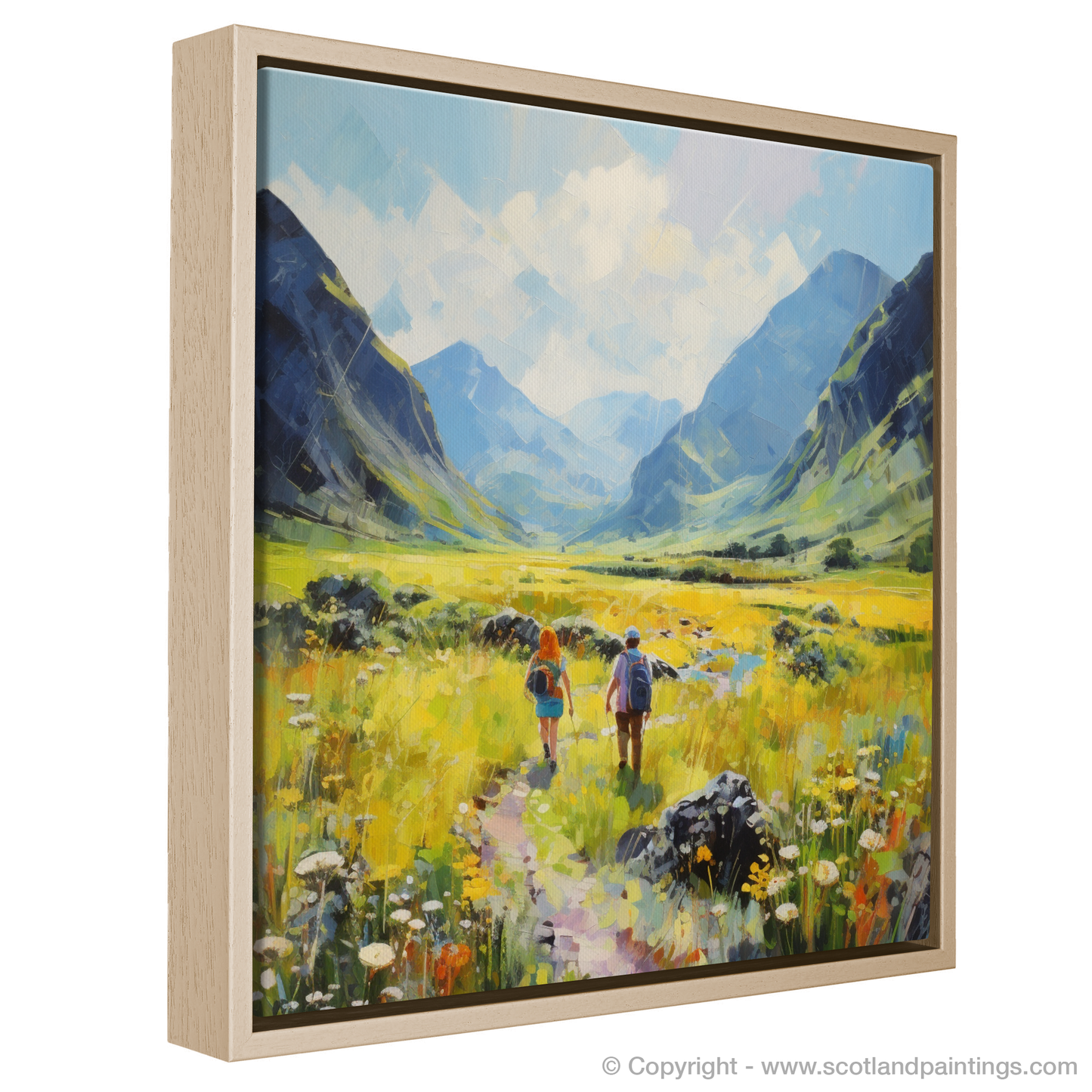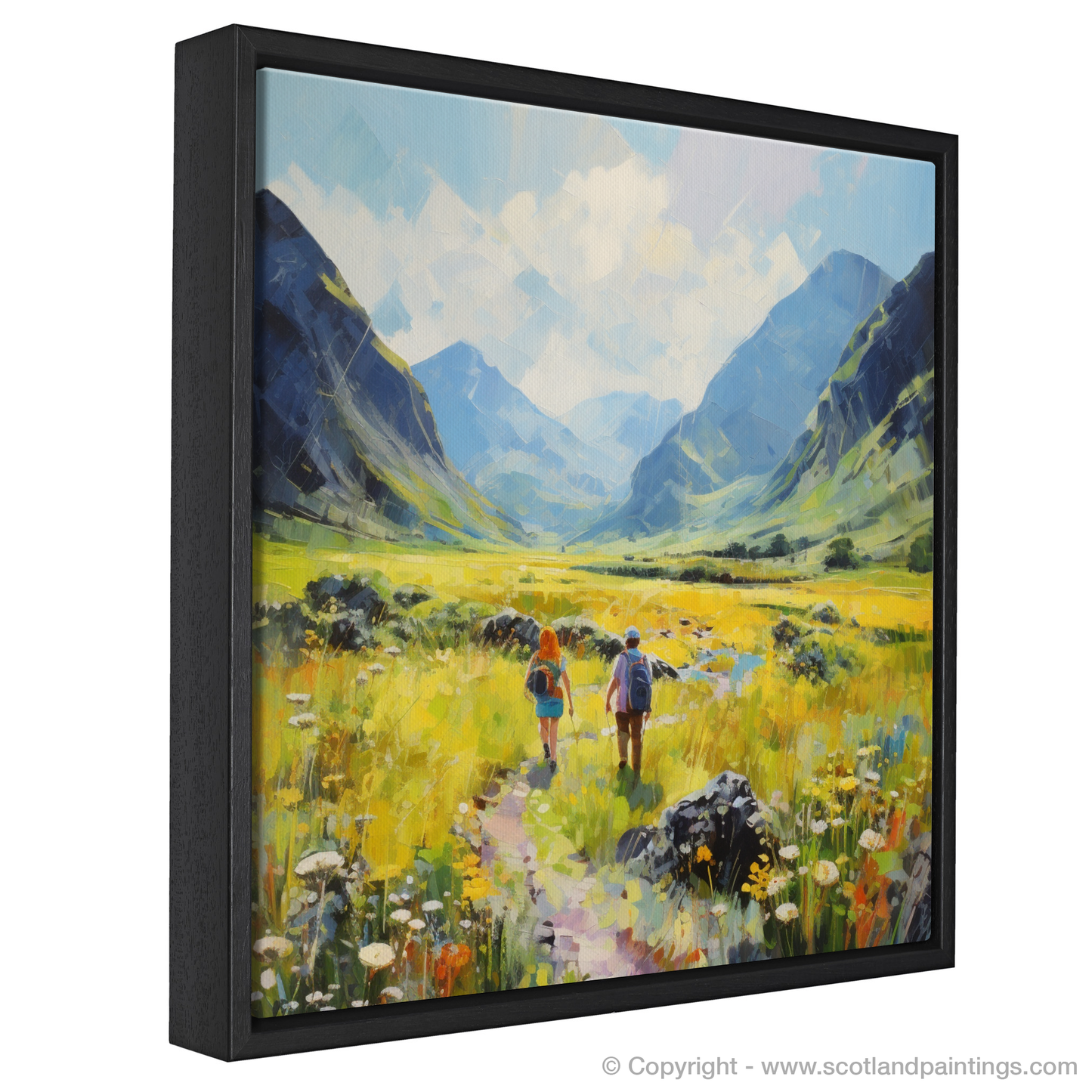 Capturing the breathtaking landscapes of Scotland, this exquisite piece brings the serene beauty of Glencoe to your living space. The print features two figures mid-stride on a meandering path through verdant fields. Their journey seems to echo the timeless allure of the Highlands, as they are flanked by imposing mountains whose towering presence is softened by the summer sun.