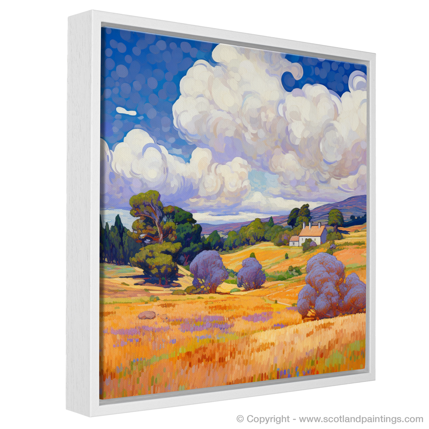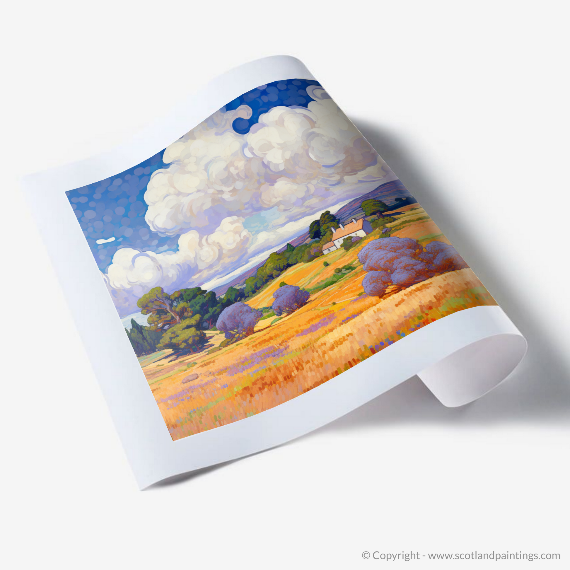 Capturing the essence of a Scottish summer, this exquisite print transports viewers to the enchanting rural landscapes of Glenlivet, Moray. The artwork exudes the warmth of the season, depicting a golden-hued countryside under a majestic sky. Swathes of amber and ochre fields stretch across the canvas, punctuated by the soft purples and blues of wildflowers that dance in the breeze.