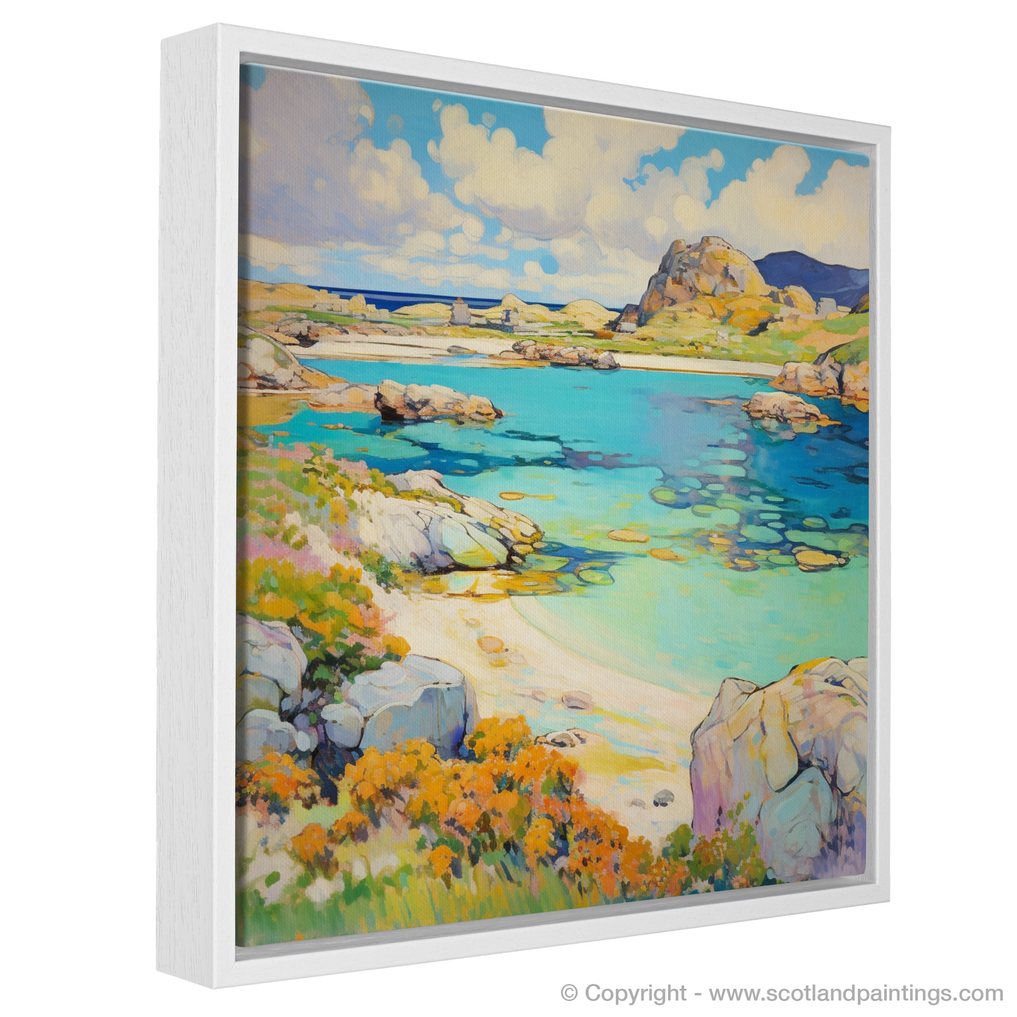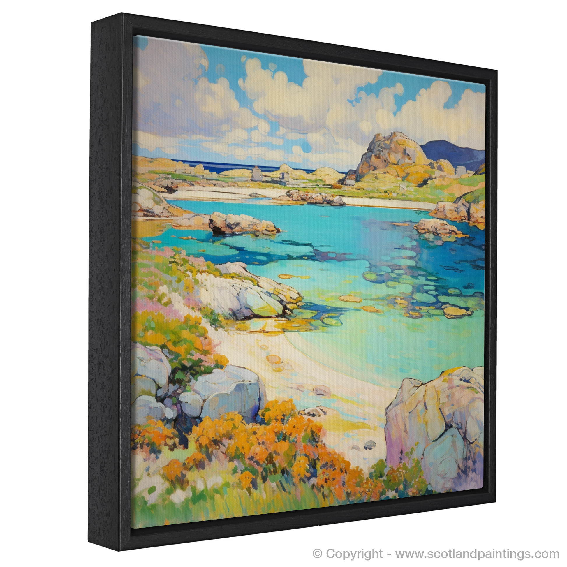 Capturing the essence of Achmelvich Bay's quaint allure during the luscious Scottish summer, this exquisite print evokes the serenity and untouched beauty of the Highlands. As you let your eyes wander over the canvas, you are greeted by the harmonious blend of nature’s palette, where azure skies kiss the horizon and the gentle warmth of the sun bathes the scenery in a glorious light.