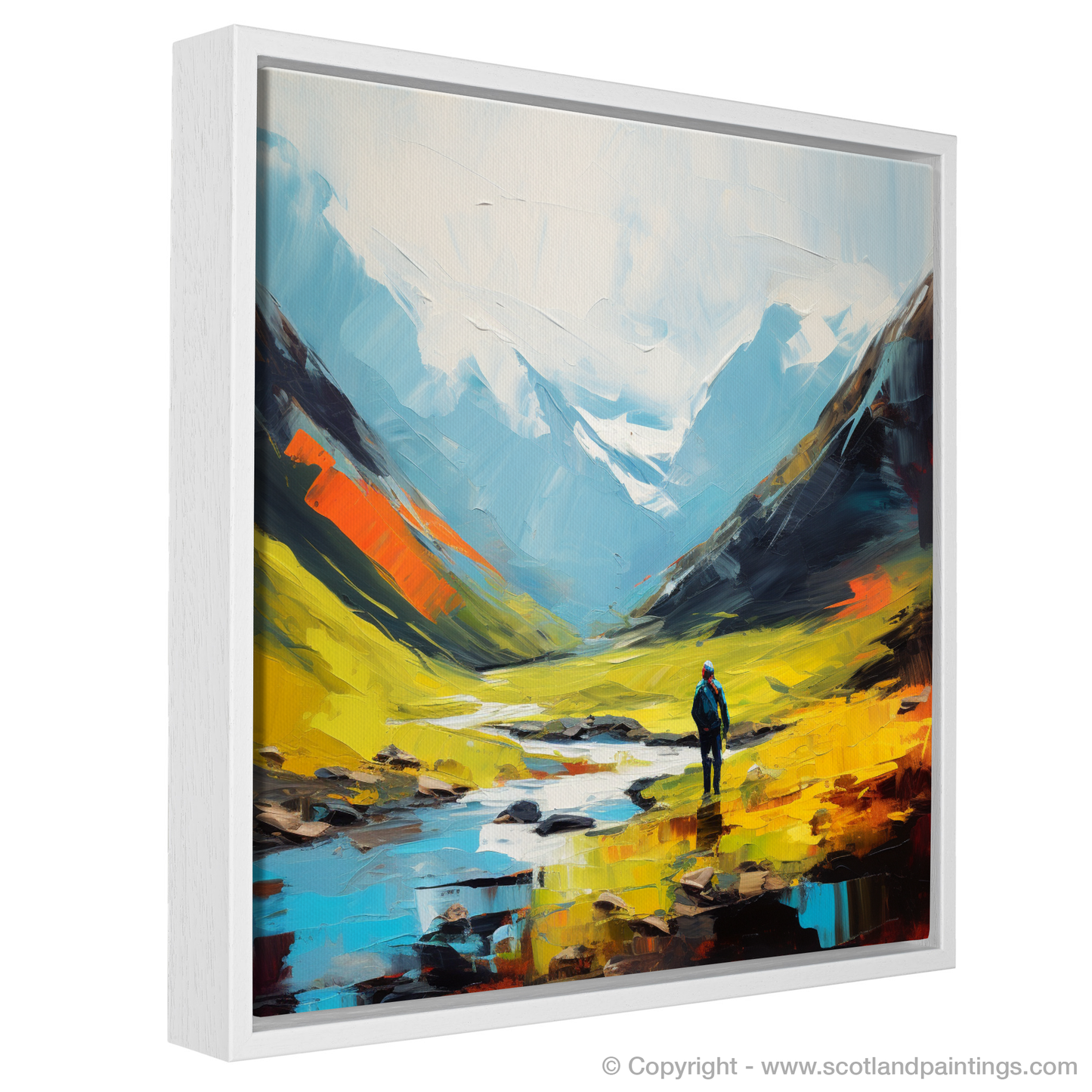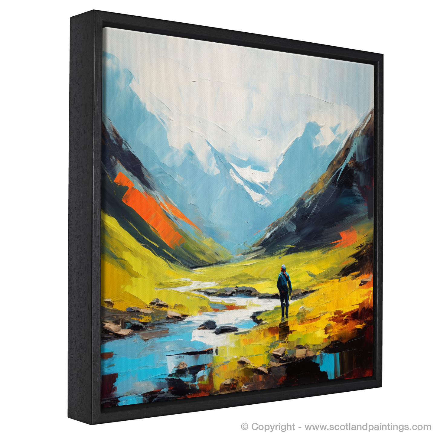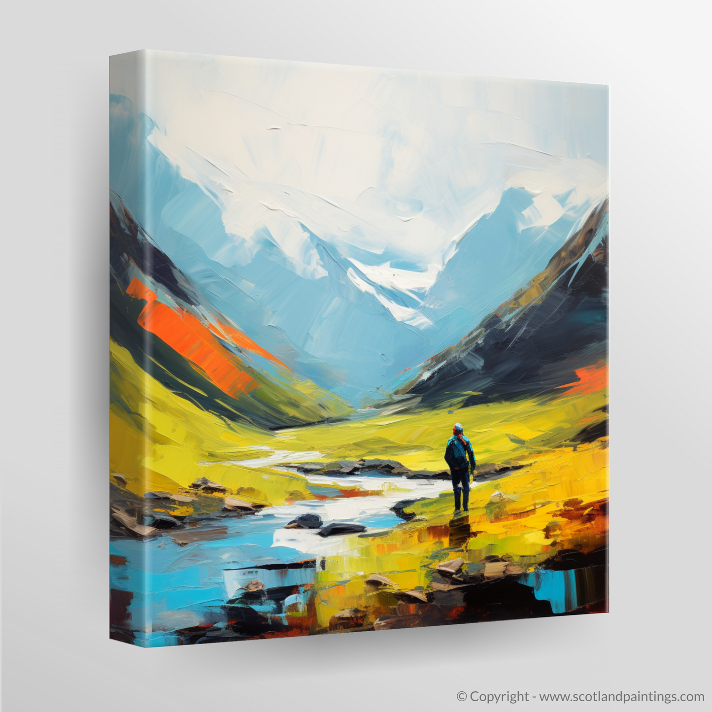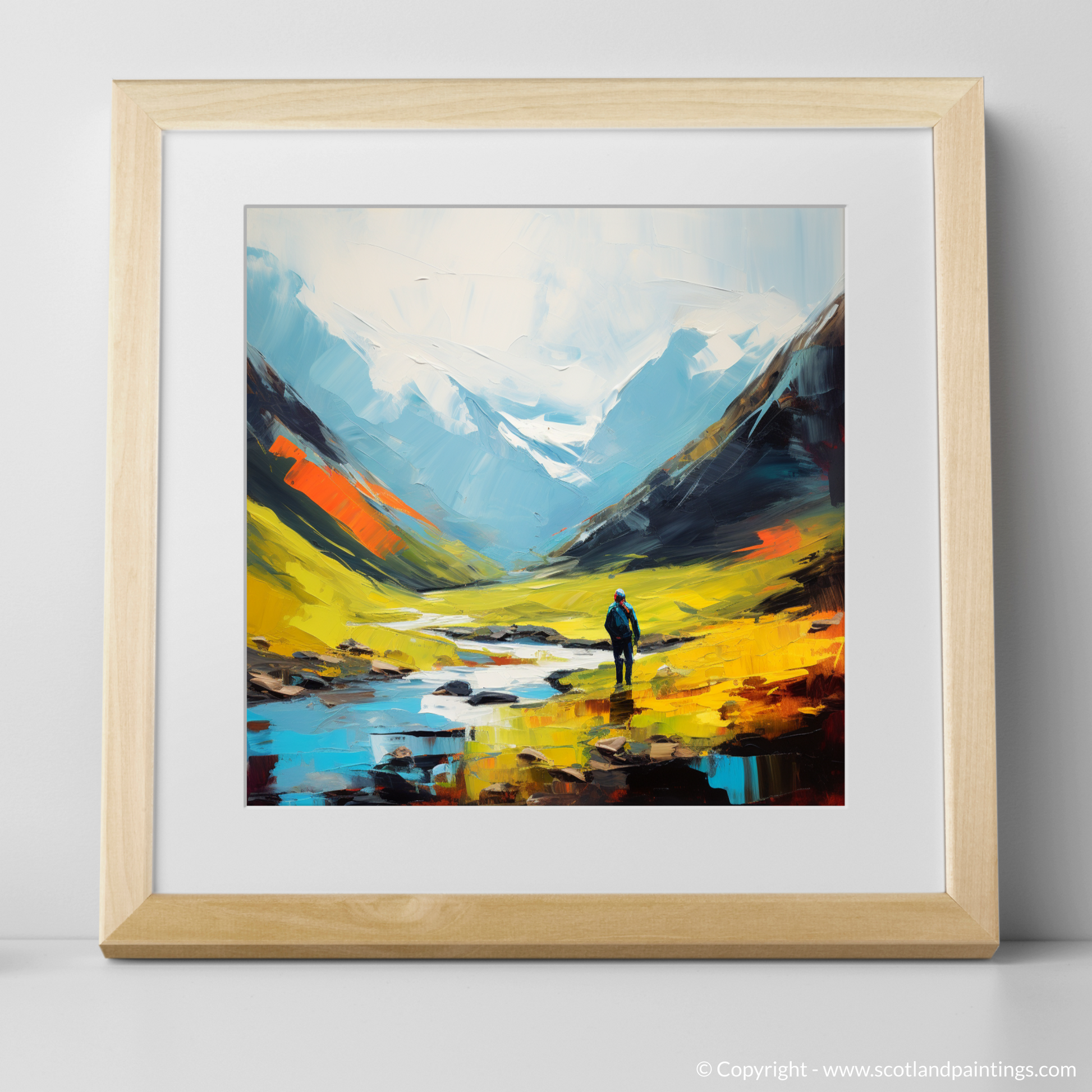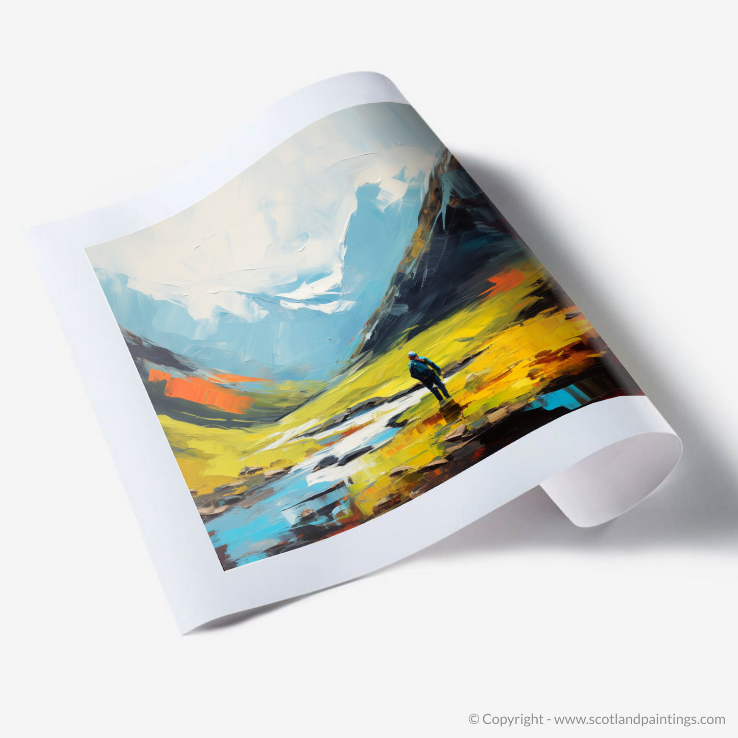This print is a symphony of colour and texture, offering a tactile sense of Glencoe's enigmatic aura. The viewer is invited to step into the hiker's boots, to breathe the crisp Highland air, and to wander into an abstract landscape where every glance holds a new discovery, and every moment is suspended in the serene beauty of Scotland in summer.