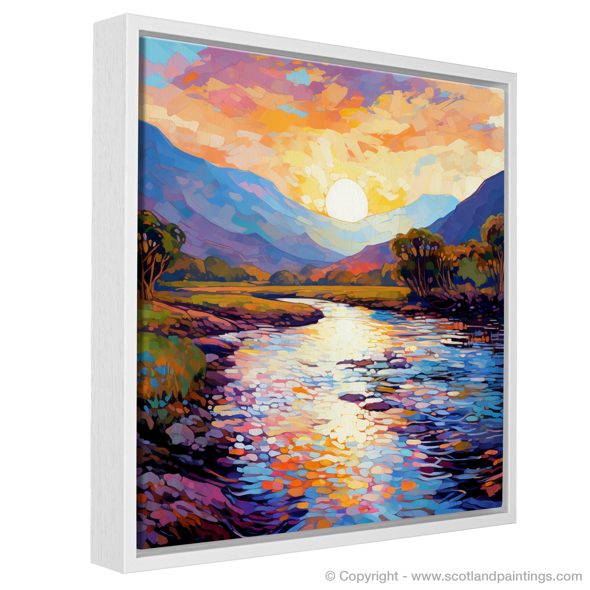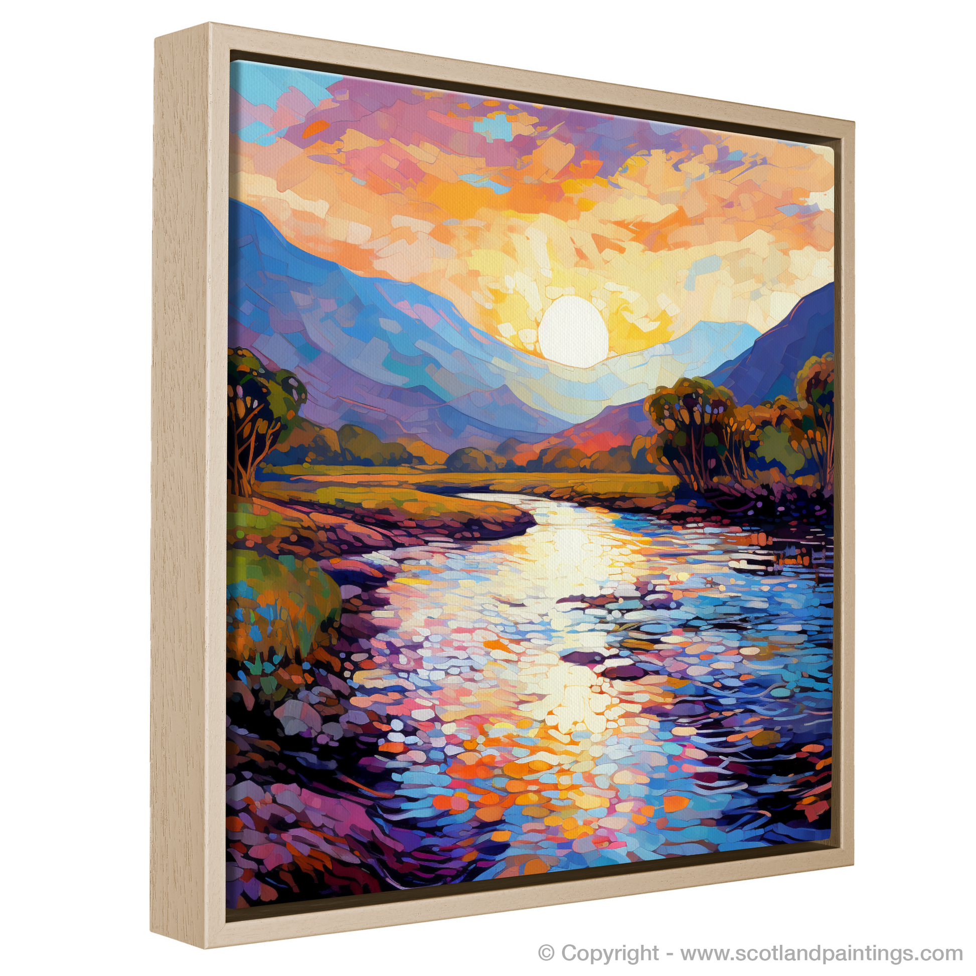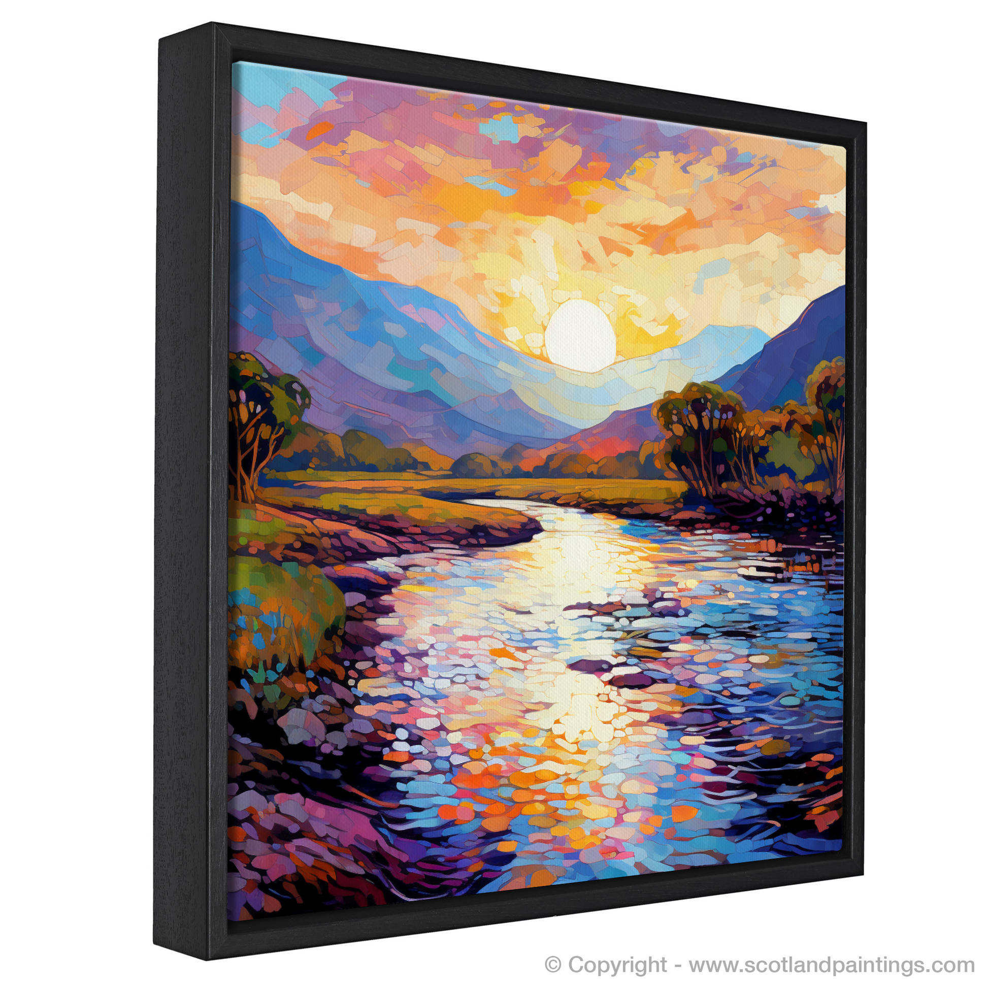 Immerse yourself in the vibrant essence of the Highland summer with this exquisite impressionist rendering of the River Spean. Bask in the beauty of the sun-kissed sky, depicted in a symphony of warm oranges, pinks, and lilacs, gracefully transitioning into the cool blues and purples that embrace the distant rolling hills. The masterful brushstrokes capture the interplay between light and shadow, crafting a dynamic and inviting scene that beckons the viewer to lose themselves in the moment.
