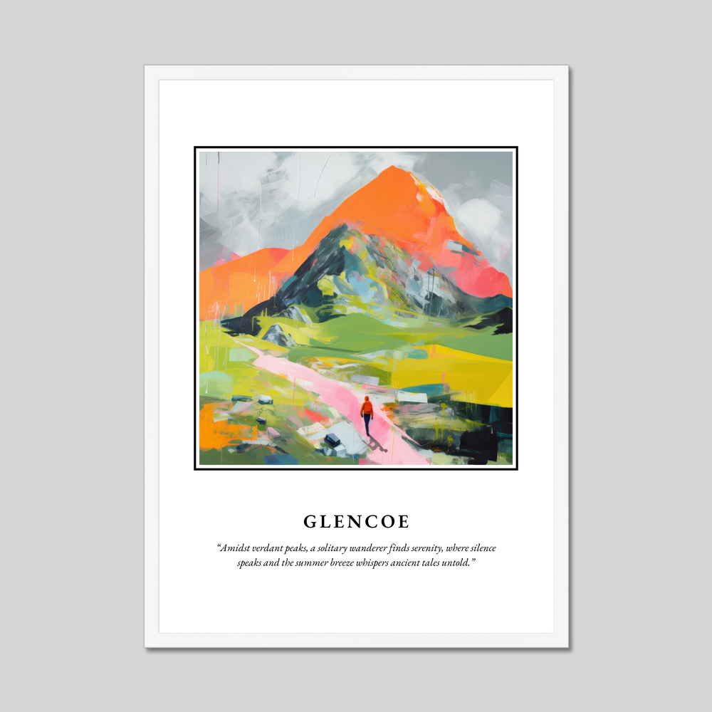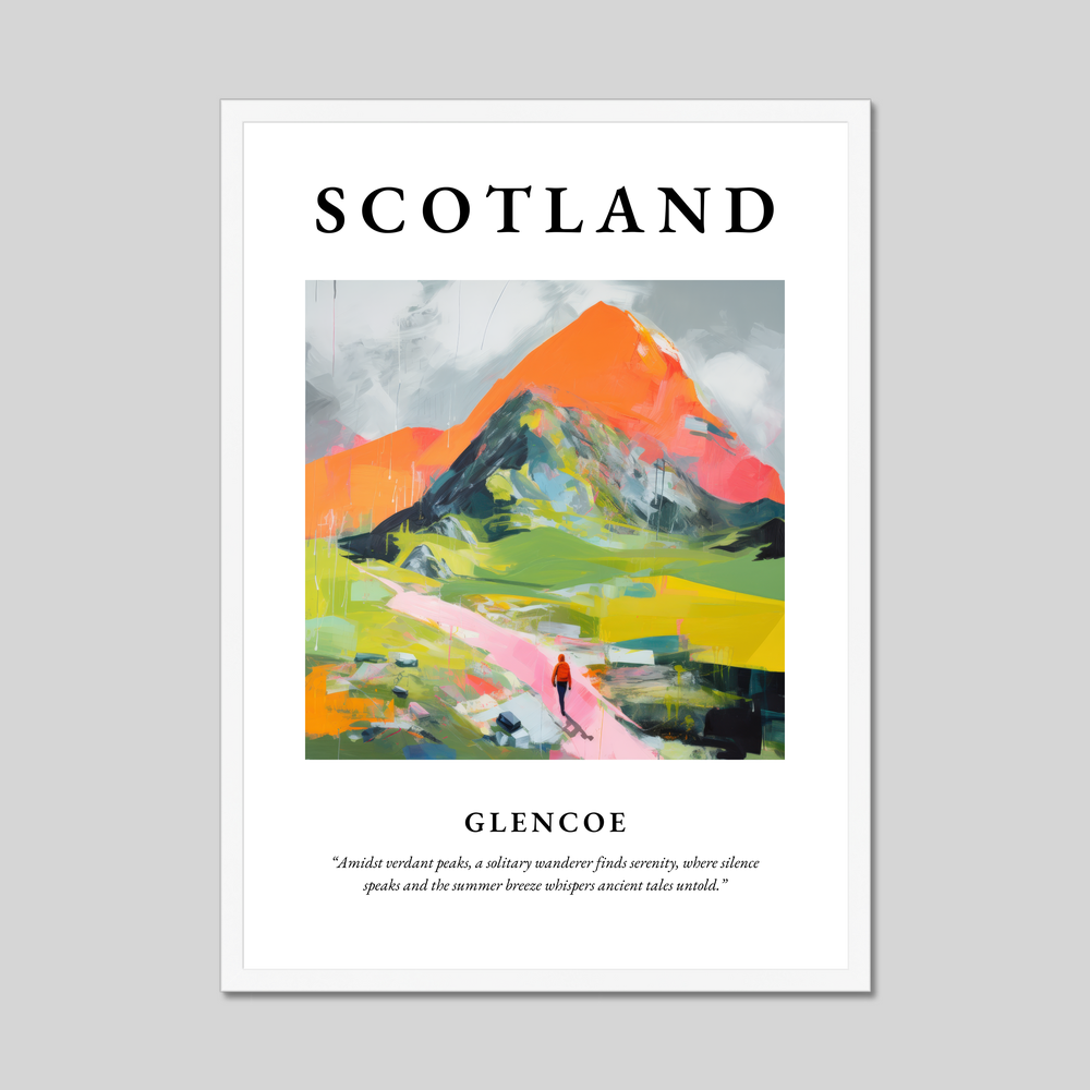 The poster captures the essence of Glencoe with its modern artistic style—a vibrant tableau of verdant peaks under a sky brushed with an array of bold, contemporary hues. This modern interpretation highlights the dynamic contrasts and lush textures of the Scottish Highlands, drawing you into a serene, almost otherworldly realm.