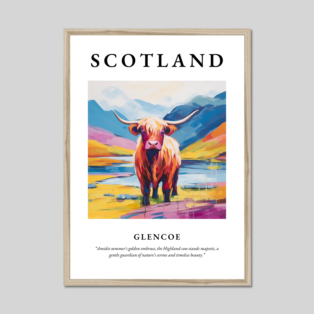 At the top, the word “SCOTLAND” demands attention in bold lettering, setting the stage for the breathtaking scene below. The abstract painting captures the essence of Glencoe—its dramatic peaks and tranquil landscapes brought to life with rich, vibrant colours and expressive brushstrokes. In the centre, a Highland cow stands regally, embodying the serenity and majesty of its timeless surroundings. Below, the evocative quote, “Amidst summer's golden embrace, the Highland cow stands majestic, a gentle guardian of nature's serene and timeless beauty,” further immerses you in the tranquil beauty of the Highlands.