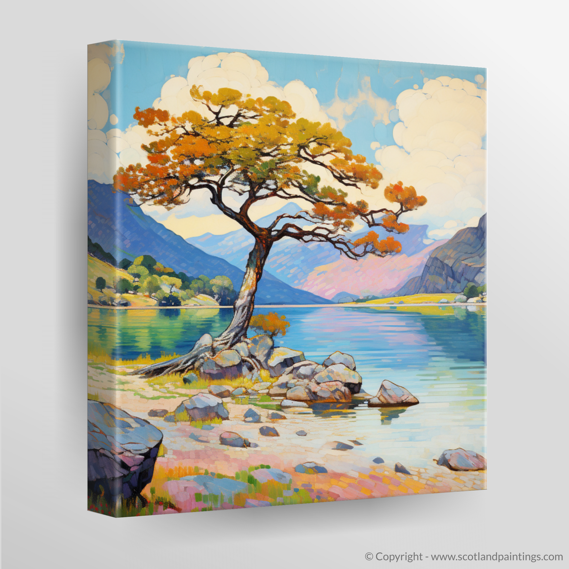 At the forefront, a majestic pine tree, its foliage a symphony of fiery oranges and mellow yellows, leans gracefully over the tranquil loch. This sentinel of time, with its spreading branches and sturdy trunk, seems to watch over the still waters, reflecting the changing sky. Tucked around its base, a collection of stones nestles, as if cradles of history, amidst the shore's gentle embrace.