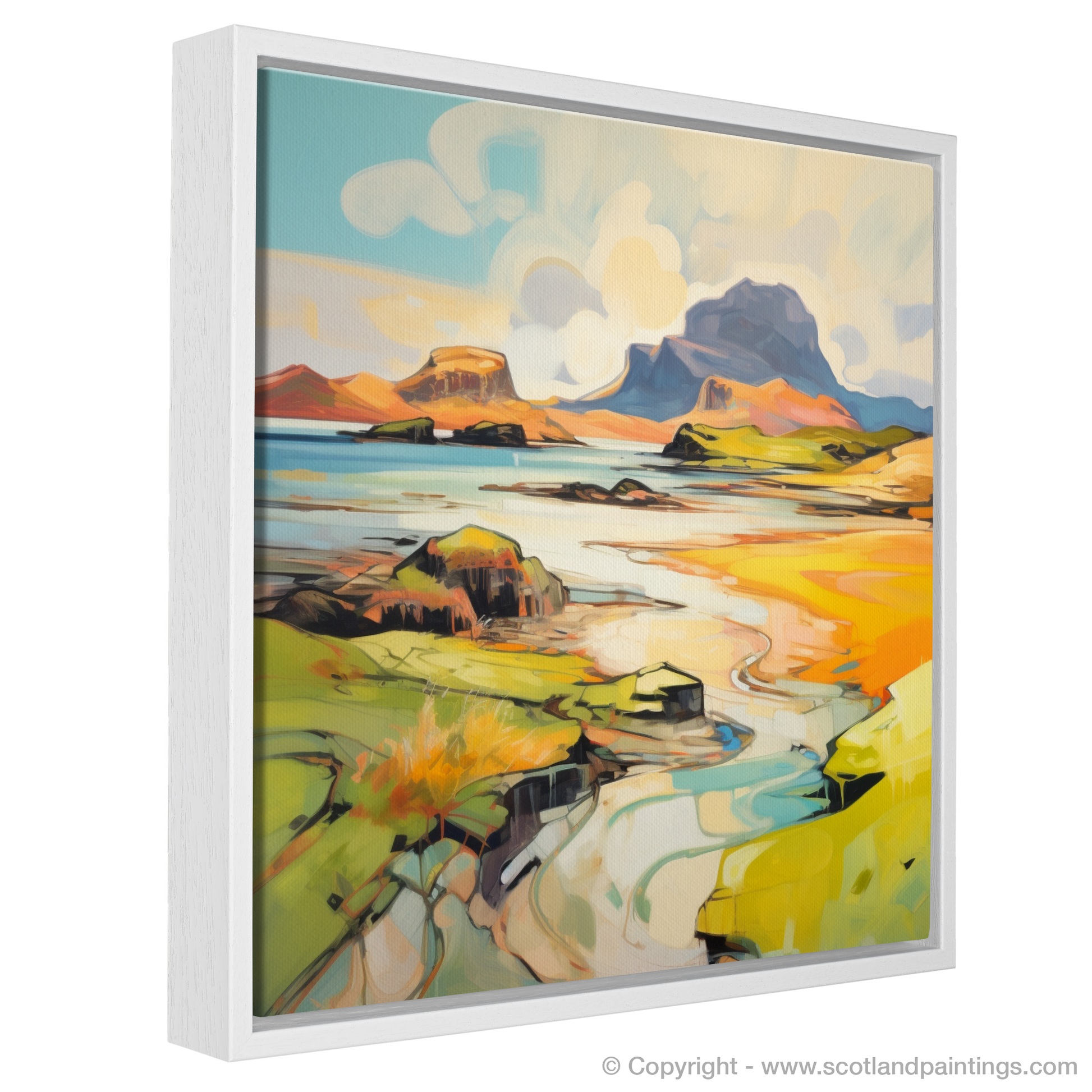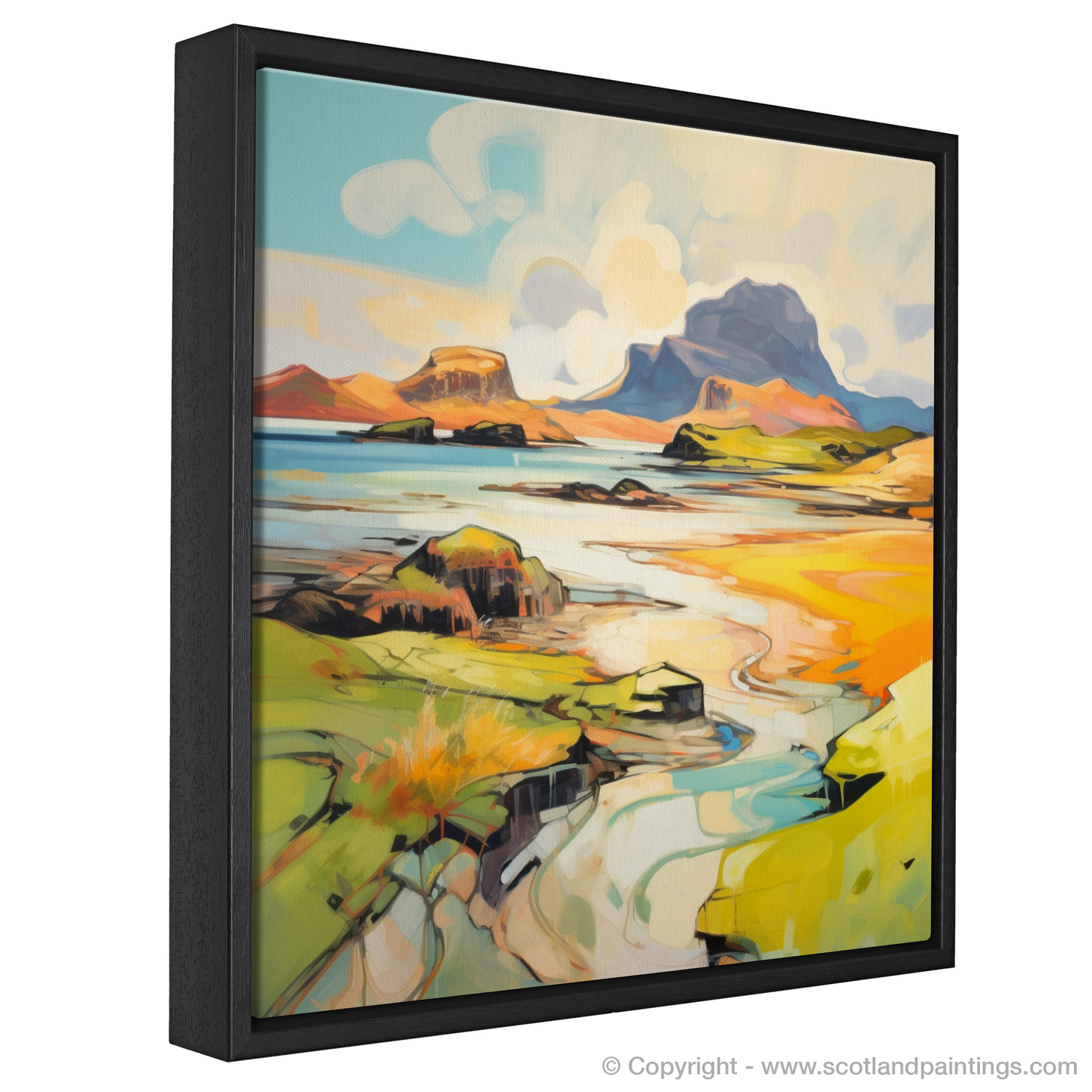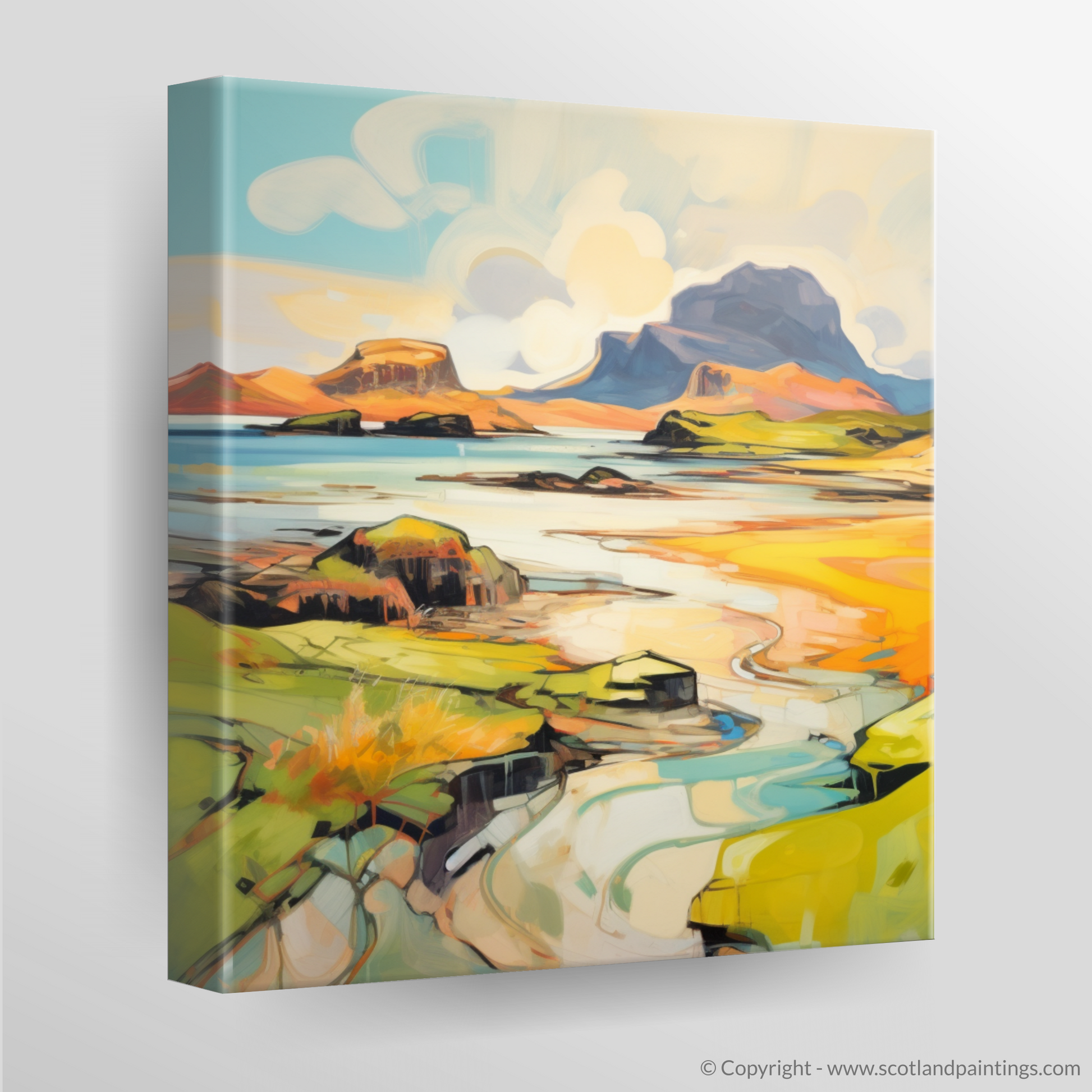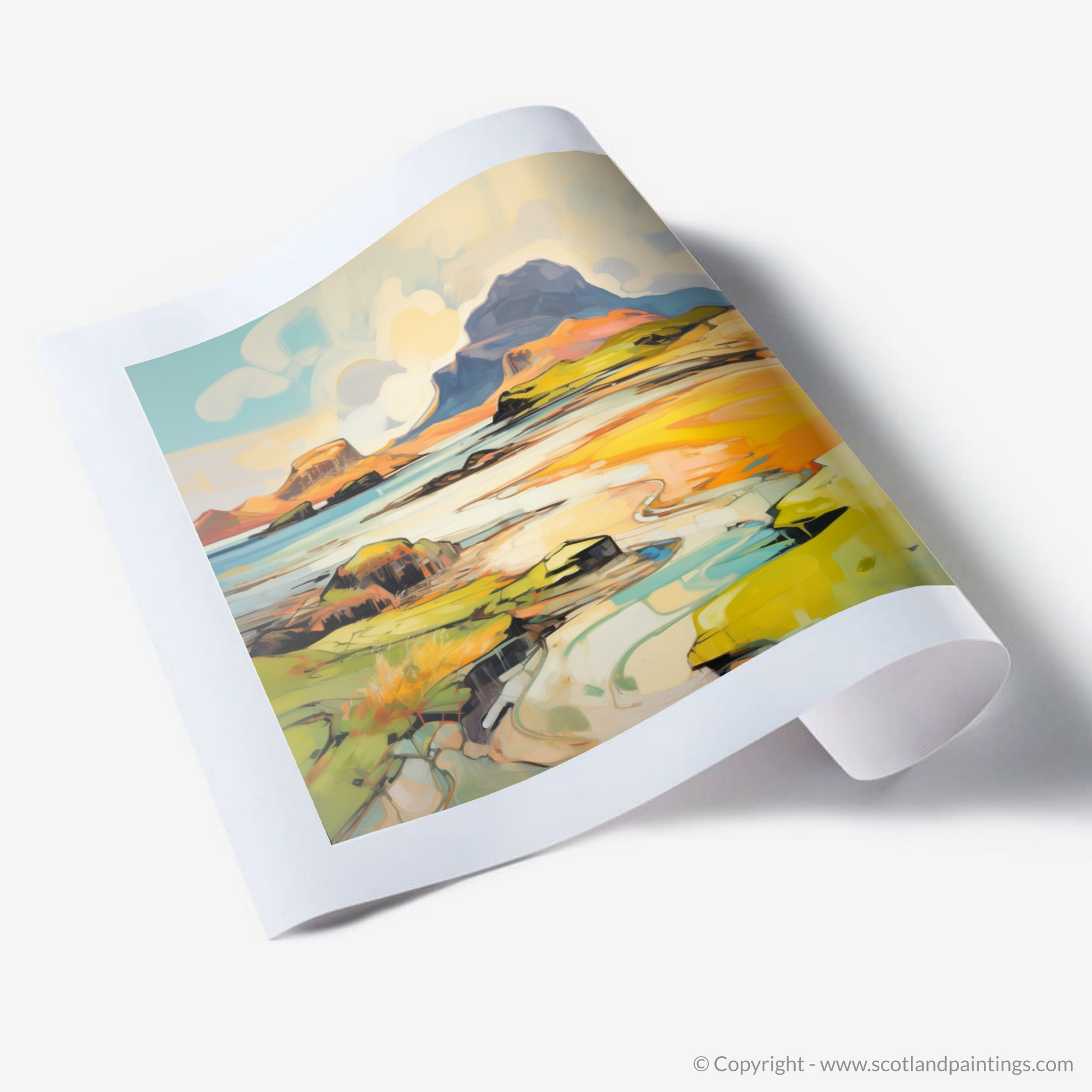 Immerse yourself in the vibrant tapestry of the Isle of Rum, brought to life in this exuberant modern interpretation of one of Scotland's natural treasures. The artwork captures the essence of a summer in the Inner Hebrides with a bold palette that infuses the scene with warmth and energy.