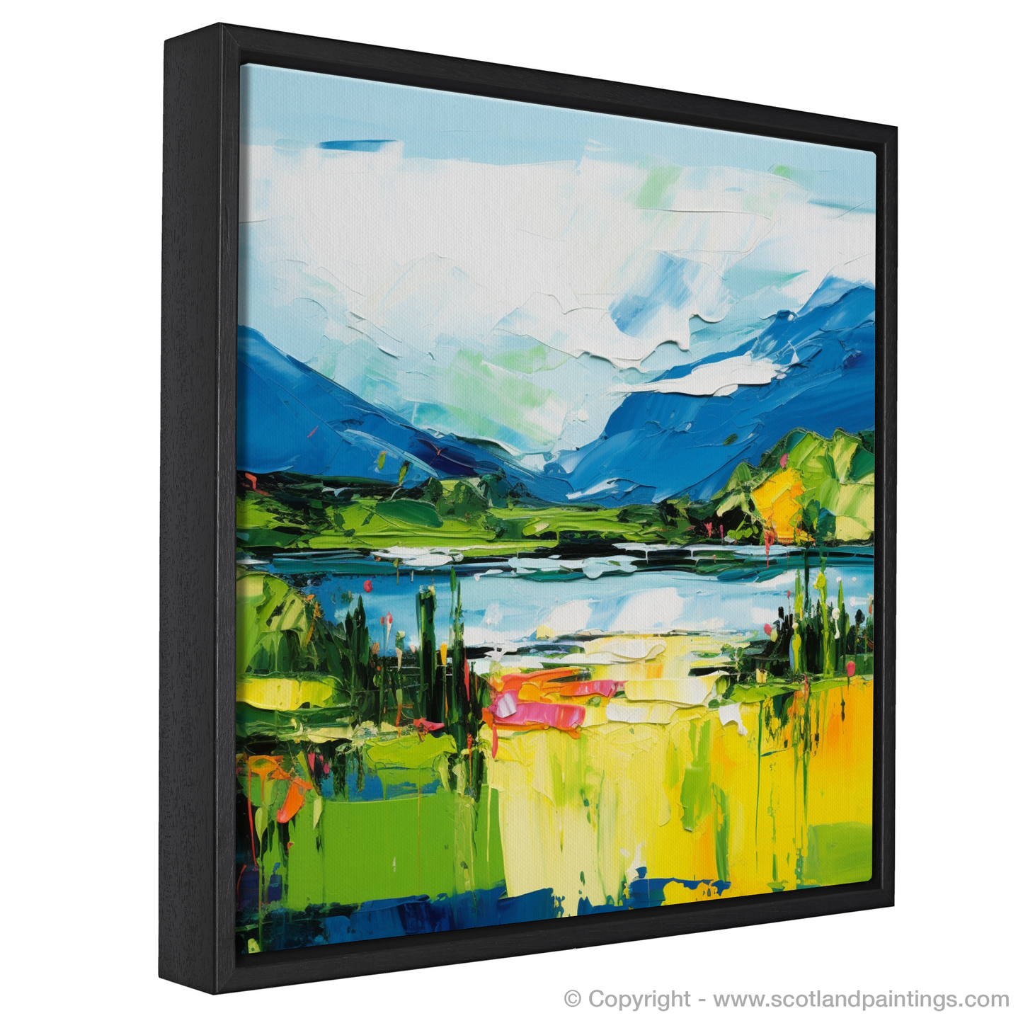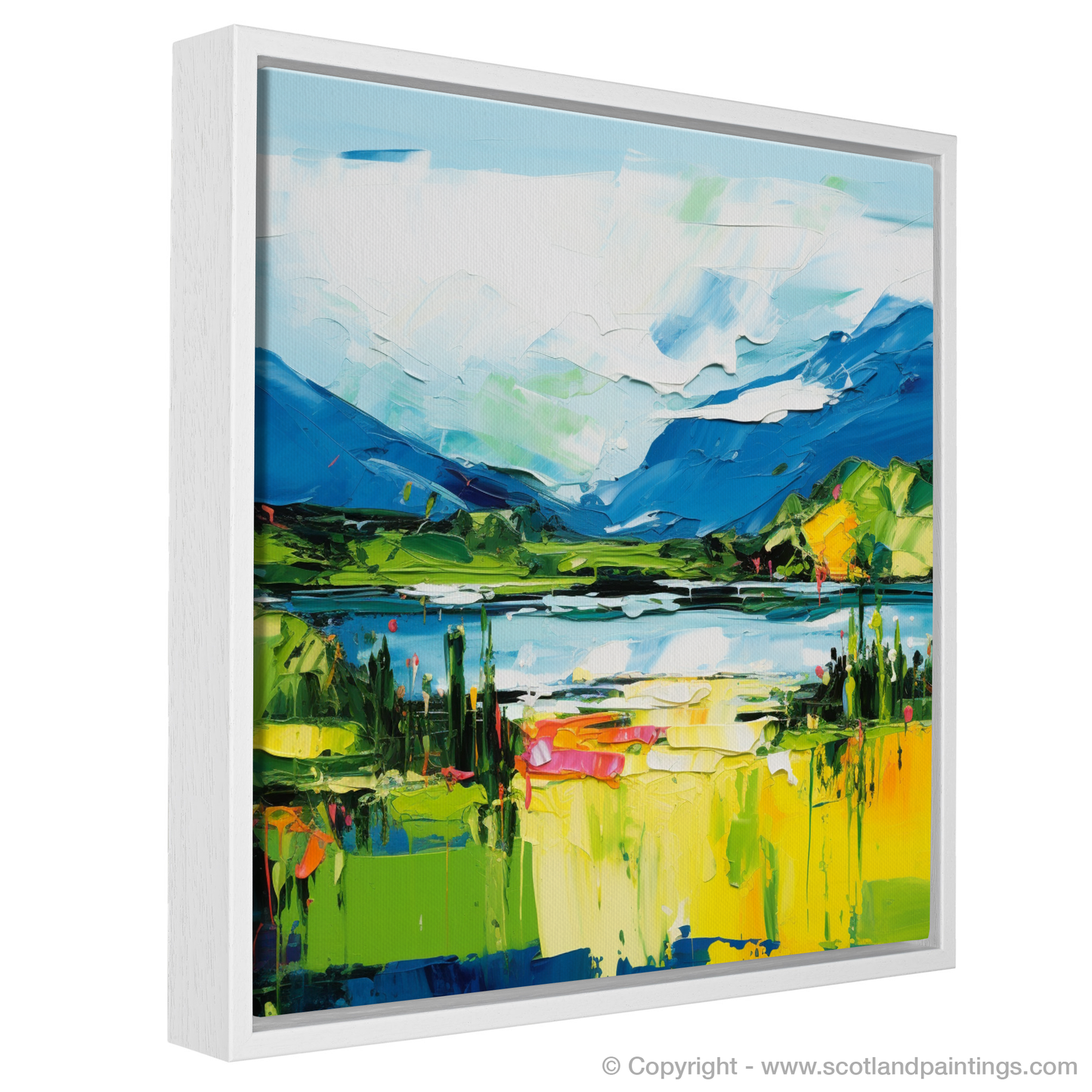Emerald greens mingle with splashes of sun-kissed yellows, suggesting the lush grasslands and blooming wildflowers that define the season. Rich blues and cool turquoise hues evoke the deep, mysterious waters of the Loch, while strokes of bright white and cobalt mirror the clear, expansive skies overhead.