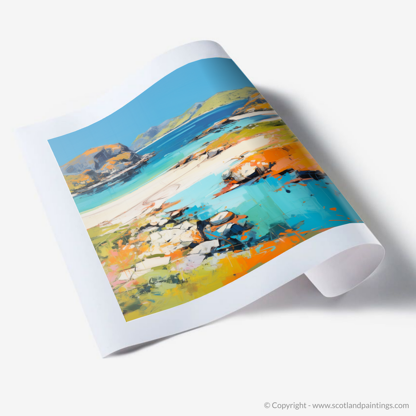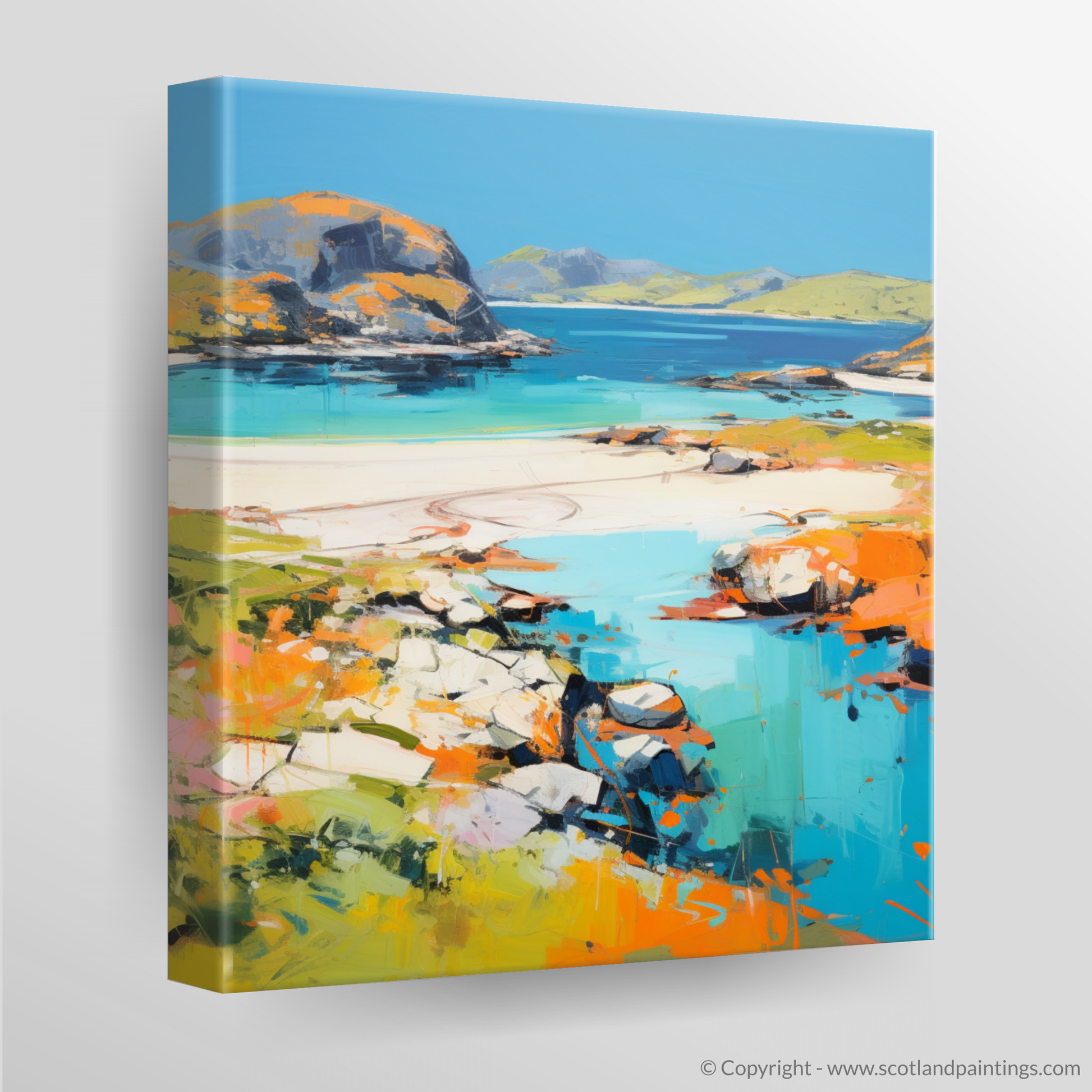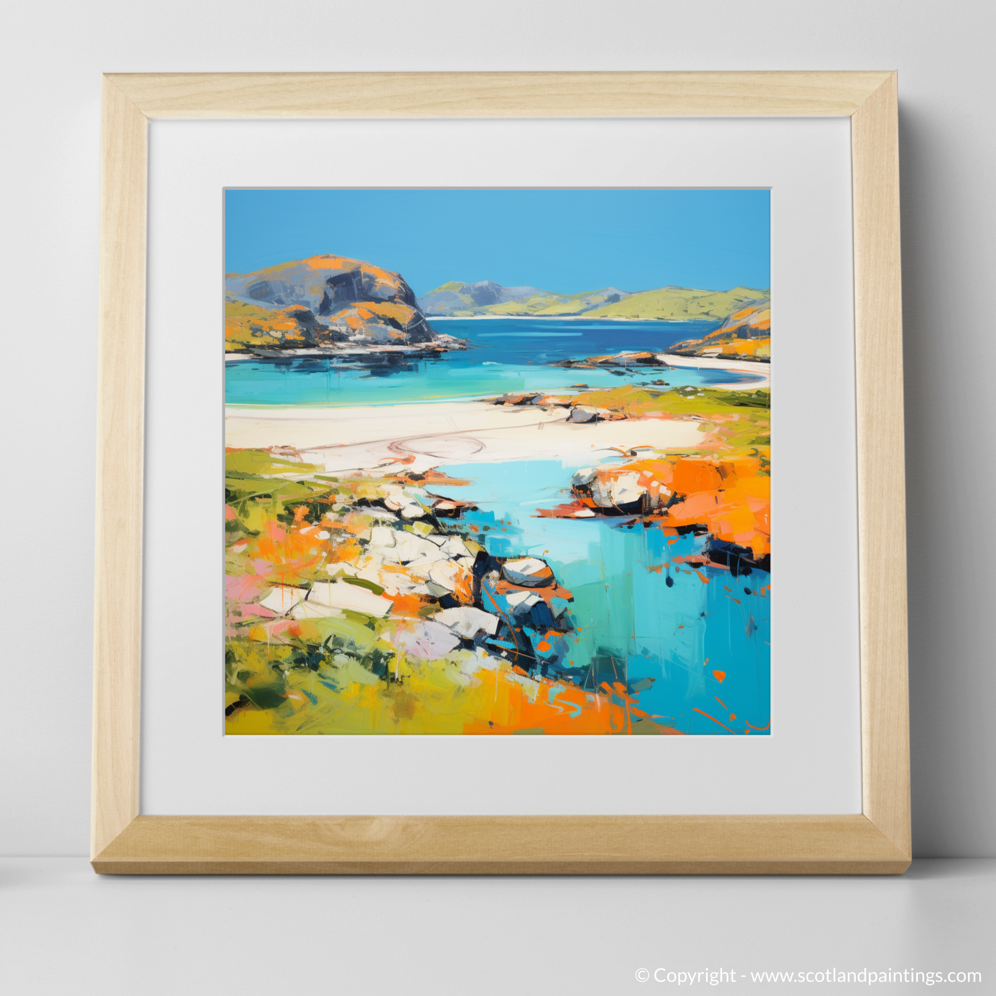 Transport your senses to the highlands with this captivating interpretation of Achmelvich Bay, Sutherland, encapsulated in a vibrant summer mood through abstract expression. This enchanting piece artfully plays with a spectrum of azure blues and marine teals that evoke the crisp, refreshing waters of the bay. The golden sands are rendered through a symphony of warm ochre, soft creams, and radiant orange hues, resplendent under a summer sky.