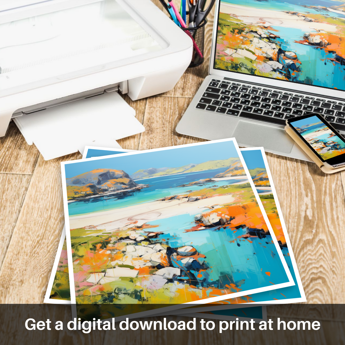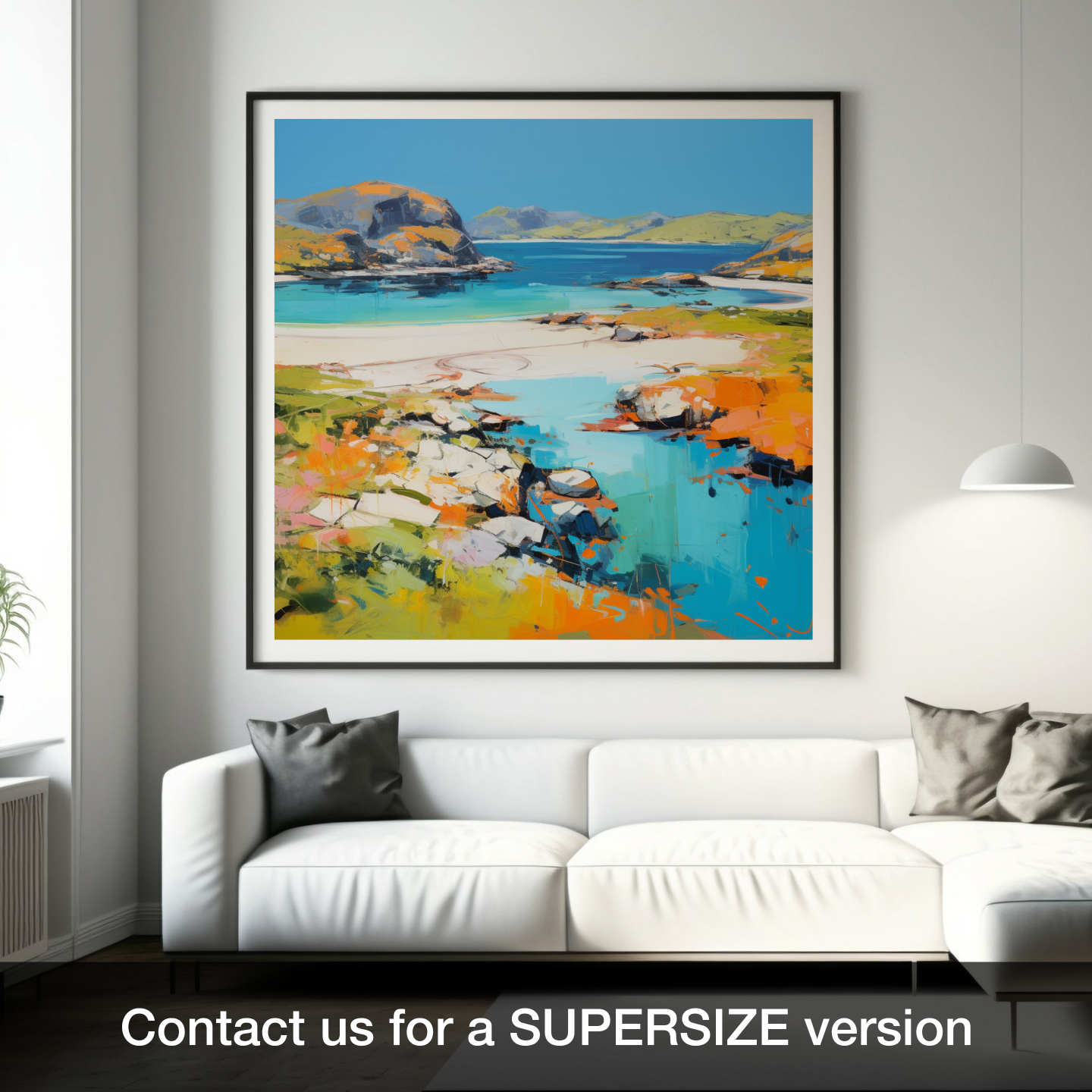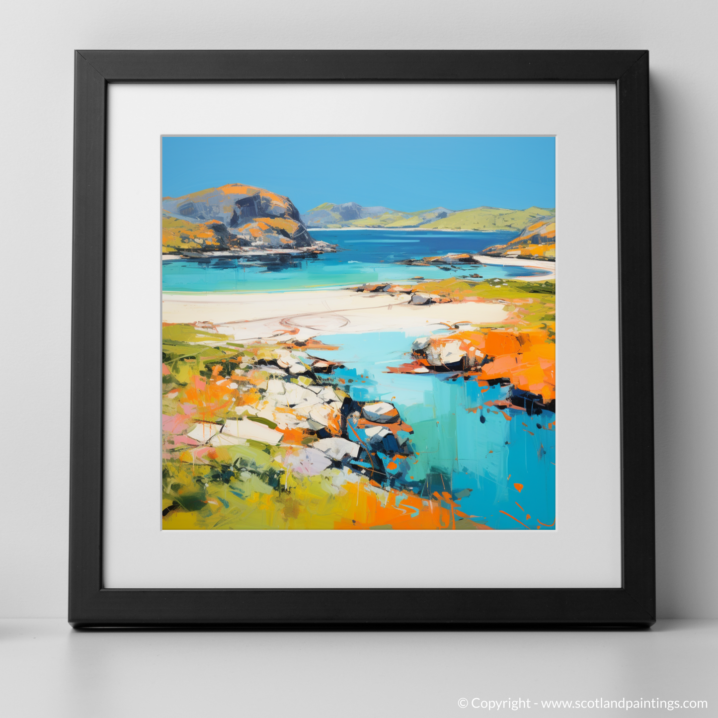 Transport your senses to the highlands with this captivating interpretation of Achmelvich Bay, Sutherland, encapsulated in a vibrant summer mood through abstract expression. This enchanting piece artfully plays with a spectrum of azure blues and marine teals that evoke the crisp, refreshing waters of the bay. The golden sands are rendered through a symphony of warm ochre, soft creams, and radiant orange hues, resplendent under a summer sky.