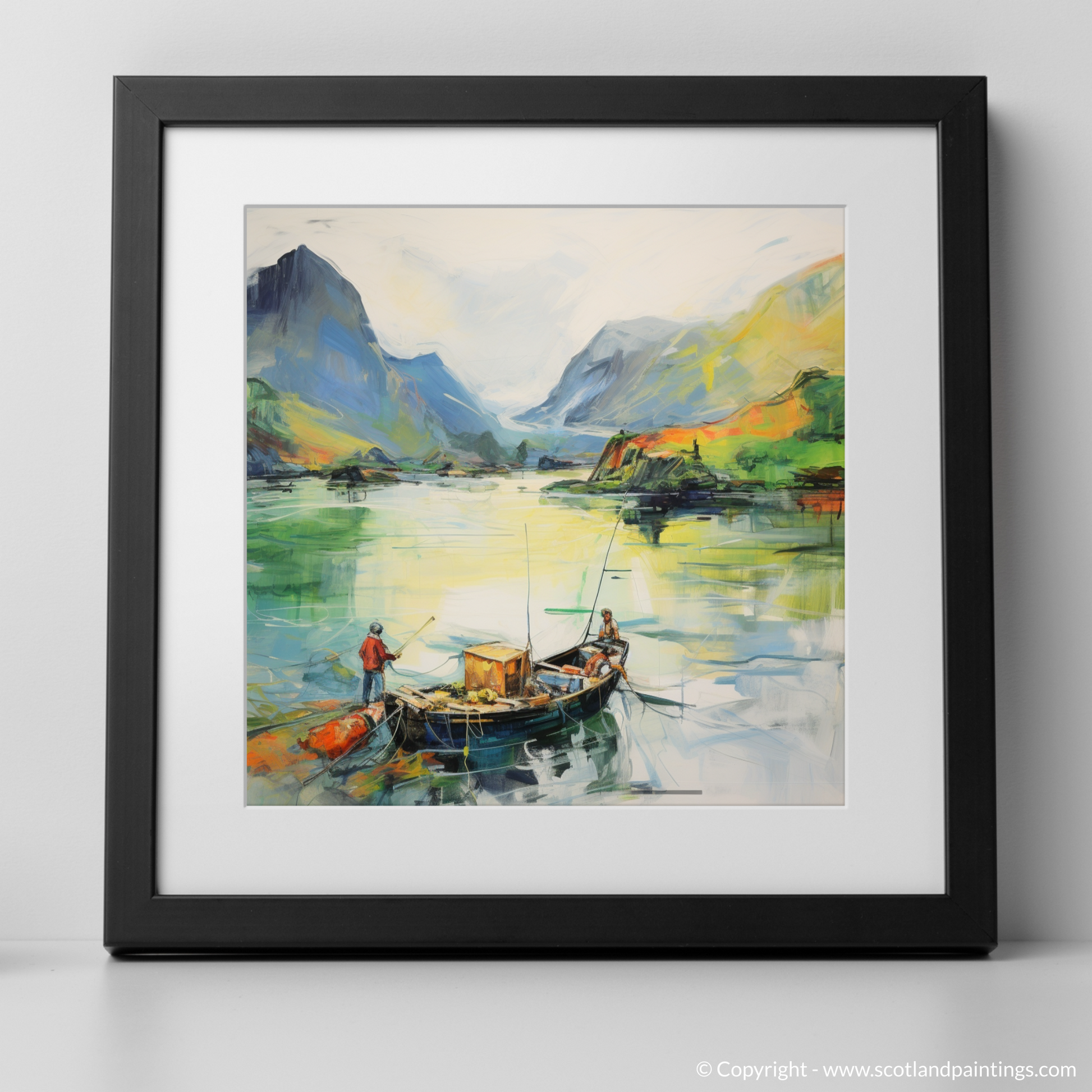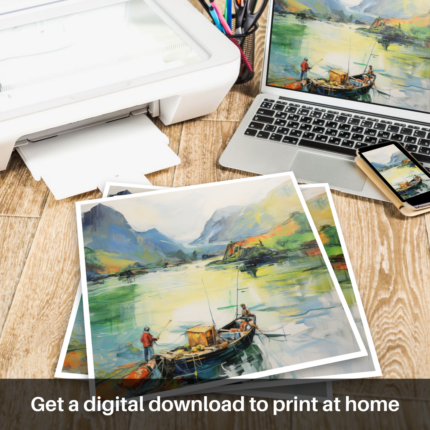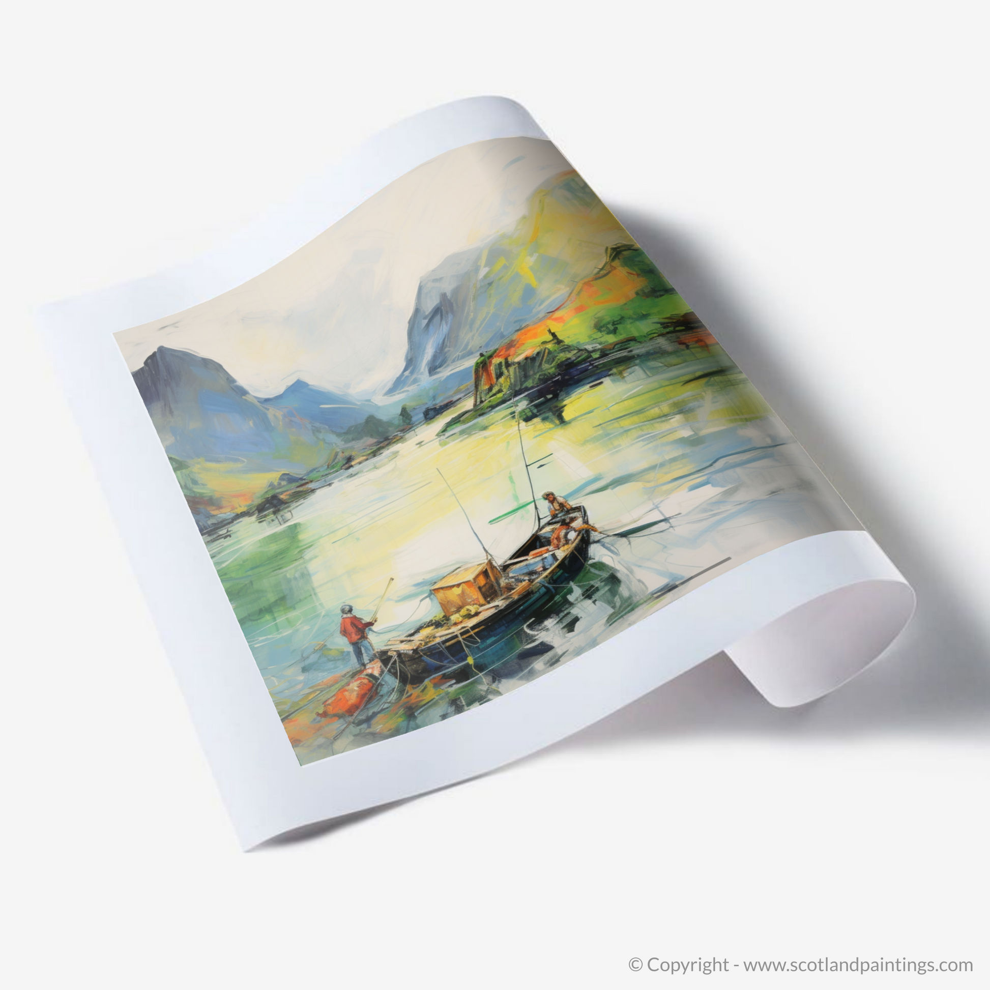 Awash with the vibrant hues of a Scottish summer, this evocative print captures the tranquil essence of Glencoe's fishing heritage. The painting depicts a serene tableau with fishermen aboard a rustic boat, set against the dramatic backdrop of the iconic Highlands. Rich golden sunlight filters through the clouds, casting ethereal reflections upon the calm, glass-like loch, while the lush greenery of the banks is kissed by the warm glow, elevating the scene's palpable warmth.