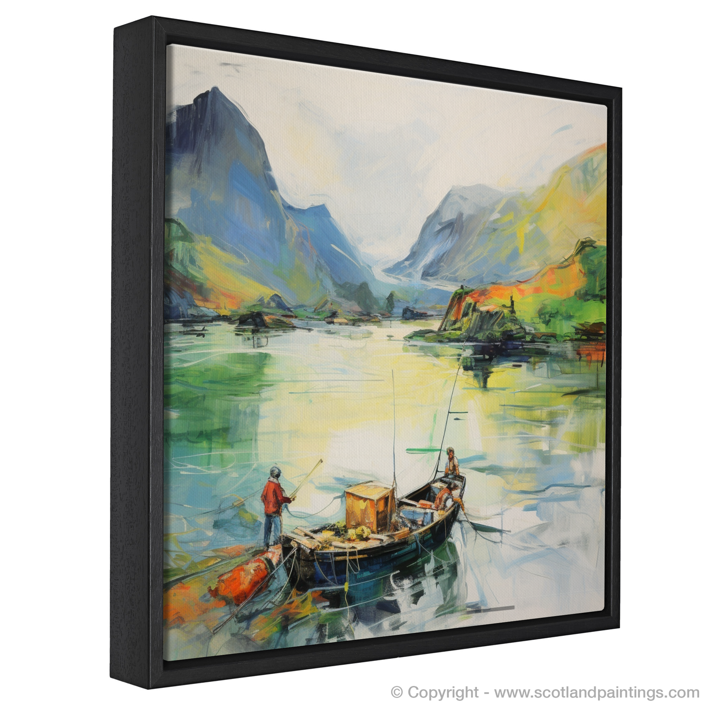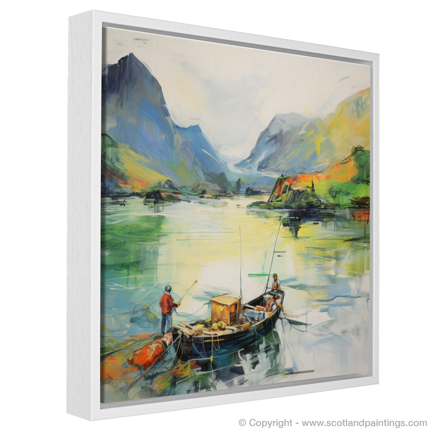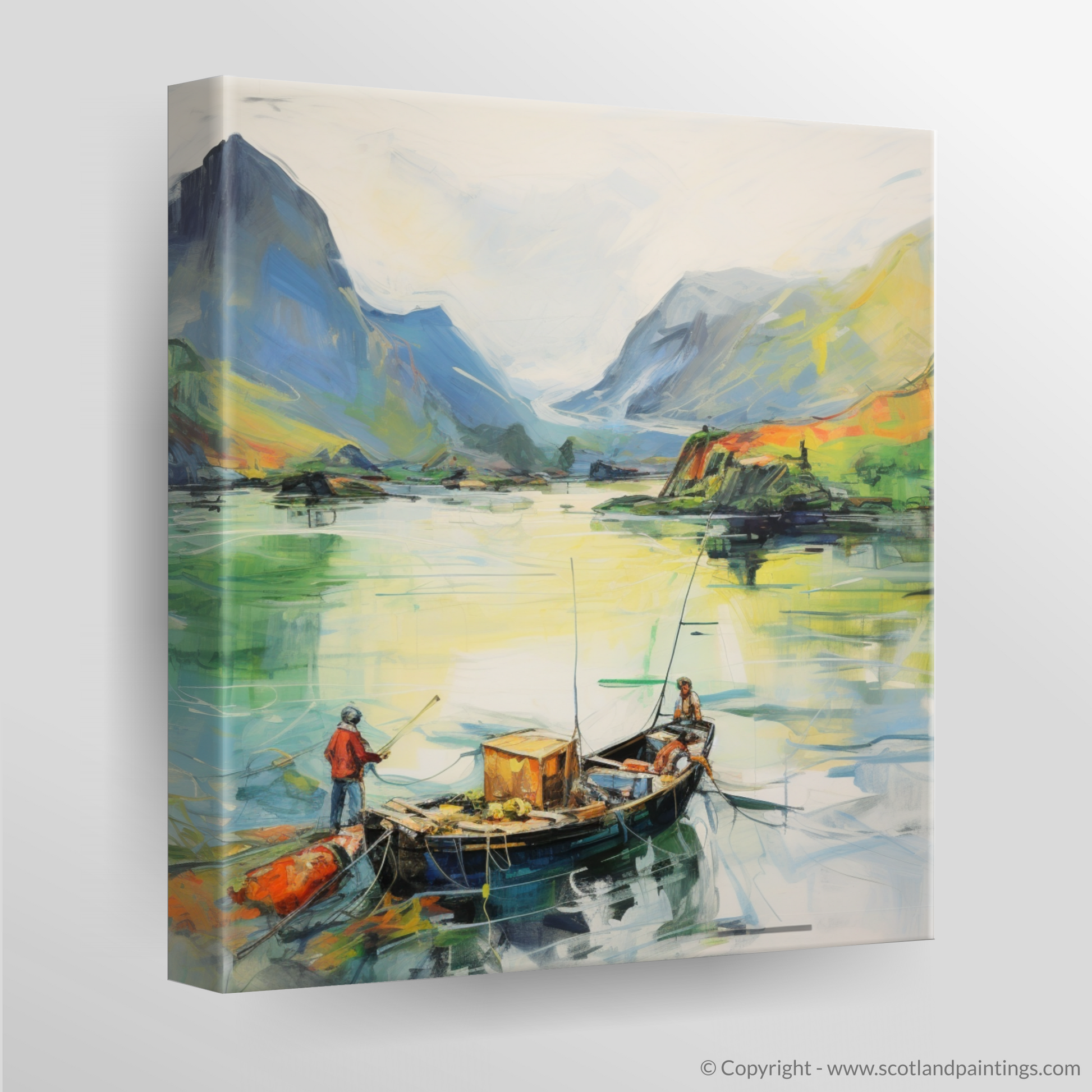 Awash with the vibrant hues of a Scottish summer, this evocative print captures the tranquil essence of Glencoe's fishing heritage. The painting depicts a serene tableau with fishermen aboard a rustic boat, set against the dramatic backdrop of the iconic Highlands. Rich golden sunlight filters through the clouds, casting ethereal reflections upon the calm, glass-like loch, while the lush greenery of the banks is kissed by the warm glow, elevating the scene's palpable warmth.
