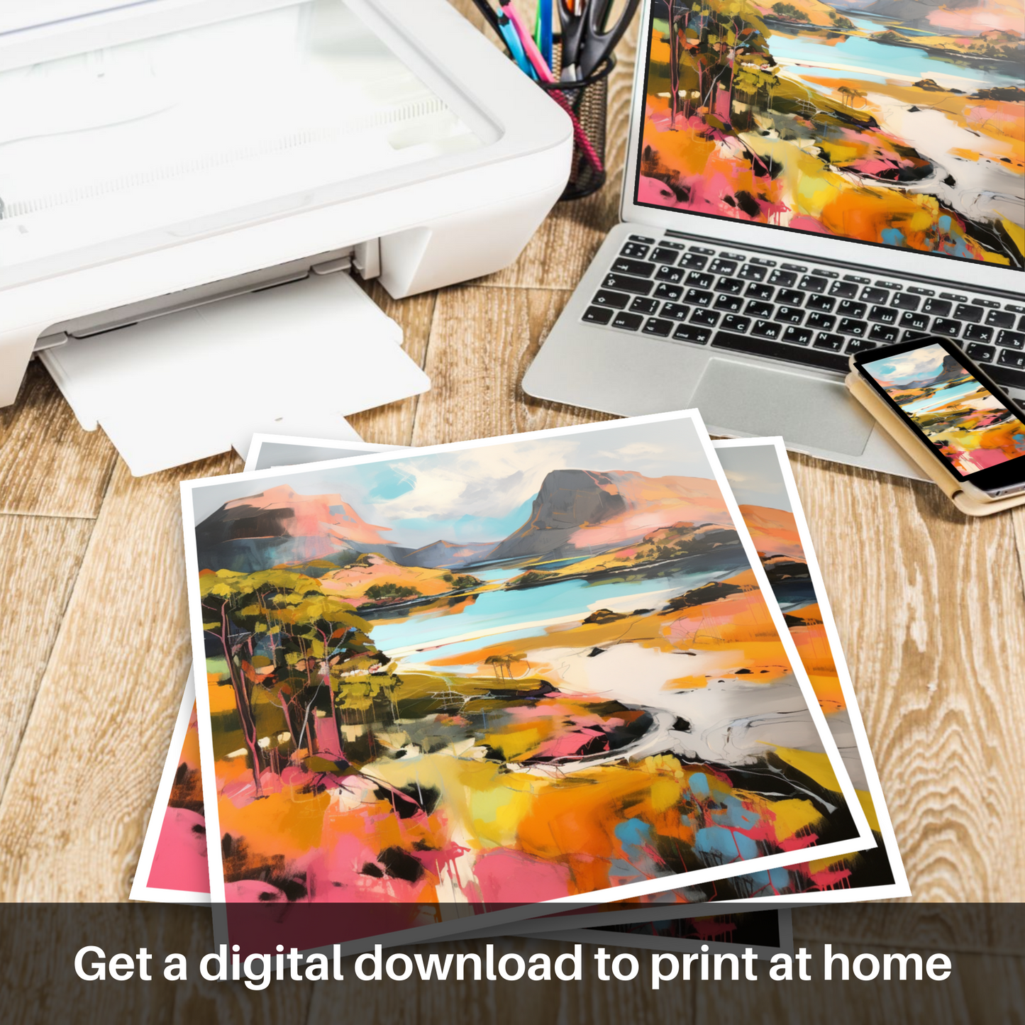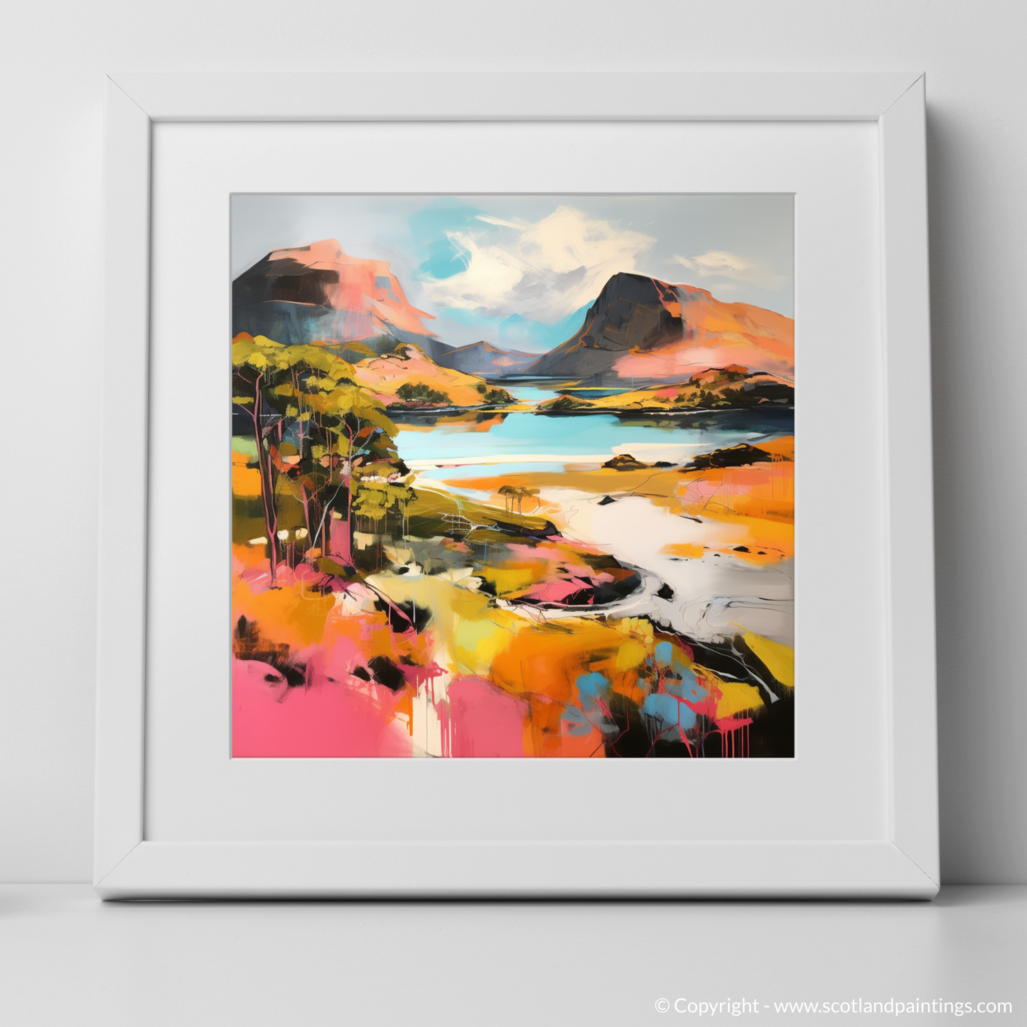Immerse yourself in the vibrant allure of Scottish summertime with this striking representation of Loch Maree, Wester Ross. Set against a canvas bursting with modern dynamism, the print captures an invigorating reimagining of one of Scotland's most treasured landscapes.