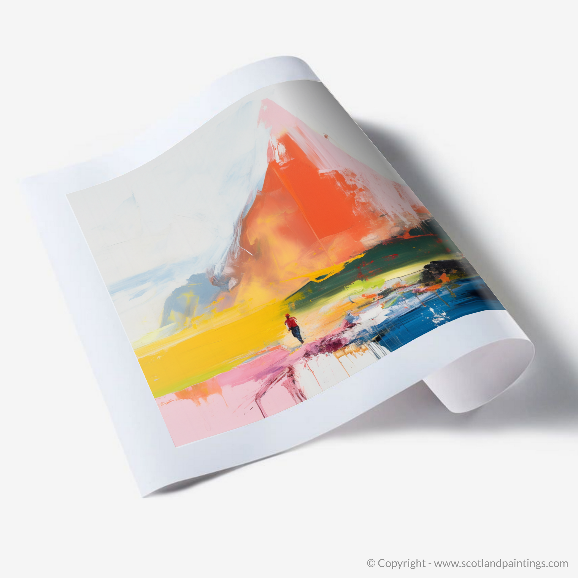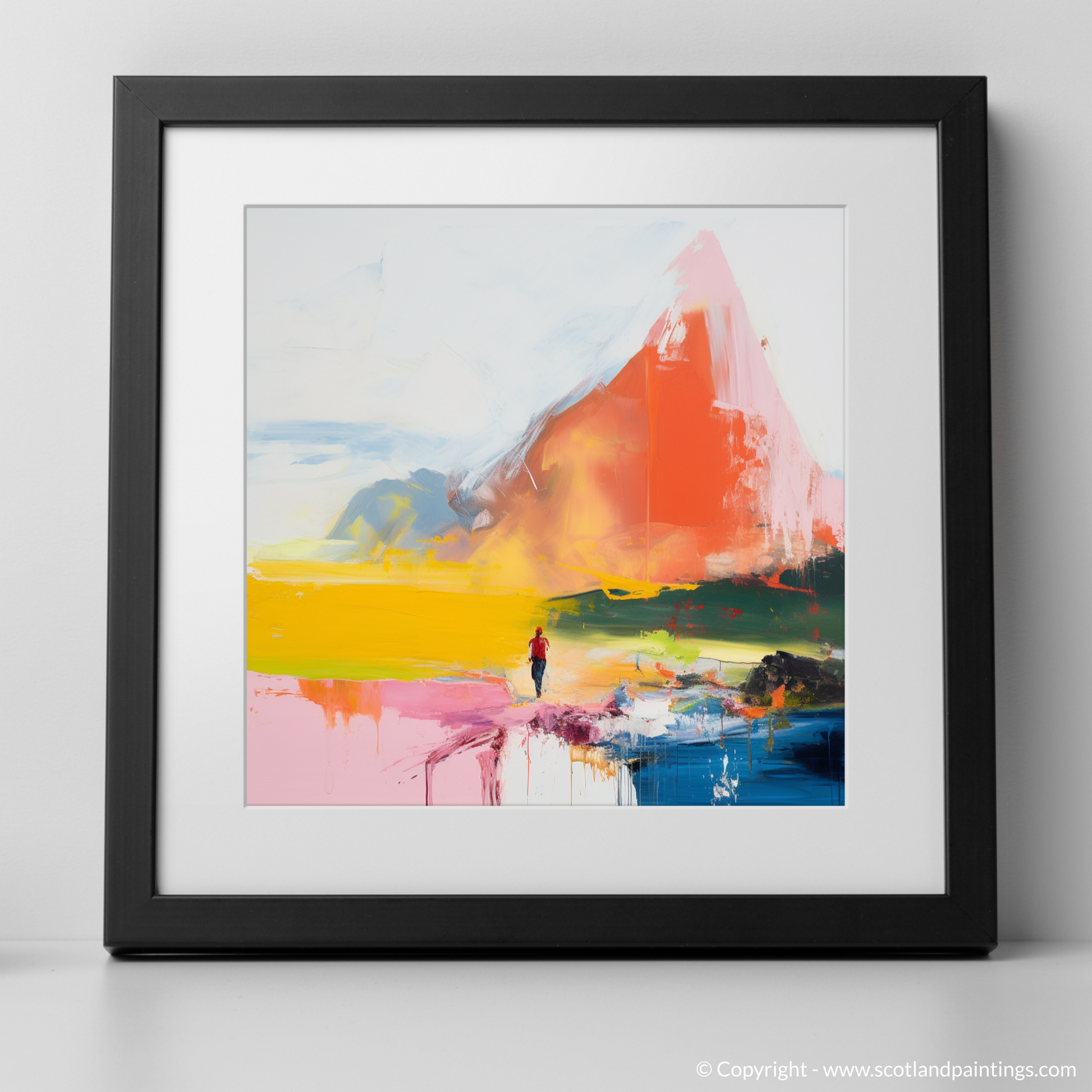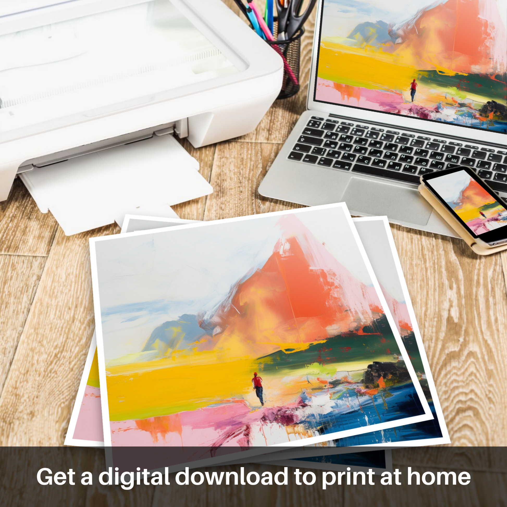 Immerse yourself in the vivid abstraction of a Scottish summer with this evocative print. Bold, impassioned sweeps of colour capture the untamed beauty of Glencoe, where a solitary figure casts a tiny, defiant silhouette against the grandeur of nature. Dominant hues of fiery reds and deep oranges blend with the tranquility of soft blues, distant greys, and splashes of sunshine yellows, evoking the warmth and fleeting light of a long summer's day in the Highlands.