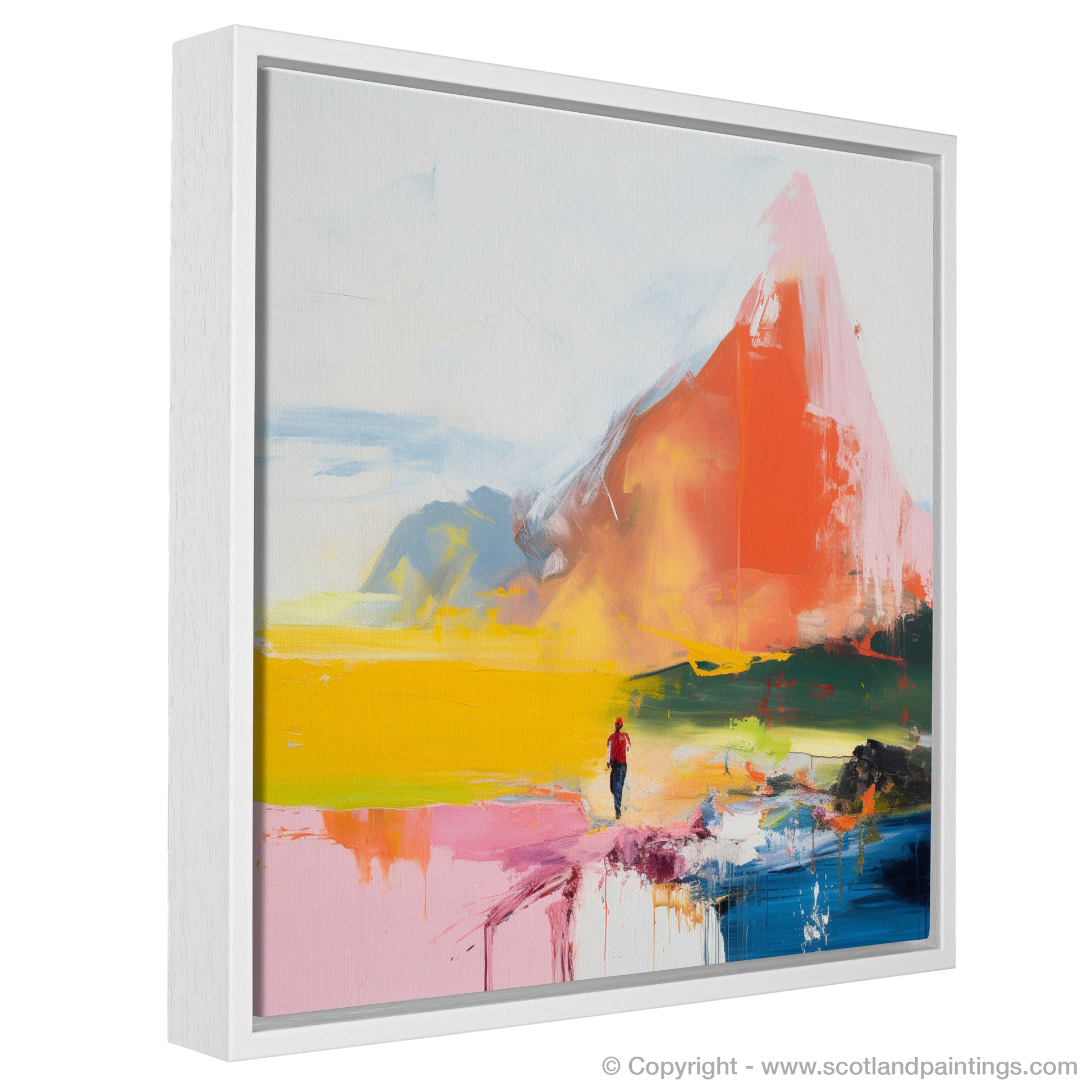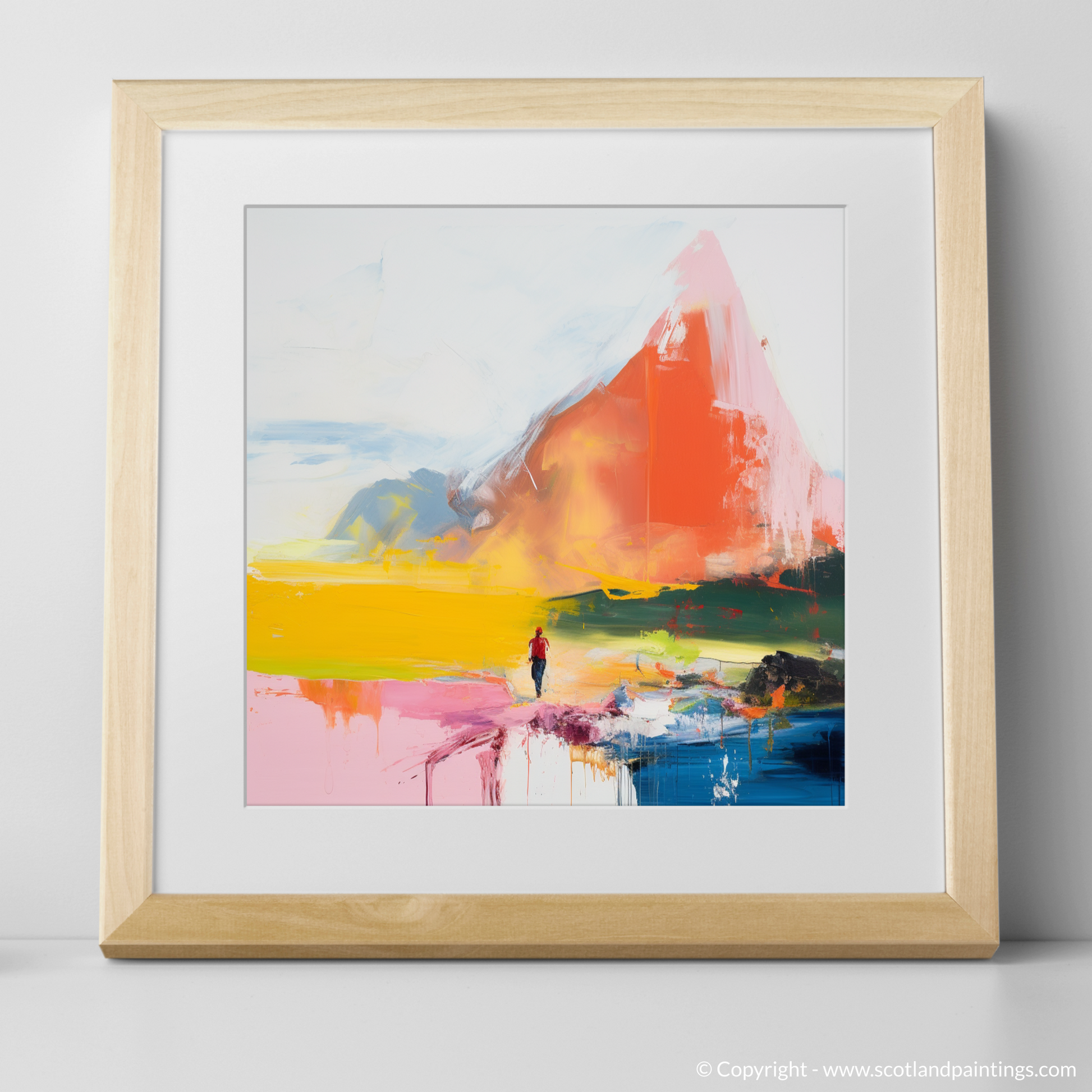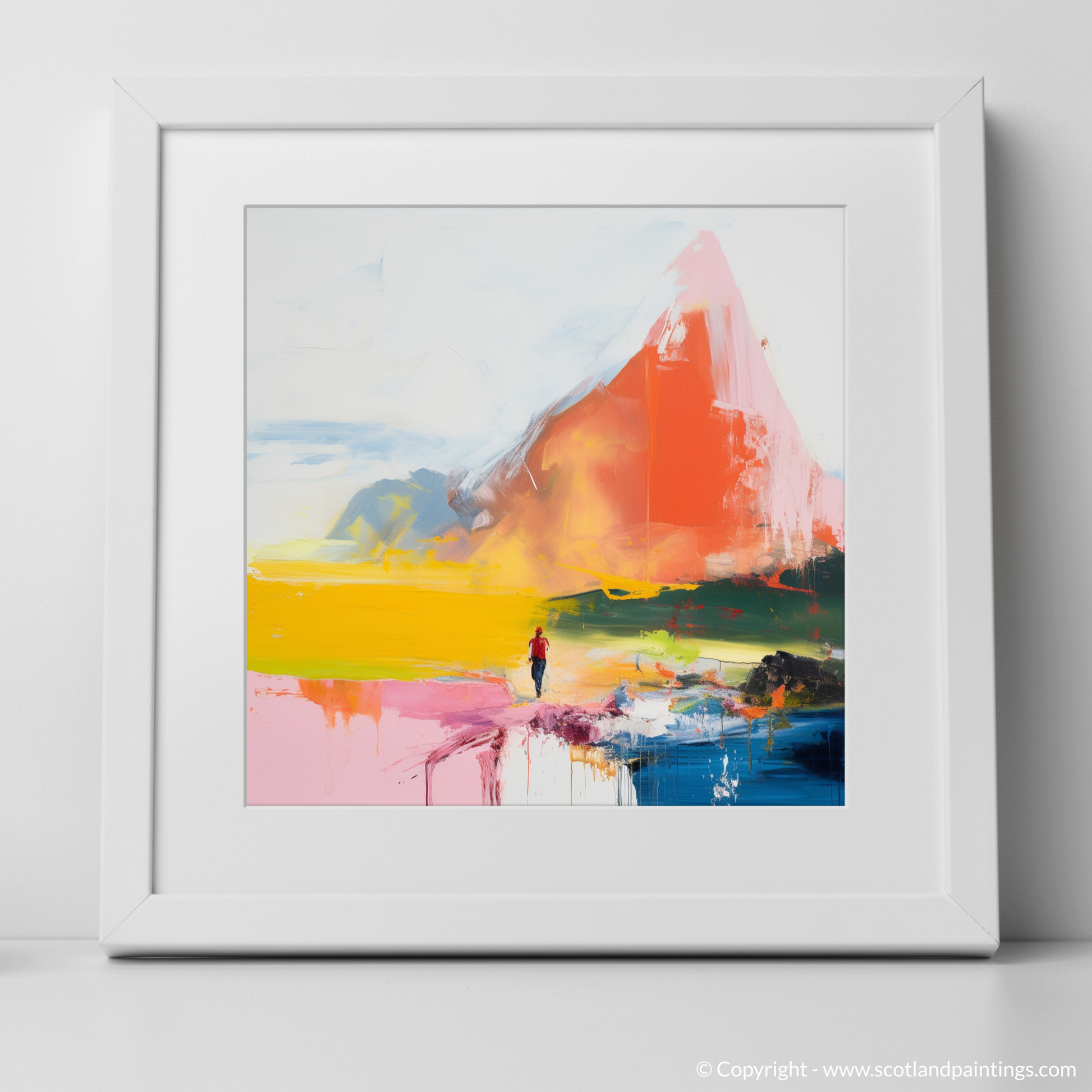Immerse yourself in the vivid abstraction of a Scottish summer with this evocative print. Bold, impassioned sweeps of colour capture the untamed beauty of Glencoe, where a solitary figure casts a tiny, defiant silhouette against the grandeur of nature. Dominant hues of fiery reds and deep oranges blend with the tranquility of soft blues, distant greys, and splashes of sunshine yellows, evoking the warmth and fleeting light of a long summer's day in the Highlands.