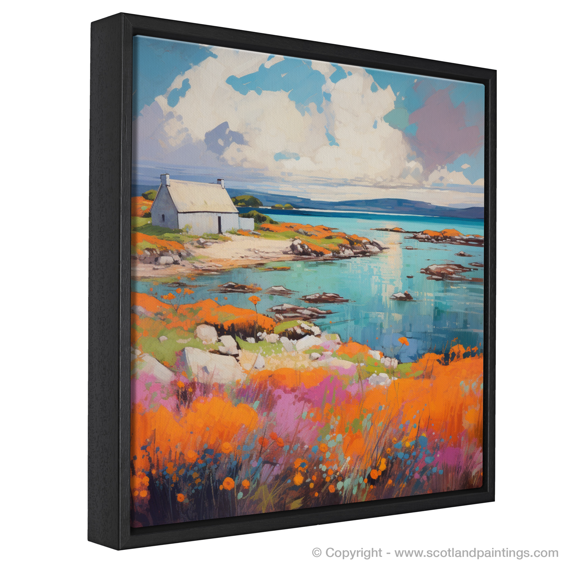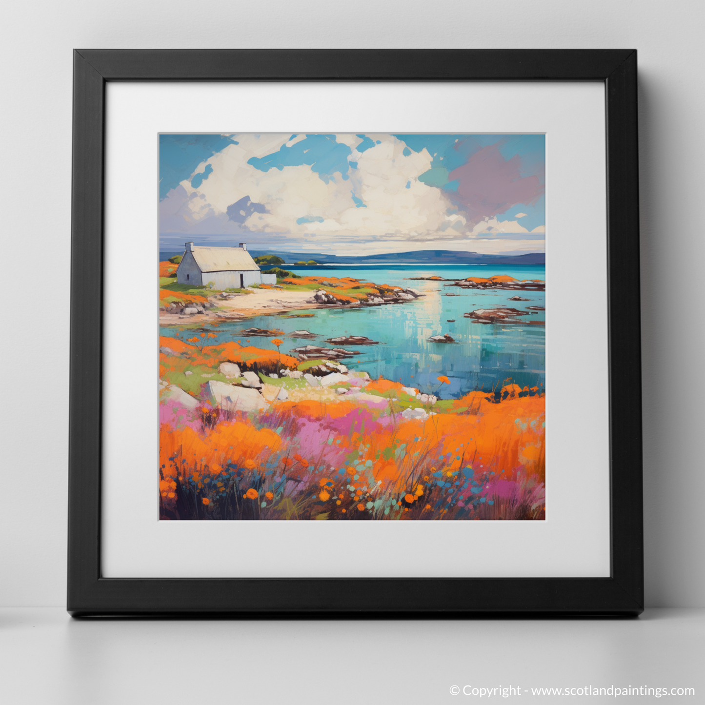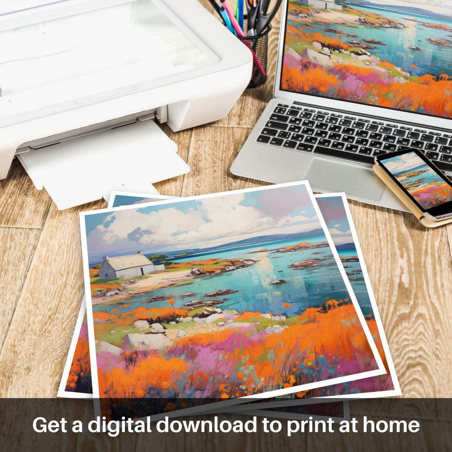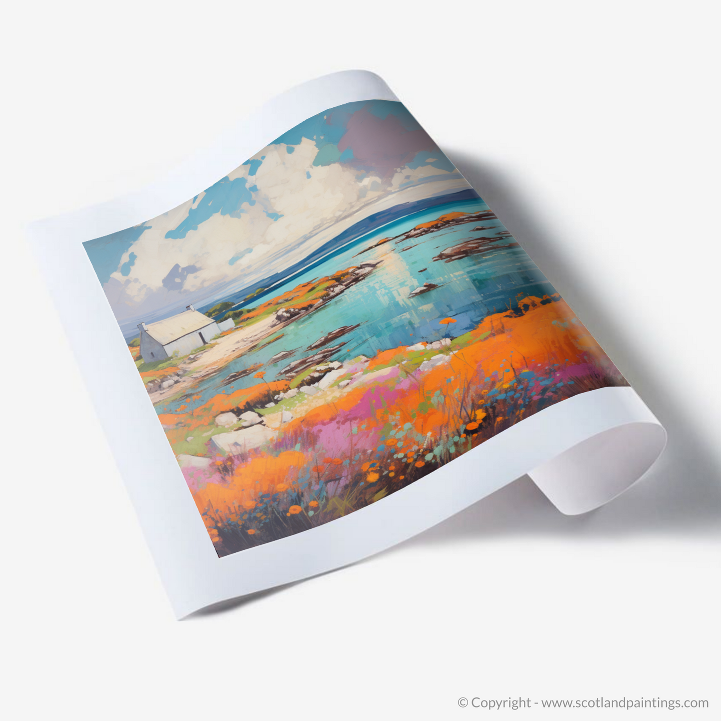 Embrace the vivid tranquillity of the Inner Hebrides with a magnificent print that captures the essence of the Isle of Jura during the summertime enchantment. The artwork immerses viewers in a kaleidoscope of colour, where the land meets the sky in a symphony of tints and hues, characteristic of the Colour Field style that emphasises the potency of pure, solid swatches of paint.