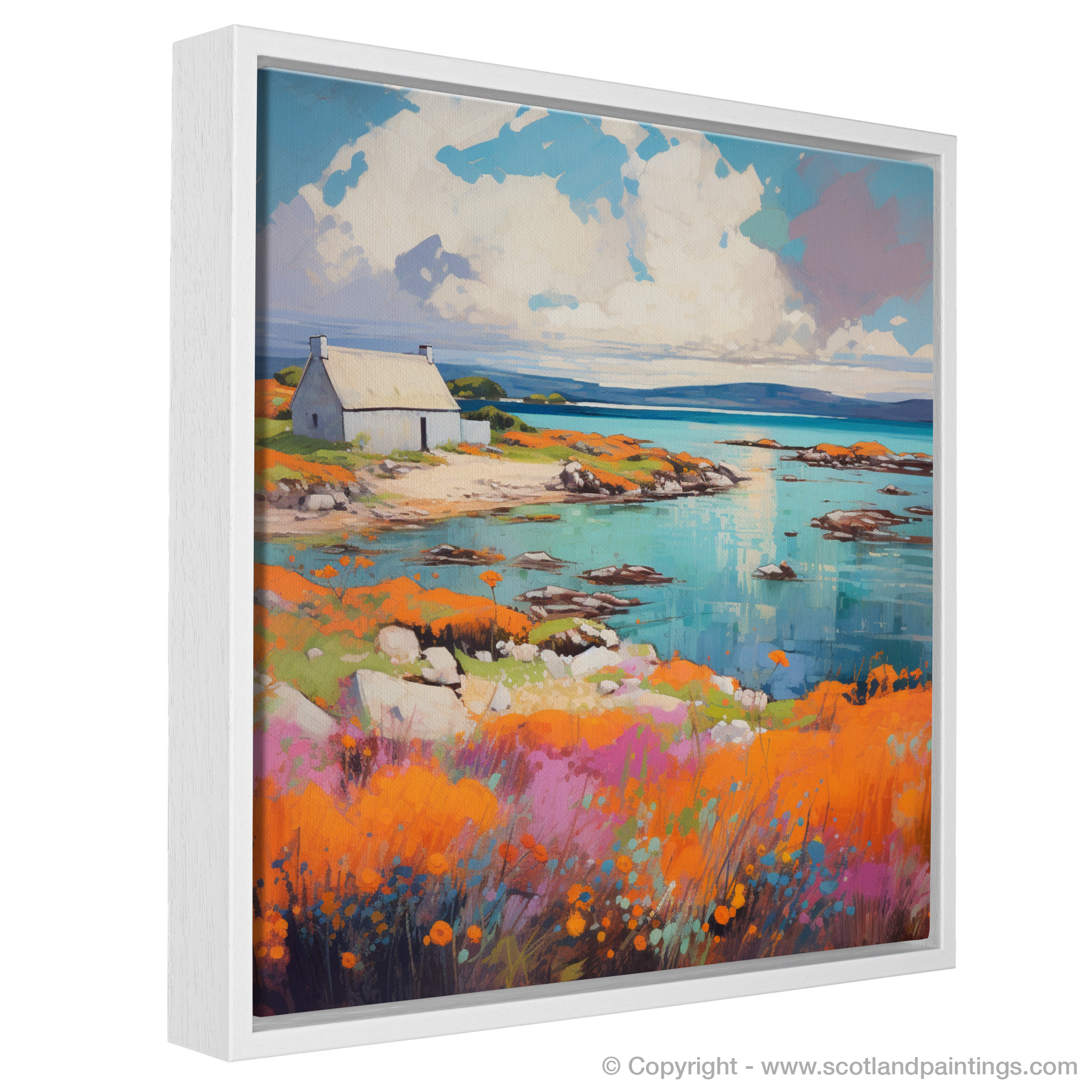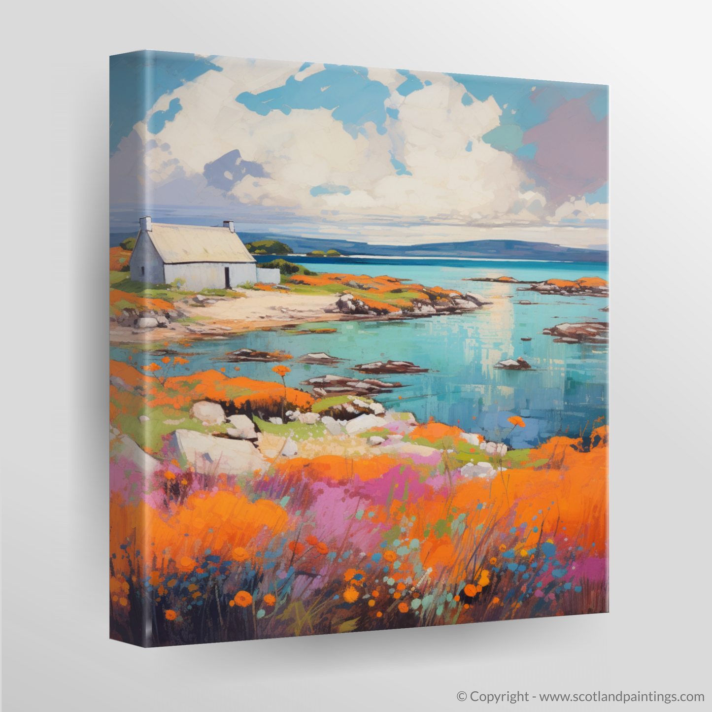 Visually behold the serene coastal scene, where a solitary white cottage stands guard over a tapestry of wildflowers and lush grasses. Blooms of fiery orange, radiant pink, and delicate touches of white and yellow sprawl across the canvas, mirroring the wild, untamed beauty of Scotland's natural flora. The cottage, with its simple, clean lines, offers a stark yet harmonious contrast to the wildness of the surrounding landscape.