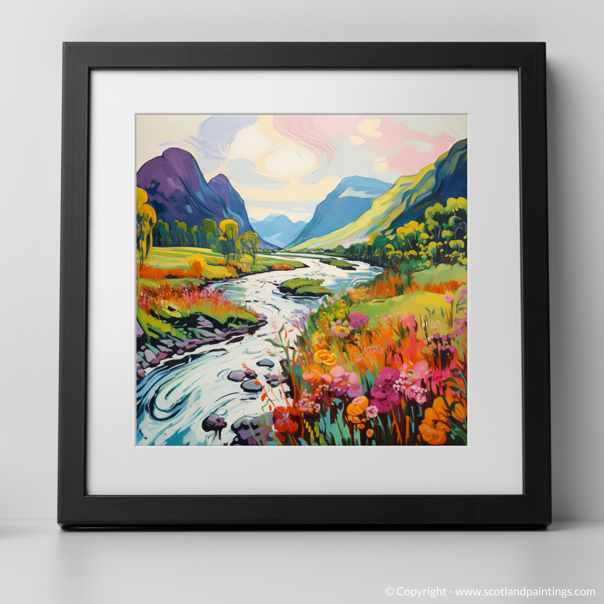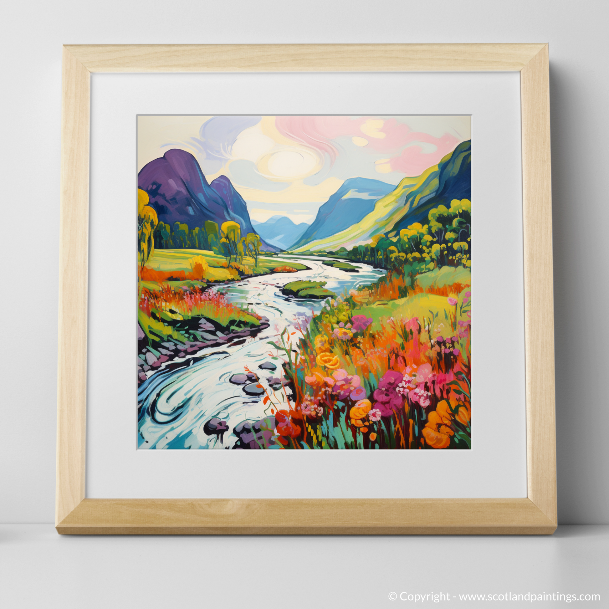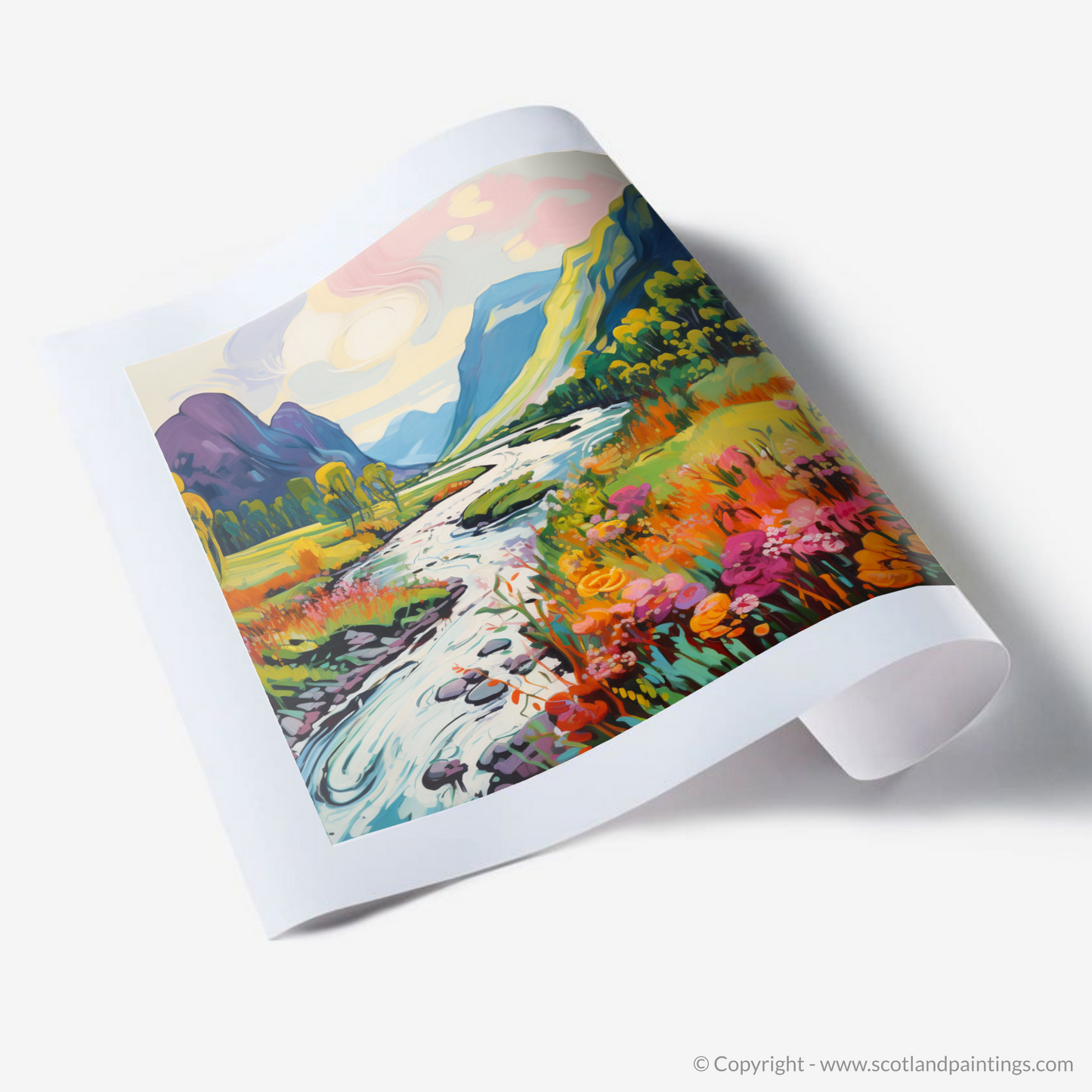 Immerse yourself in the vibrant hues and bold brushstrokes that bring the Scottish Highlands to life in this captivating print. Evoking a sense of unrestrained joy and a celebration of natural beauty, this piece is an ode to the River Coe, nestled in the heart of Glencoe during the bountiful summer months.