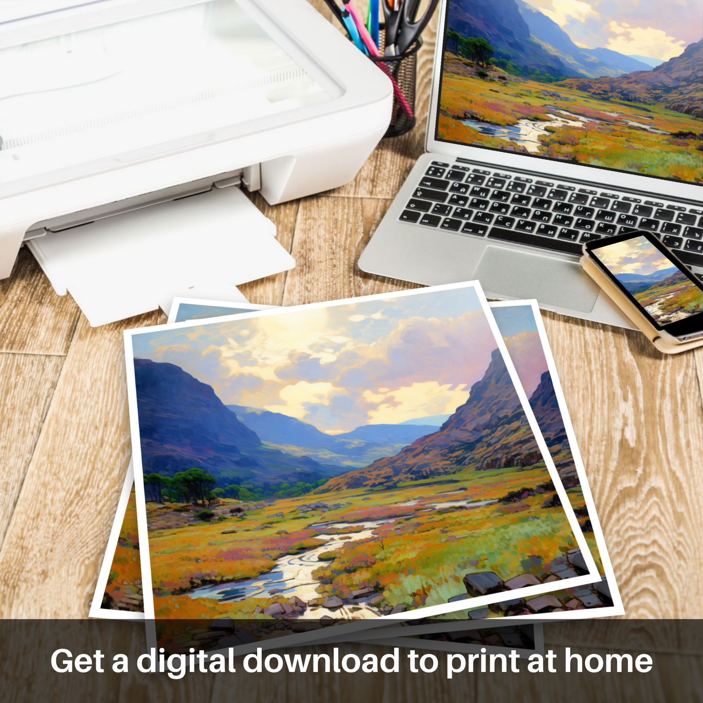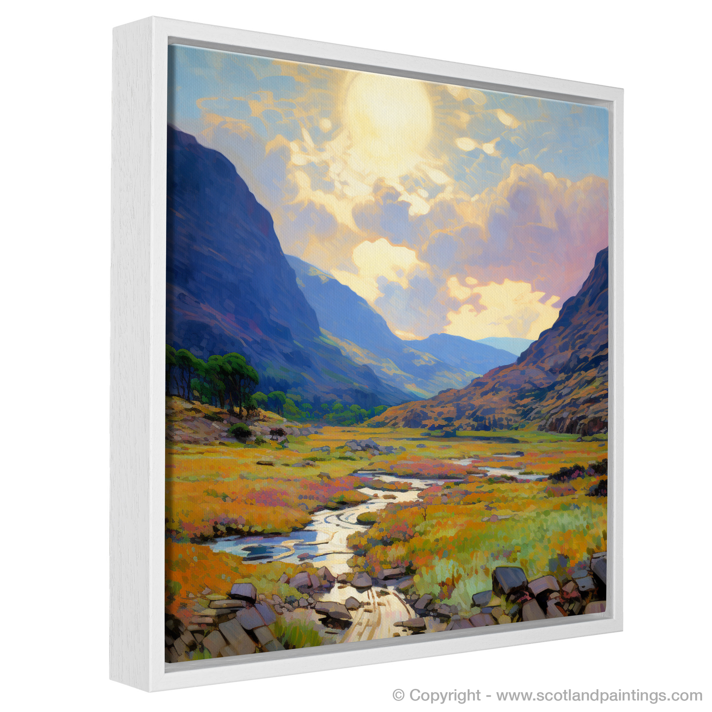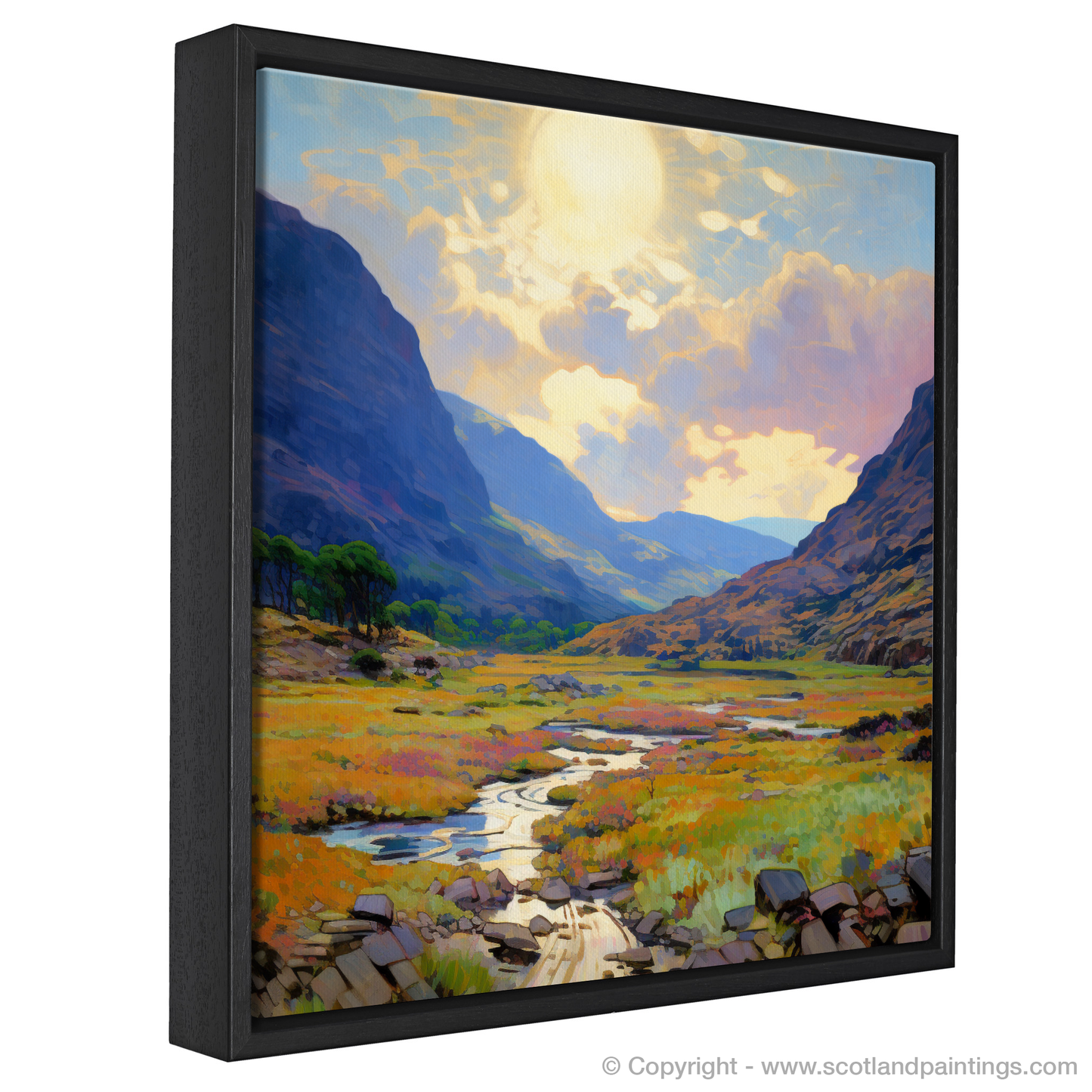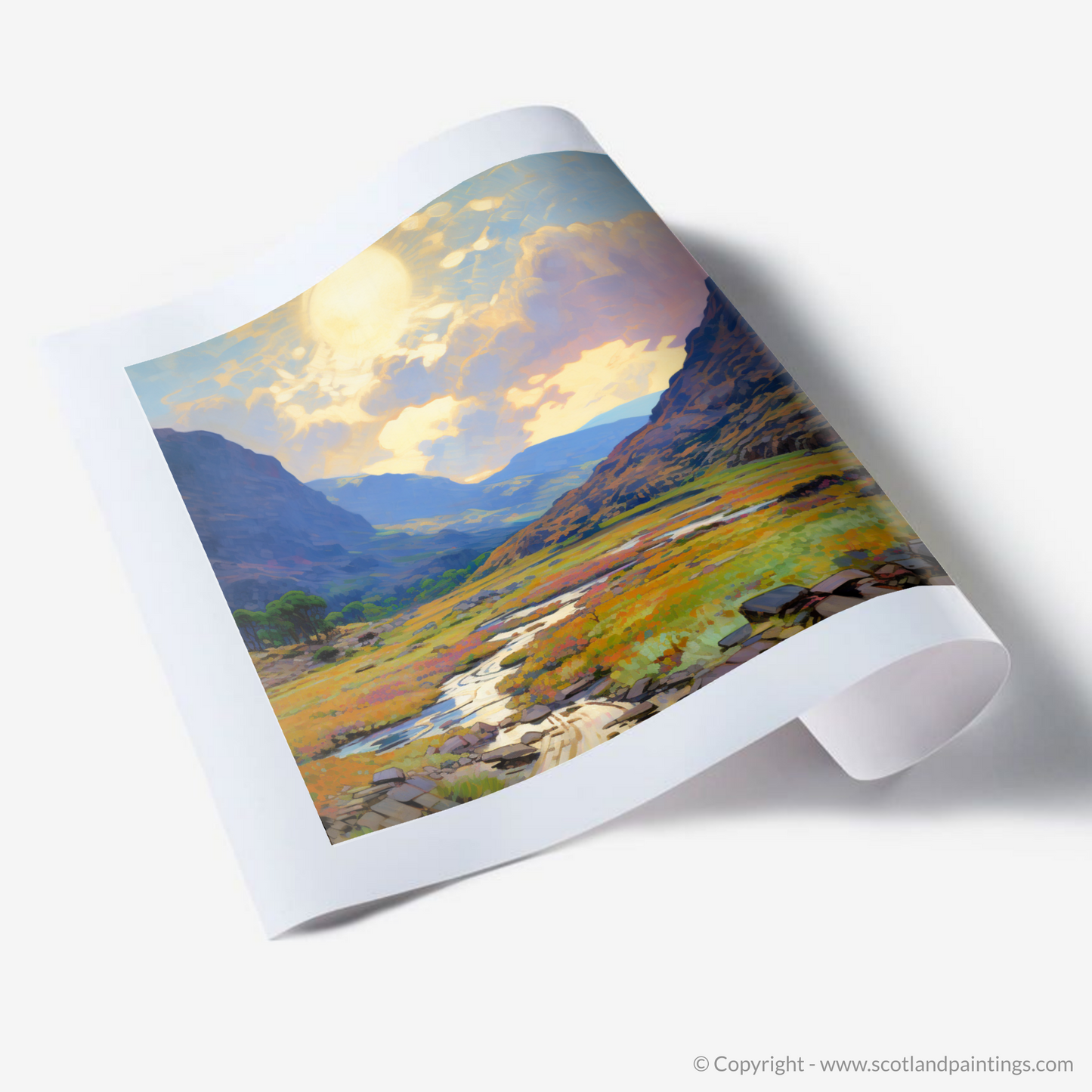 Capture the essence of Scottish summertime with this enchanting depiction of the heather-clad Glen Garry. The warm glow of a setting sun bathes the landscape in a golden light, reflecting off a meandering stream that cuts through a rich tapestry of summer flora. Delicate brushstrokes echo the Impressionist masters, lending a dream-like quality to the rugged hills that rise majestically in the background, their peaks softened by the gentle haze of summer warmth.