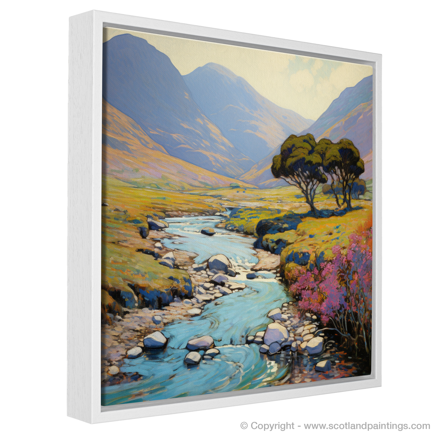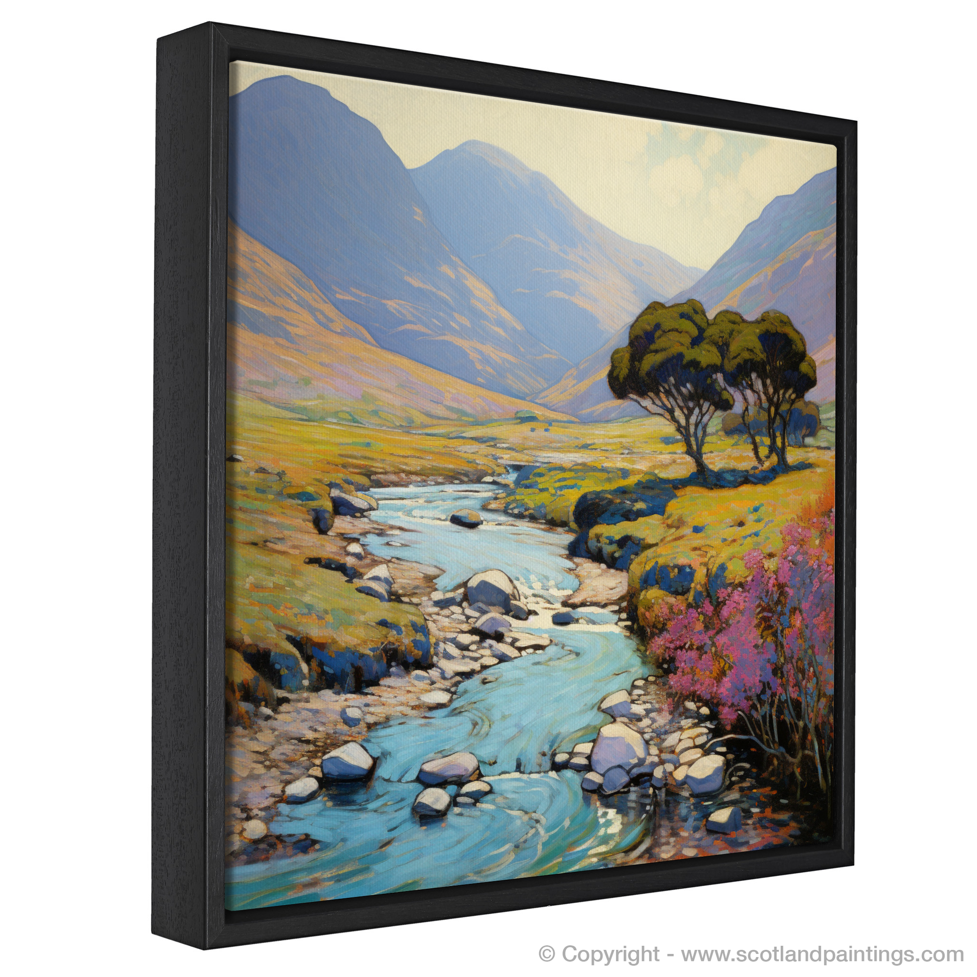 Allow the serene vistas of the Scottish Highlands to grace your space with this exquisite print, whispering tales of Glen Shiel's untouched beauty during the height of summer. The artwork captures a meandering river, its gleaming azure waters reflecting the soft light of a tranquil summer's day as it carves its way through the lush valley. Your gaze is gently drawn along the river, guided by the placement of smooth, rounded stones that rest in the shallow current and along its banks.
