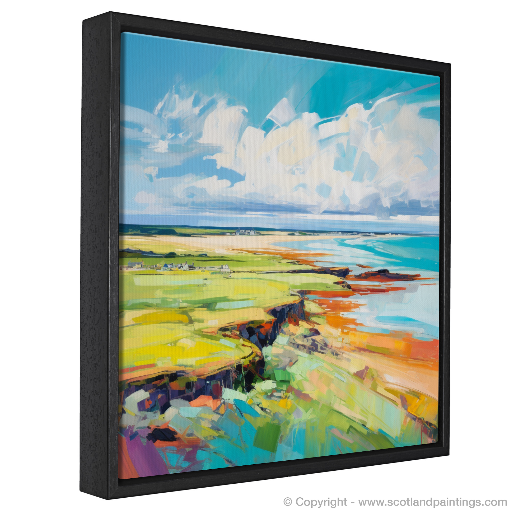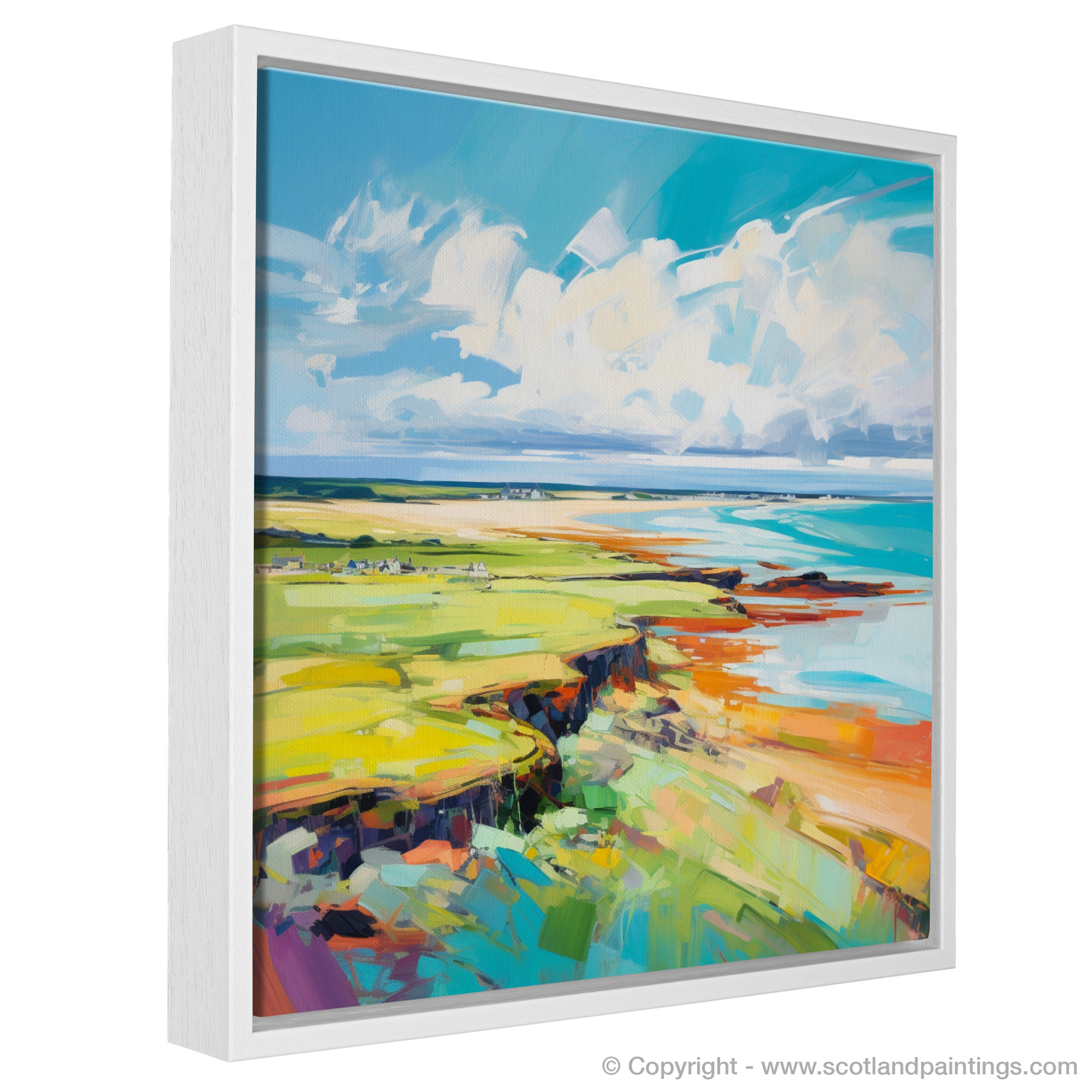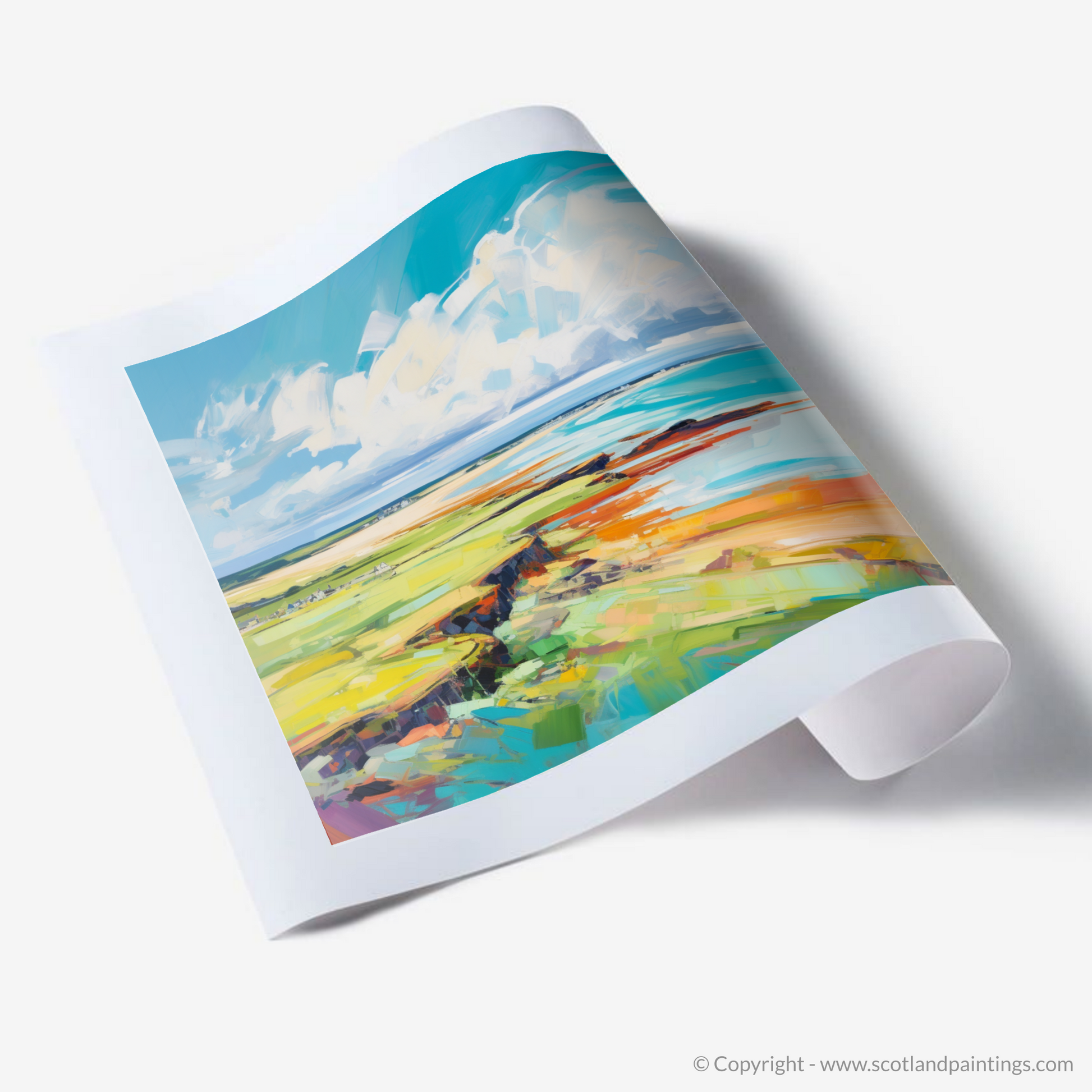 Immerse yourself in the vibrant essence of Orkney in summertime, captured brilliantly in this evocative modern print. Your gaze is first met by bold, sweeping skies where dynamic strokes of white and blue mingle, evoking the vast and ever-changing northern heavens. Beneath this magnificent canopy, the landscape unfolds in a symphony of colour; the rolling fields and cliffs of the Orkney Isles are transformed into an abstract tapestry.