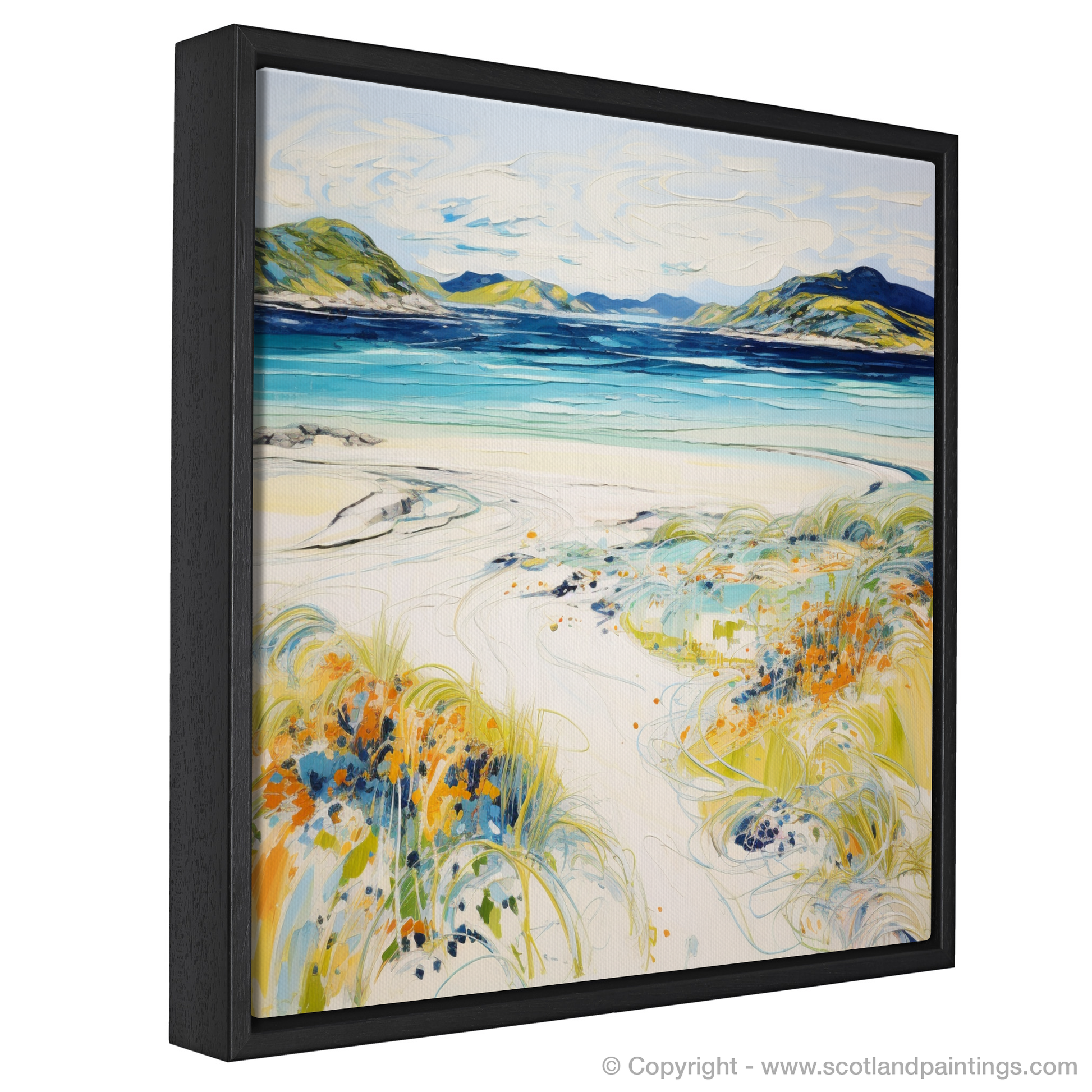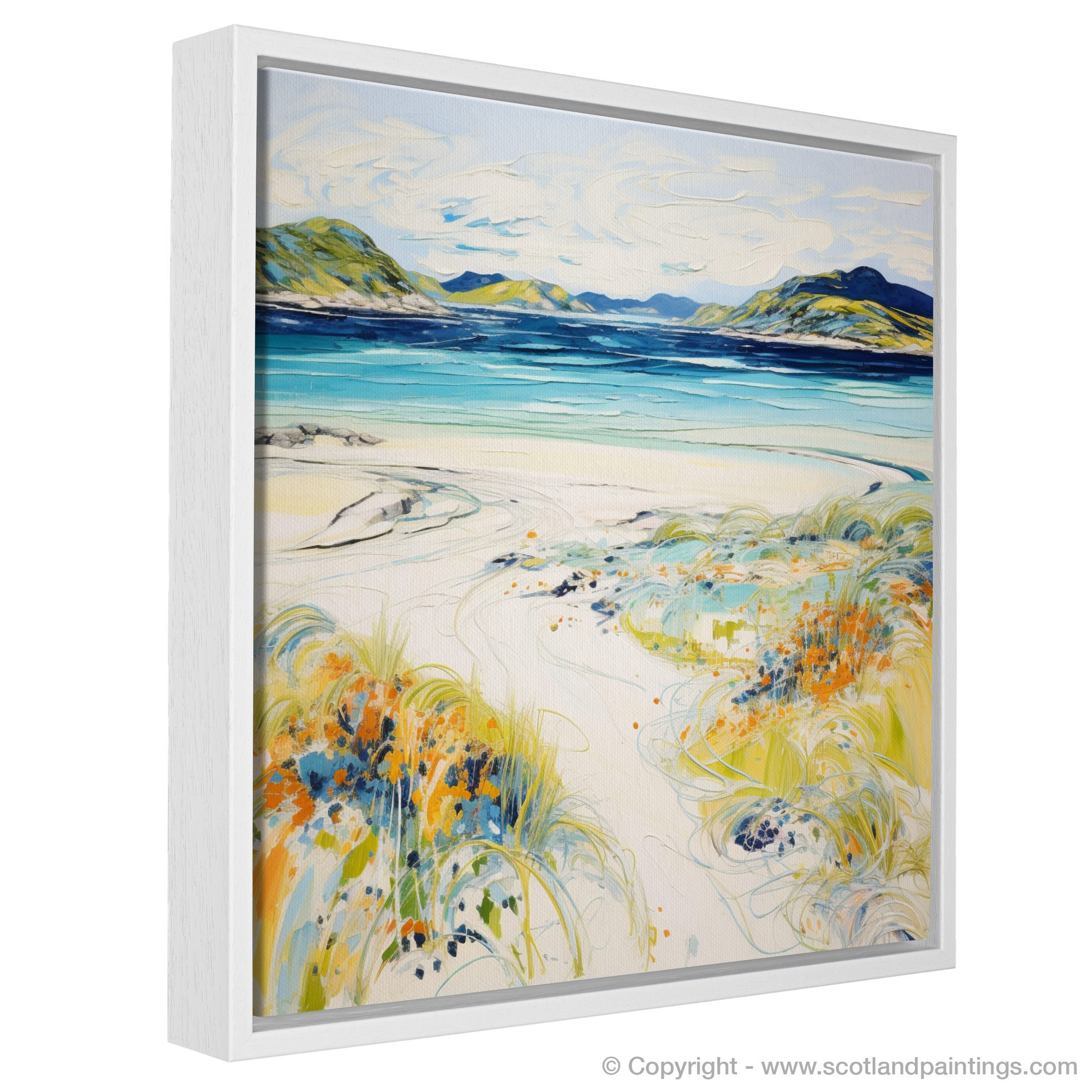Immerse yourself in the vibrant beauty of a Scottish summer with this evocative print, capturing the essence of Silver Sands of Morar. The print enlivens your space with its bold contemporary style, where fluid brushstrokes bring an almost palpable breeze that seems to rustle through the wild grasses and dance over the white sand.