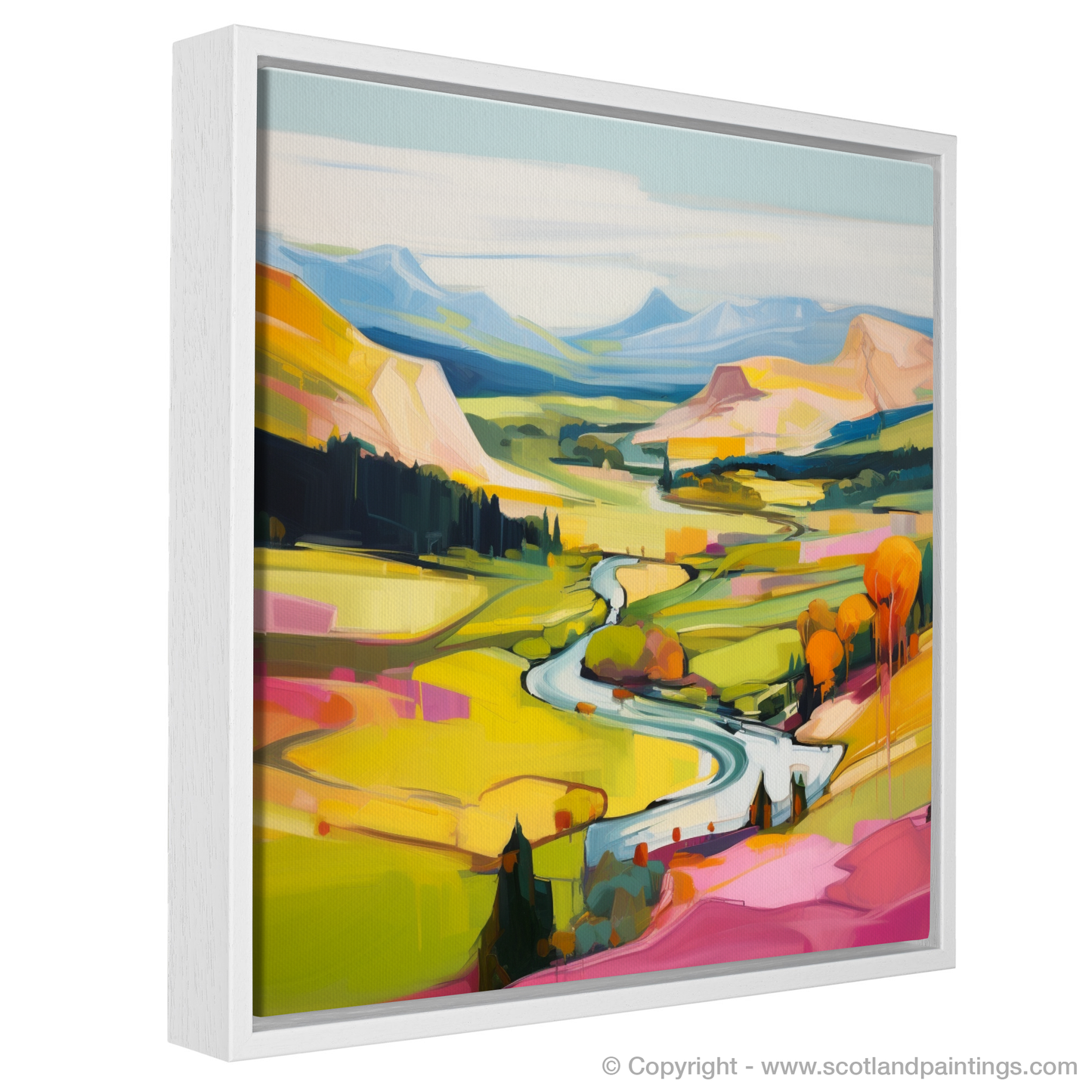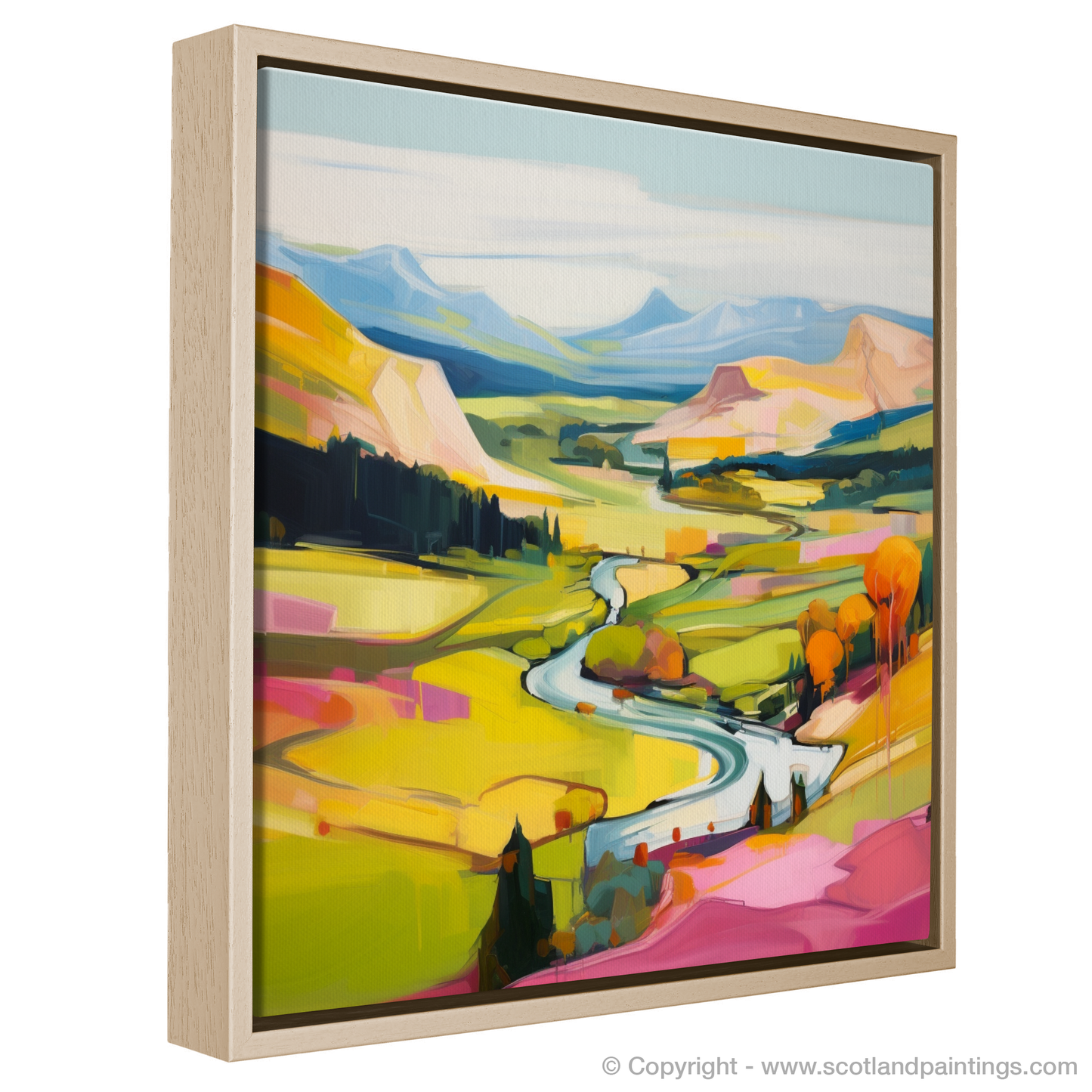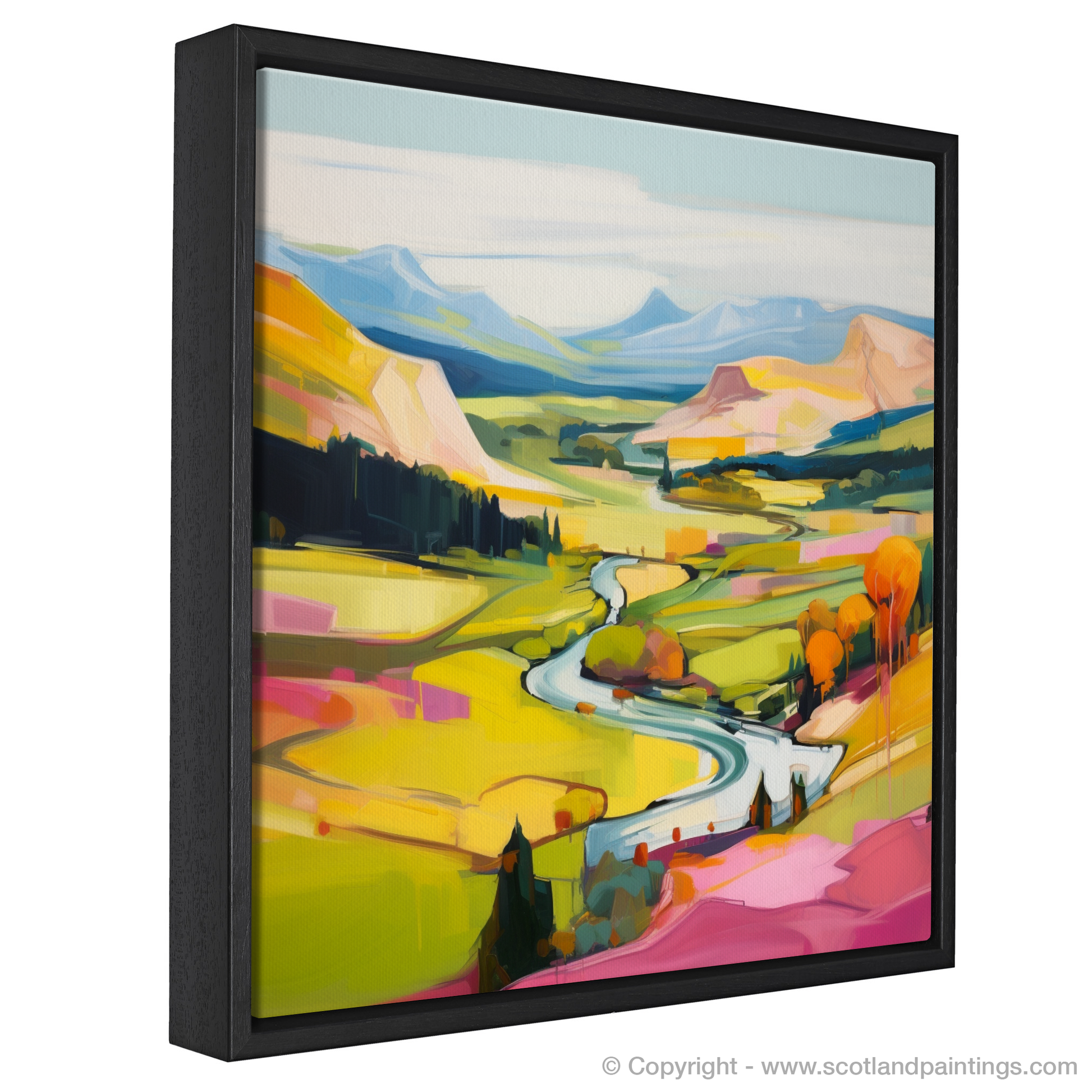 Step into a realm of visual splendour with this evocative print, where the vibrant hues of a Glenmore summer burst into life. The riveting landscape unfurls across the canvas, its modern style capturing the essence of Scotland's majestic highlands with an abstract twist. Broad, expressive brushstrokes define the rolling hills and sweeping valleys, while a dynamic river weaves through the composition like liquid silver, reflecting the gentle sky.