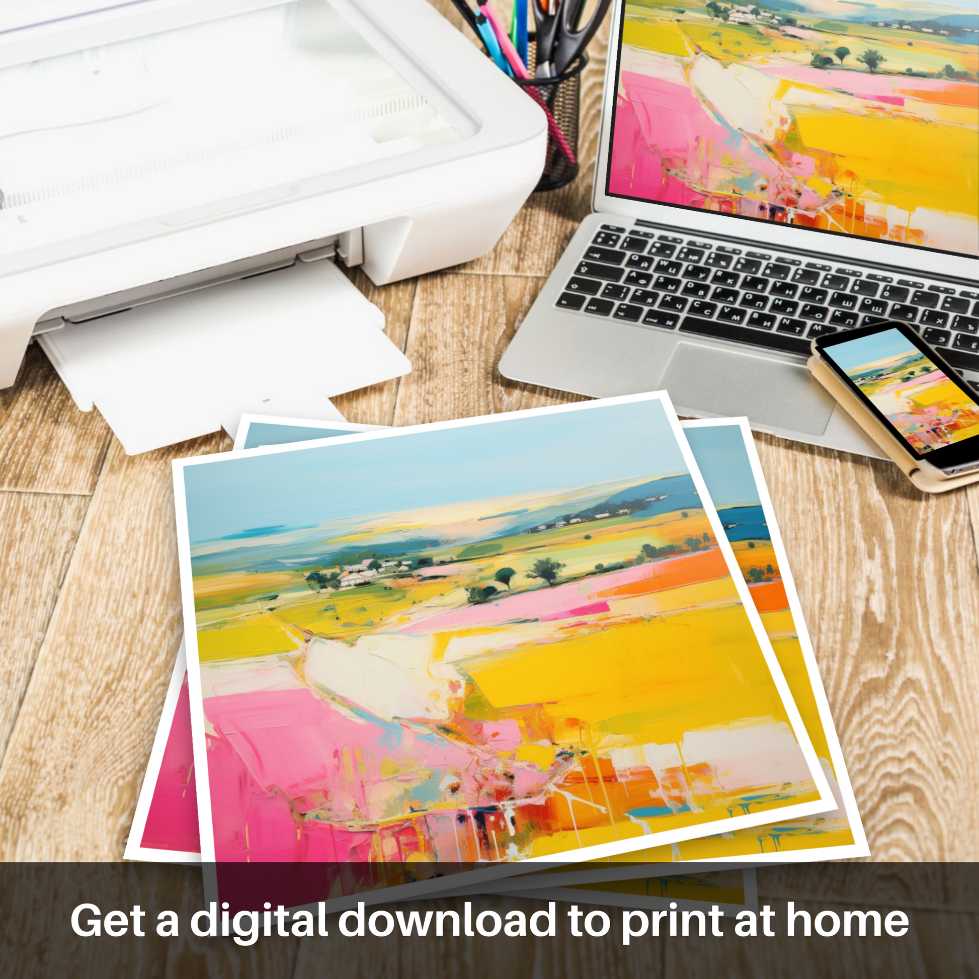 Hang this print on your wall and let it be a constant source of energy and inspiration, a piece that transcends the conventional to deliver a slice of Scottish summertime in all its abstracted glory.
