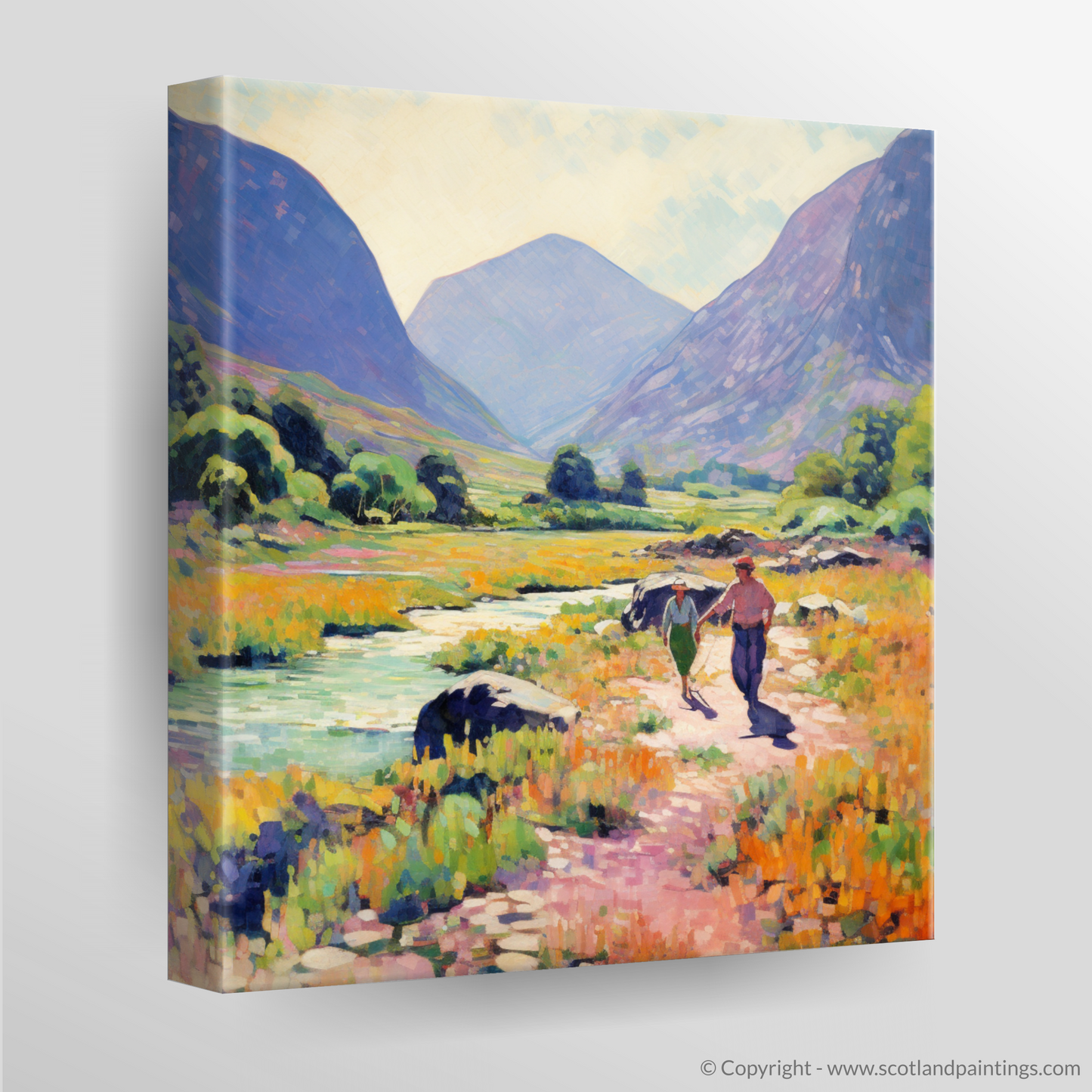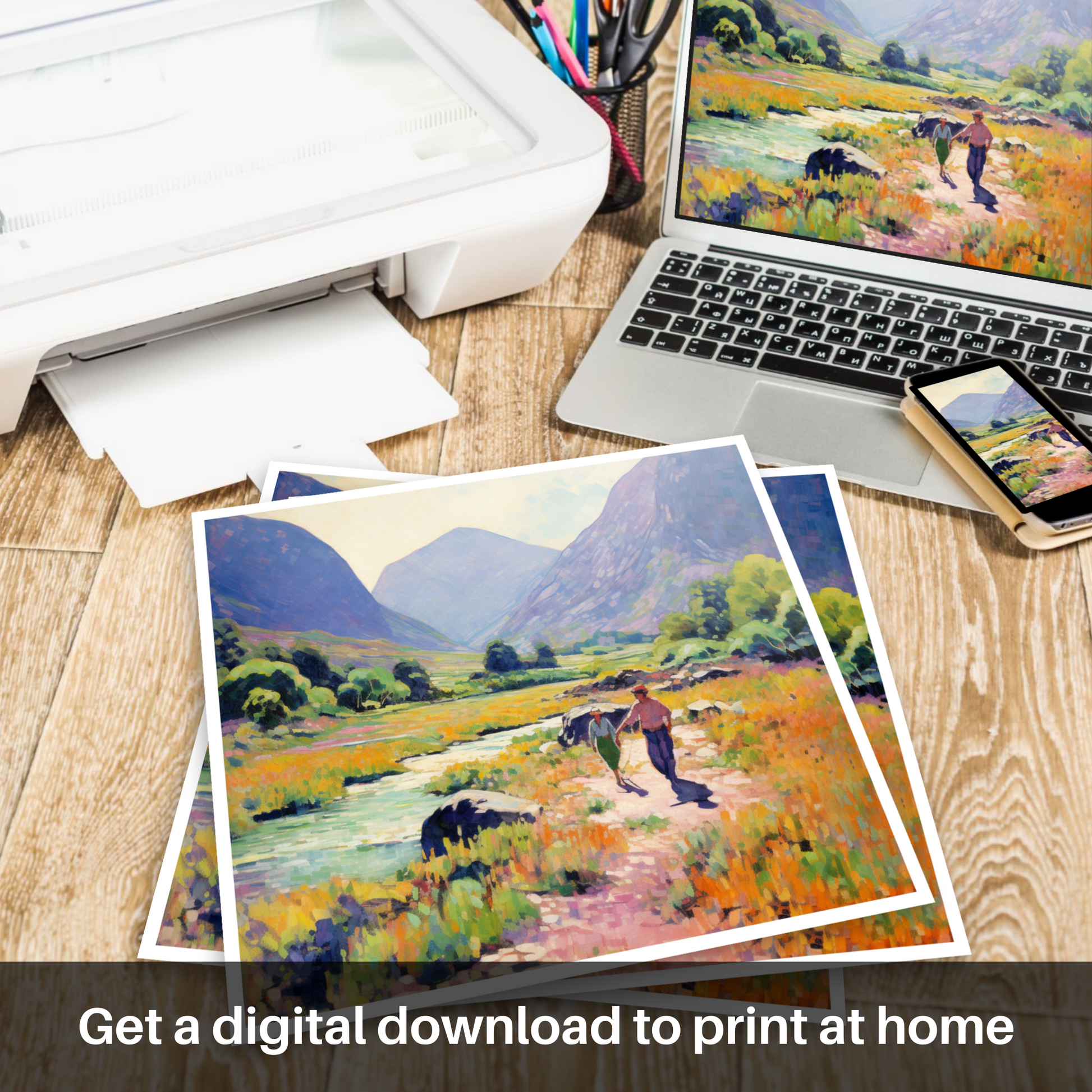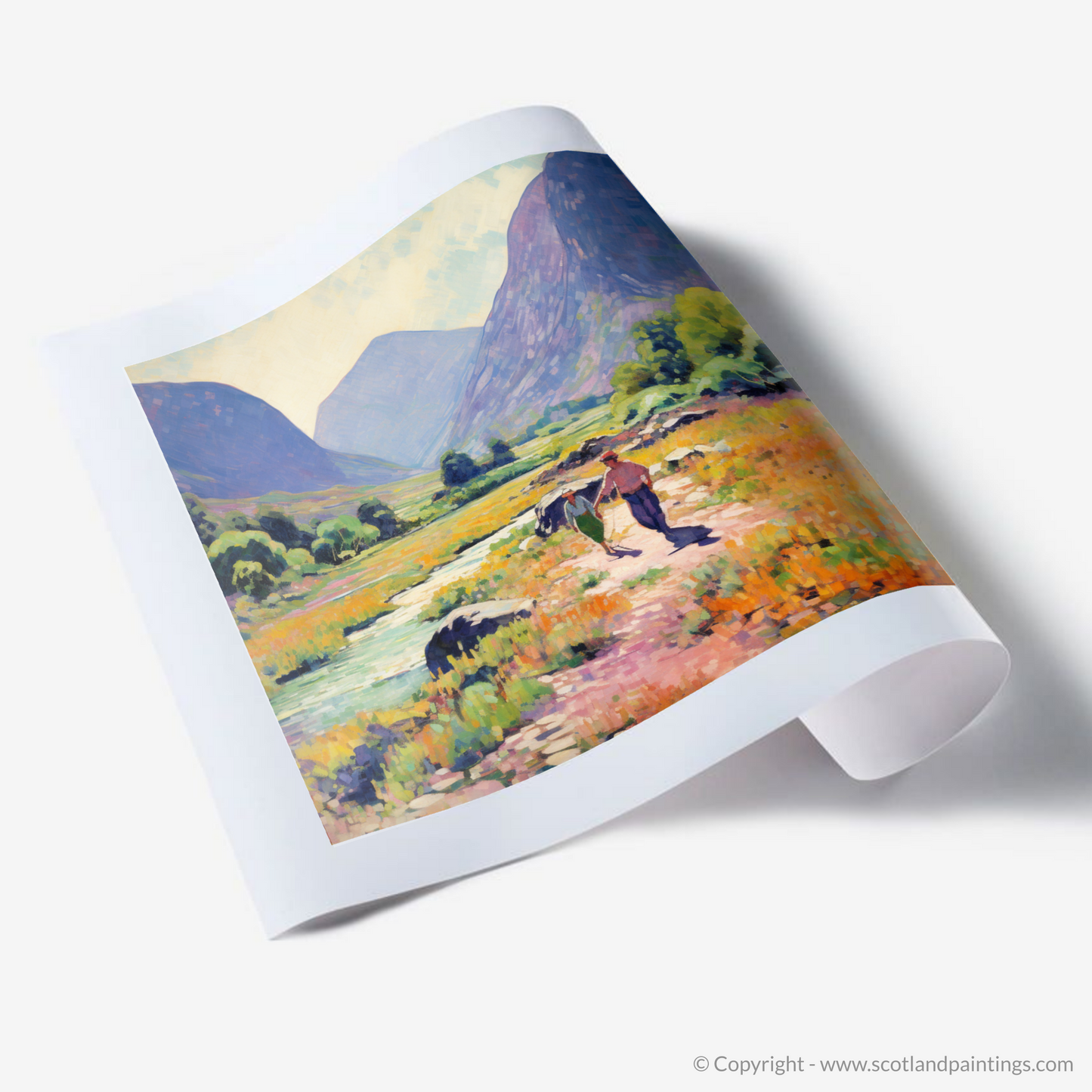 Immerse yourself in the timeless beauty of the Scottish Highlands with our evocative print, capturing the essence of a summer's day in the heart of Glencoe. With every glance, you are transported to a place where the air is clear and the vibrant colours of nature embrace you. This print resonates with the spirit of Impressionism, as it expertly renders a pair of walkers ambling leisurely along a sun-dappled path.
