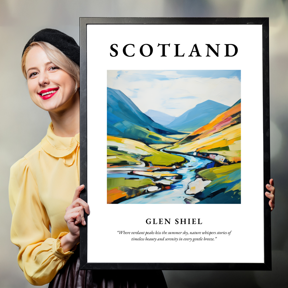At the heart of this extraordinary poster lies an abstract painting of Glen Shiel, where vibrant hues and bold forms converge to evoke the grandeur of this beloved Highland vista. The lush greens, sky blues, and hints of golden amber interplay to suggest the sweeping landscapes and dynamic terrains that define this spectacular location. Captured with a flair for the abstract style, the painting invites viewers to interpret the rugged beauty and evocative energy of Glen Shiel, making it an ideal addition for those who cherish Scotland in all its natural splendour or have a special connection to this majestic landscape.