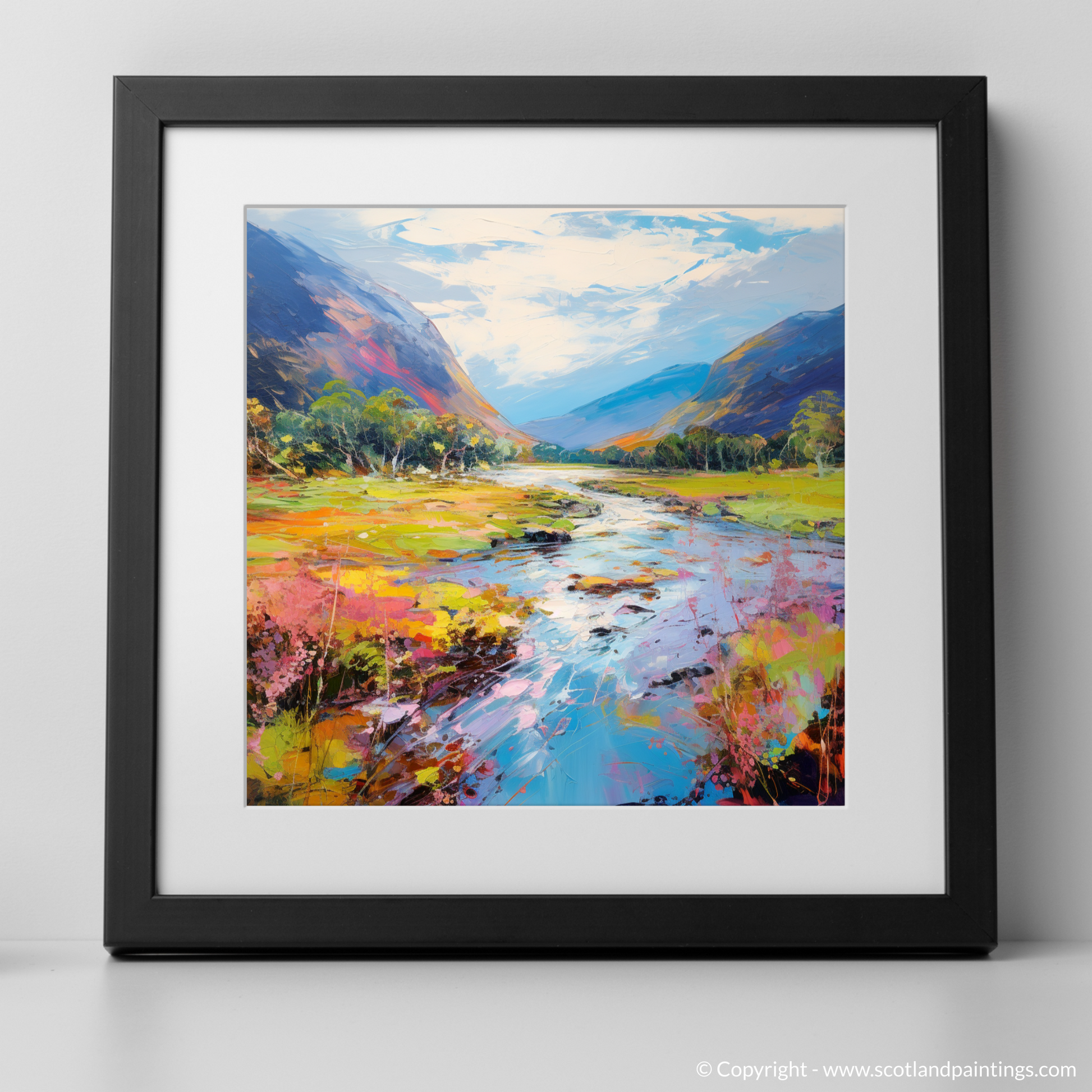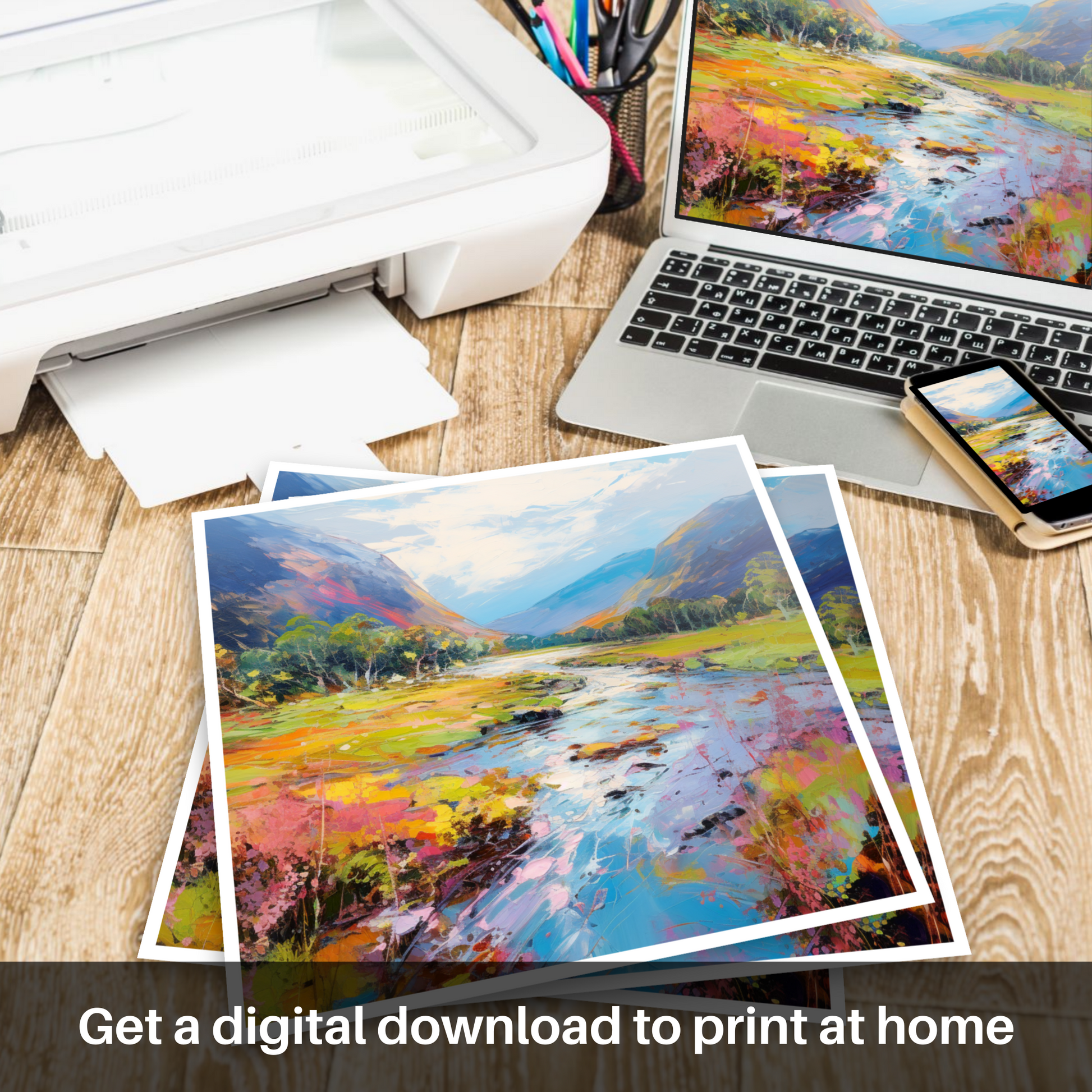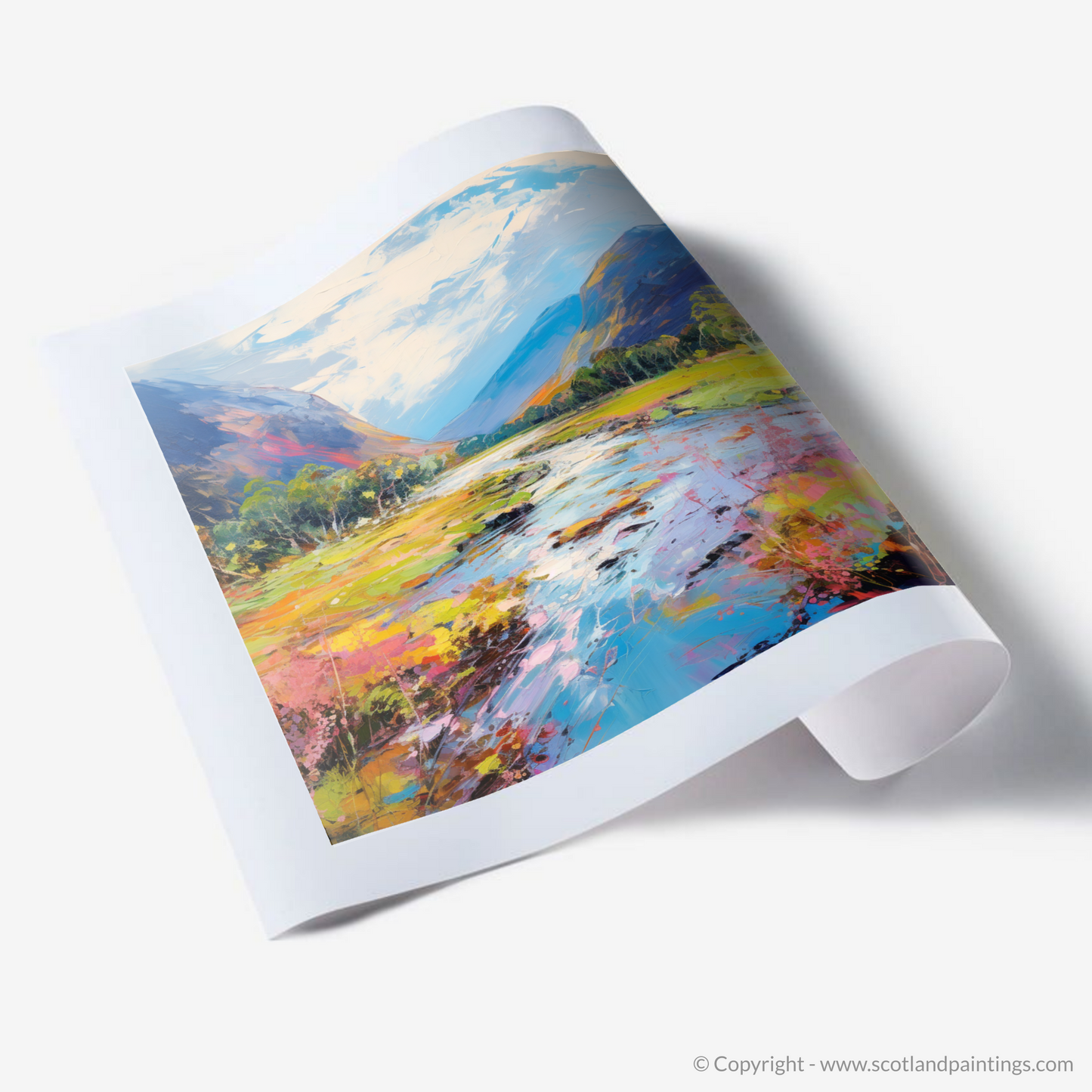 Immerse yourself in the vibrant hues of a Highland summer with this exquisite print, capturing the essence of River Coe running through the Glencoe Valley. The artwork, steeped in the timeless tradition of Impressionism, brings to life the sweeping drama of the Scottish landscape with a modern twist.