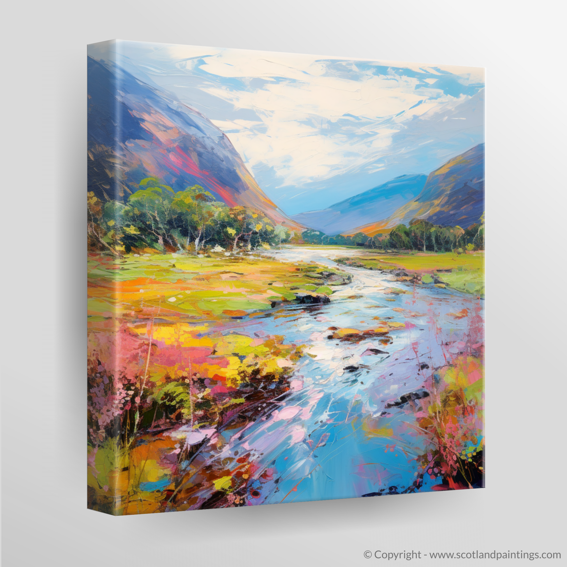 The foreground is ablaze with a tapestry of warm pinks and rich, fiery oranges, mimicking the wild heather and colourful flora that carpet the valley floor. These lively strokes of colour contrast harmoniously with the cool, reflective blues and purples that dance upon the river's surface, inviting the viewer to envisage the crisp, refreshing waters of the Coe.