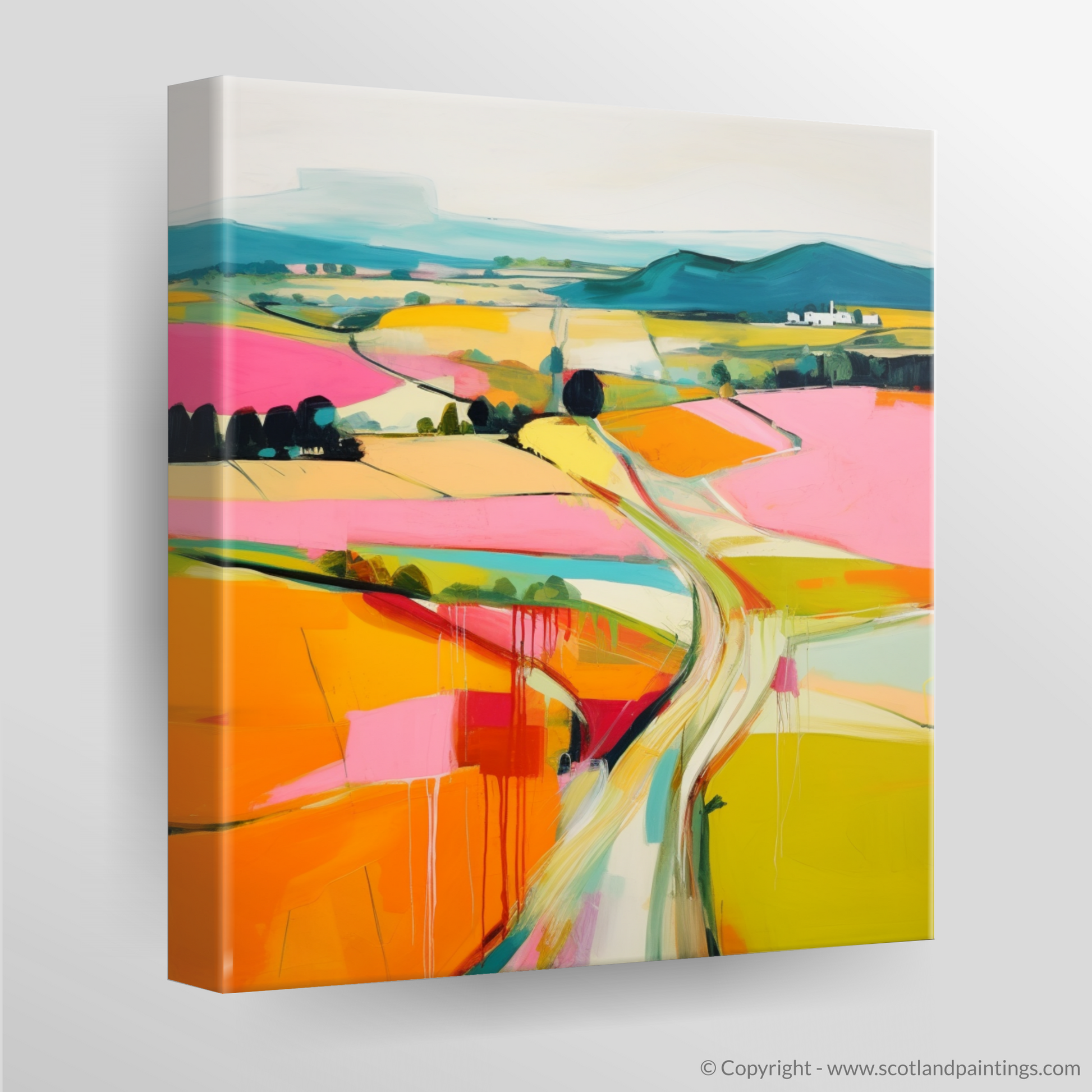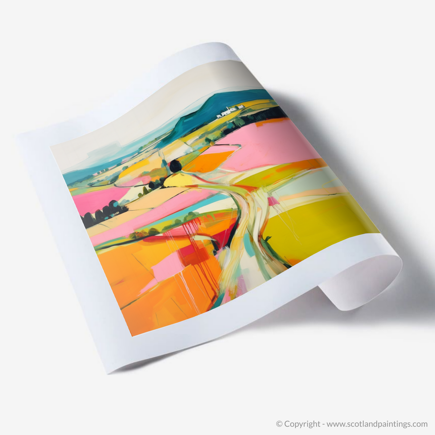 The perspective draws your gaze along the meandering roads, symbolising a journey - both literal and metaphorical - through the heart of Scotland's enchanting countryside. Rolling fields are reimagined with an audacious palette, where traditional greens are replaced with splashes of electric pink, fiery orange, and sun-kissed yellow, echoing the boundless energy of a midsummer's day.