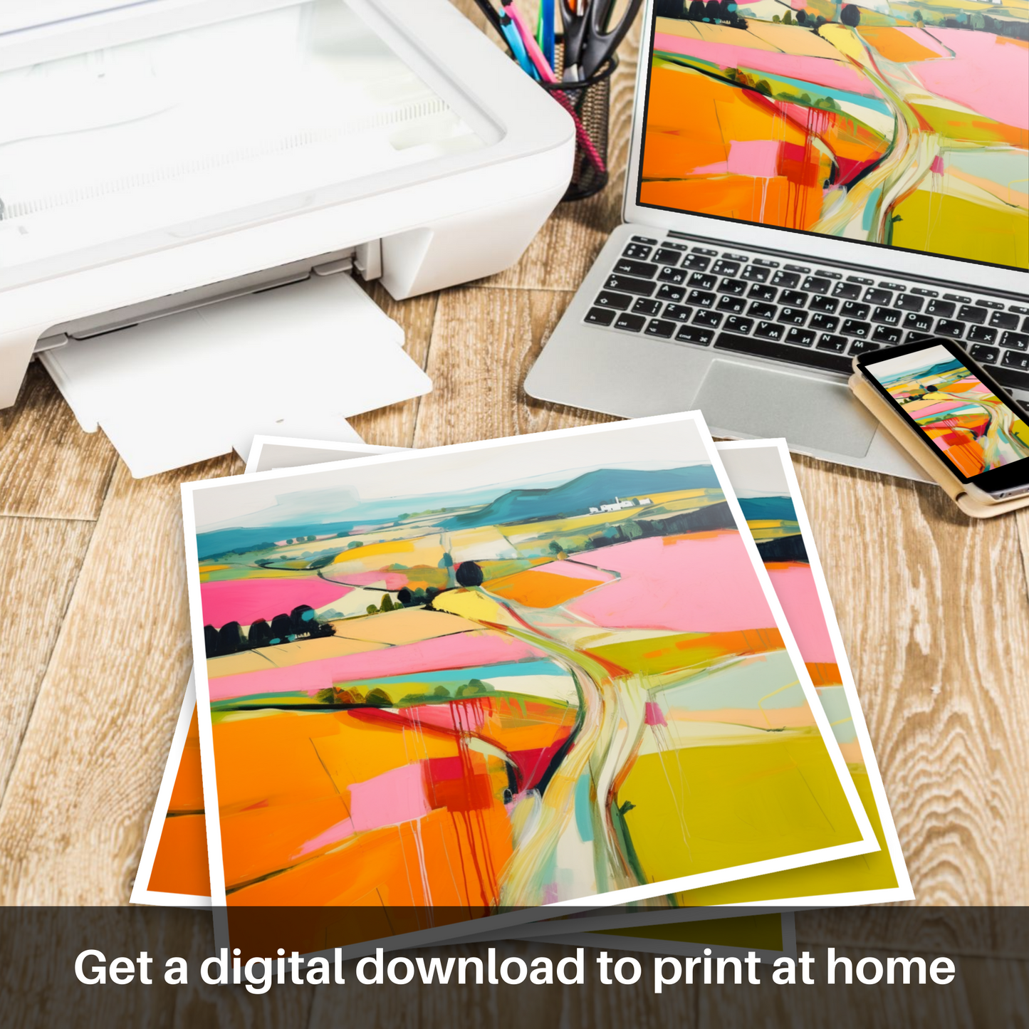 Embrace the vibrancy of the Scottish summer with a striking modern rendition of Glenlivet, Moray. Bold colours sweep across this print, transforming the pastoral landscape into an exuberant canvas alive with verve and vividness. Glimpse the transcendent quality of the summer skies, where the azure tones blend seamlessly into the earthy greens of distant hills, heralding a scene that is perennial yet eternally captivating.