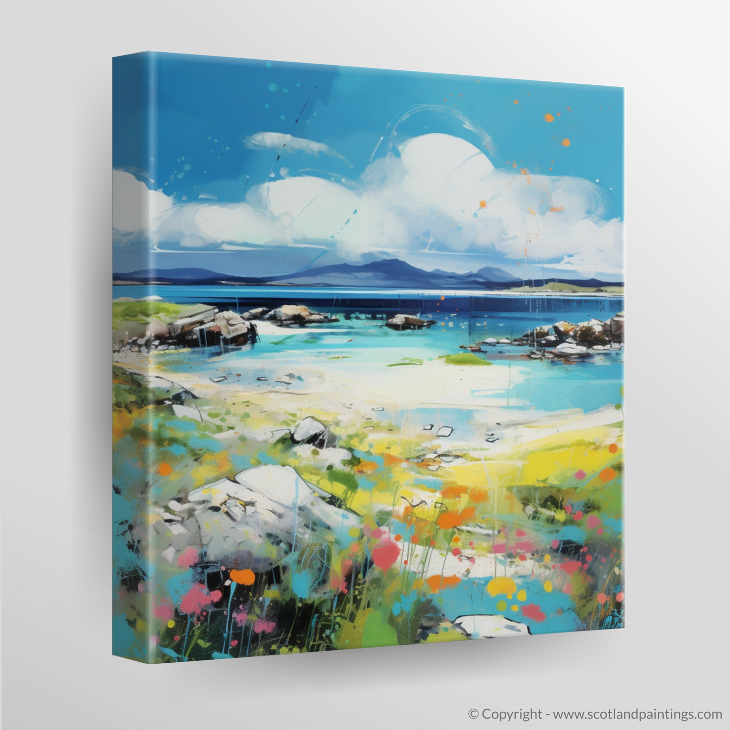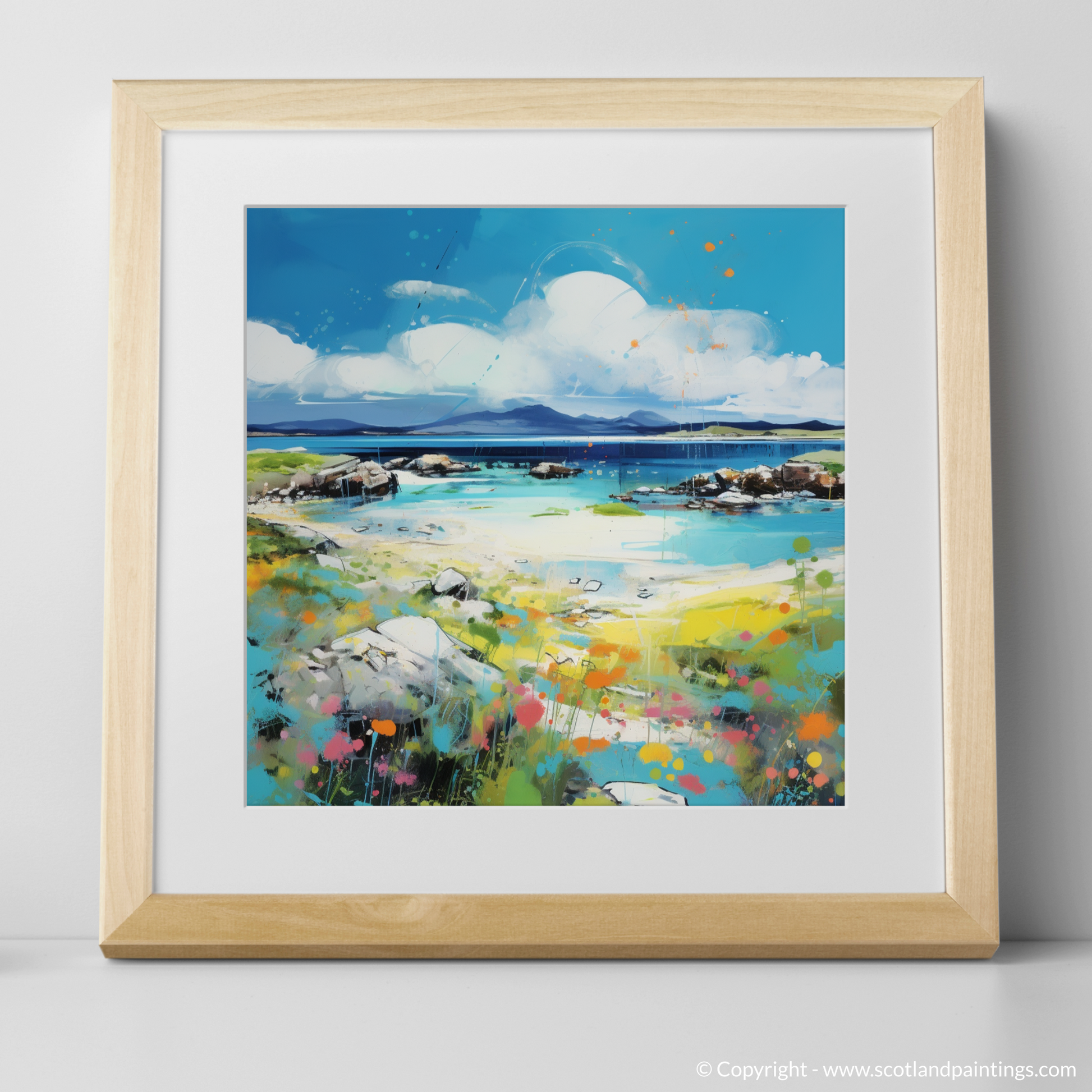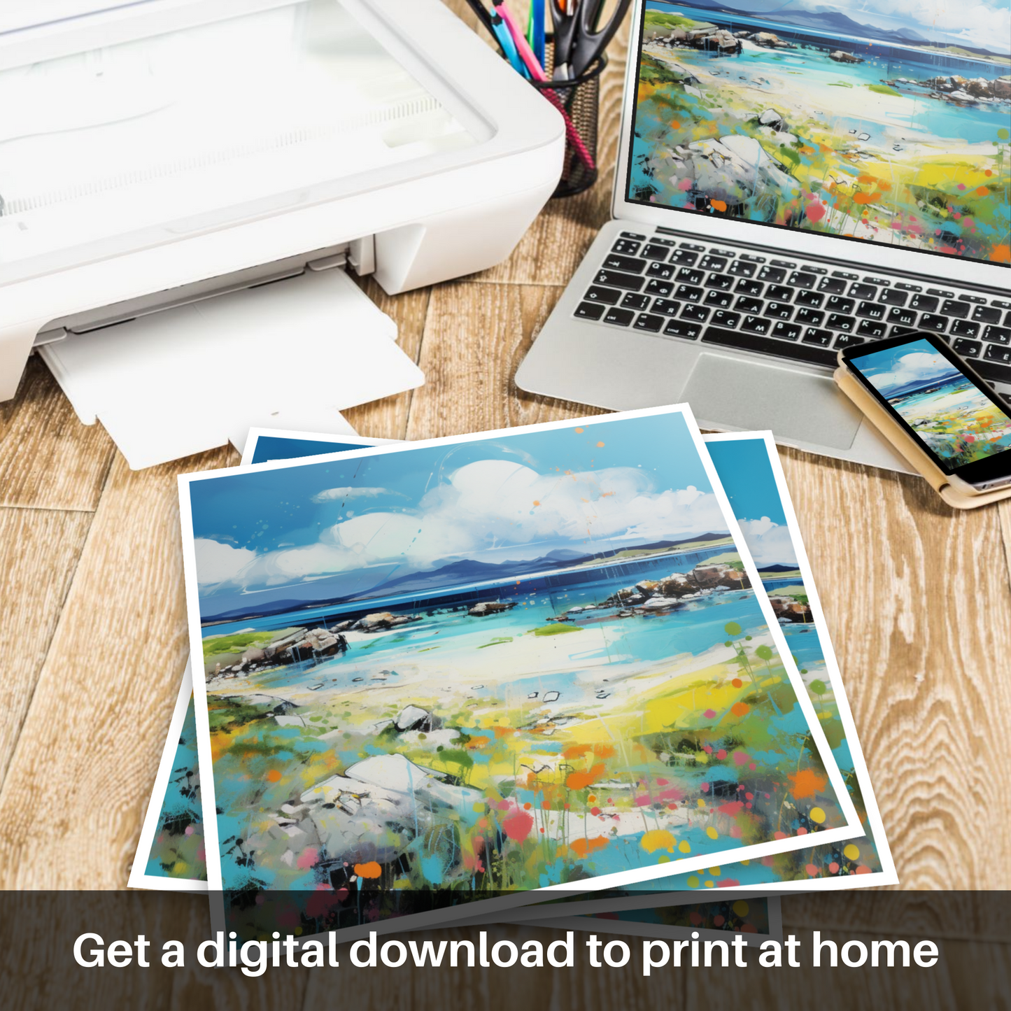 Escape to the serene beauty of the Inner Hebrides with this captivating abstract interpretation of the Isle of Gigha in summertime. Revel in the vivid fusion of azure and turquoise that dance across the canvas, evoking the crystalline waters that lap gently onto the island's secluded shores. Splashes of bright, zesty orange and warm coral tones intermingle with the cool hues, mirroring the wildflowers that speckle the rolling hills during the summer bloom.