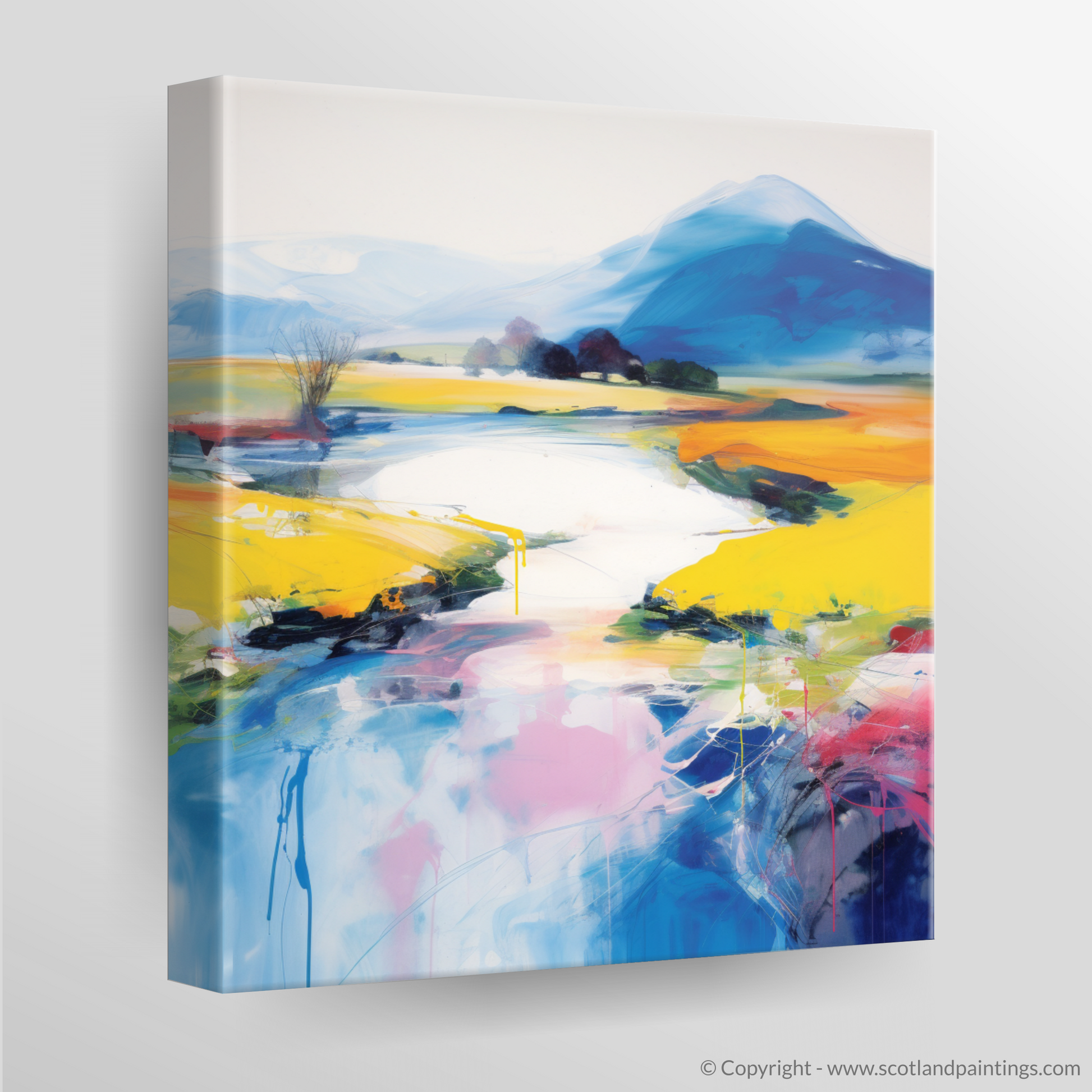 Nature's forms are suggested rather than explicitly rendered. Gentle slopes and tender silhouettes of distant trees bend and blend within the scene, provoking the observer's imagination to drift towards the Scottish highlands. Flecks of white break through the colour, mirroring the sparkle of sunlight dancing on the river's surface or perhaps the fleeting clouds overhead.