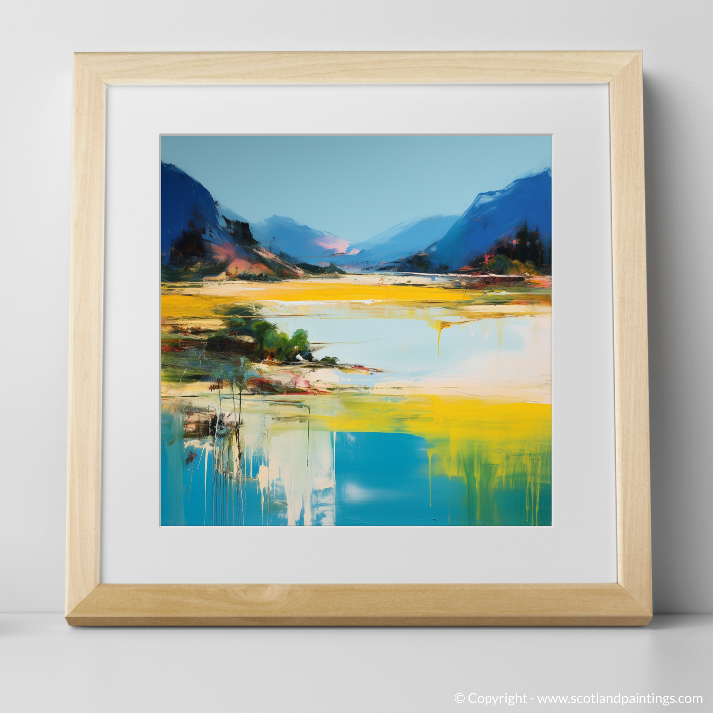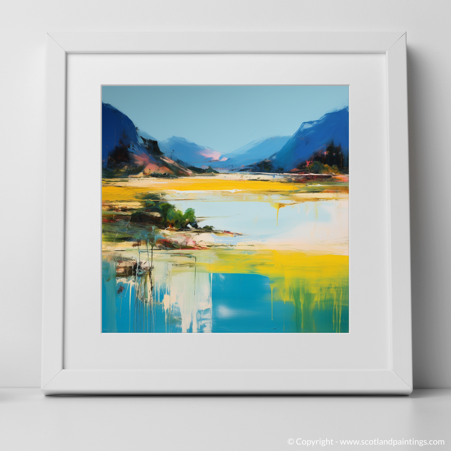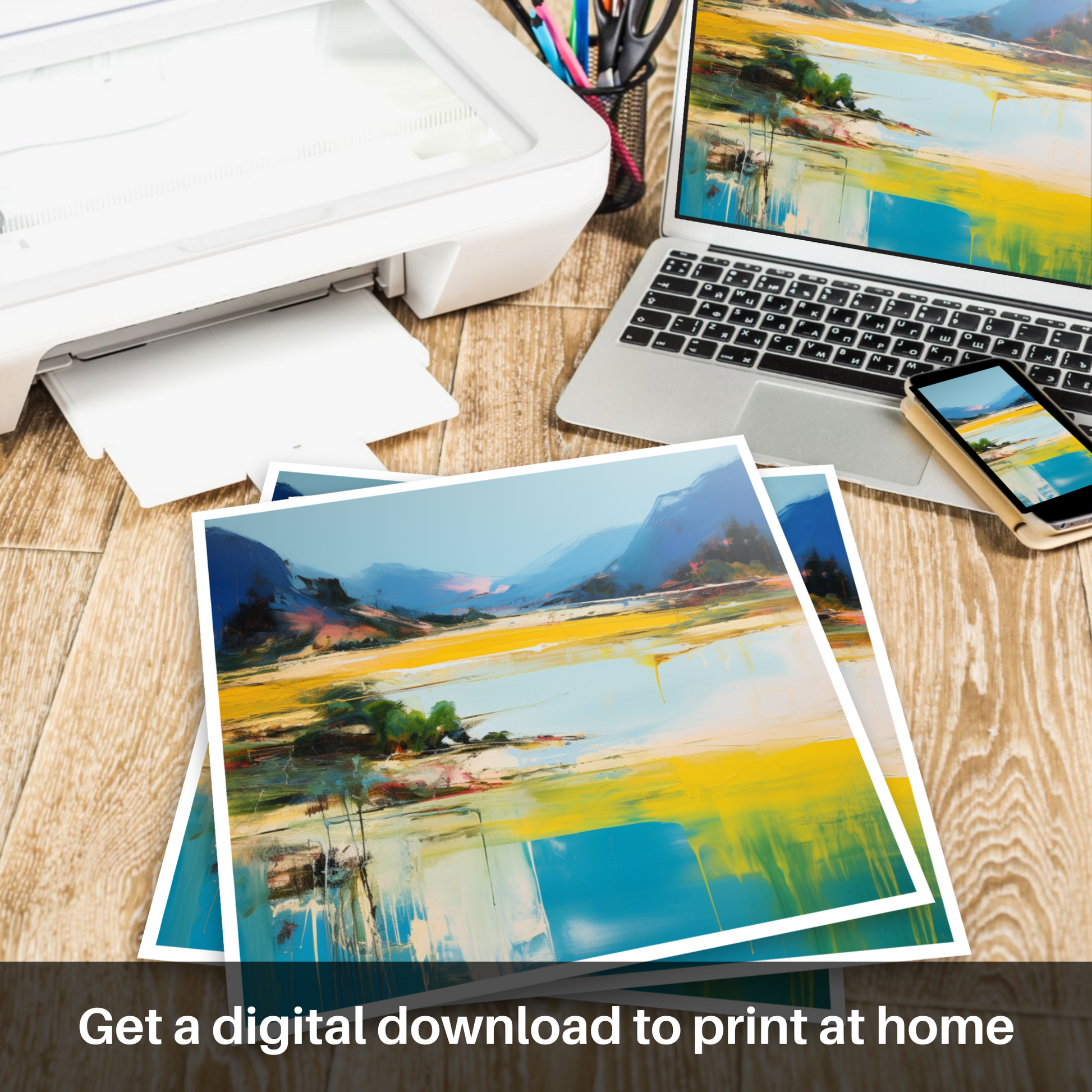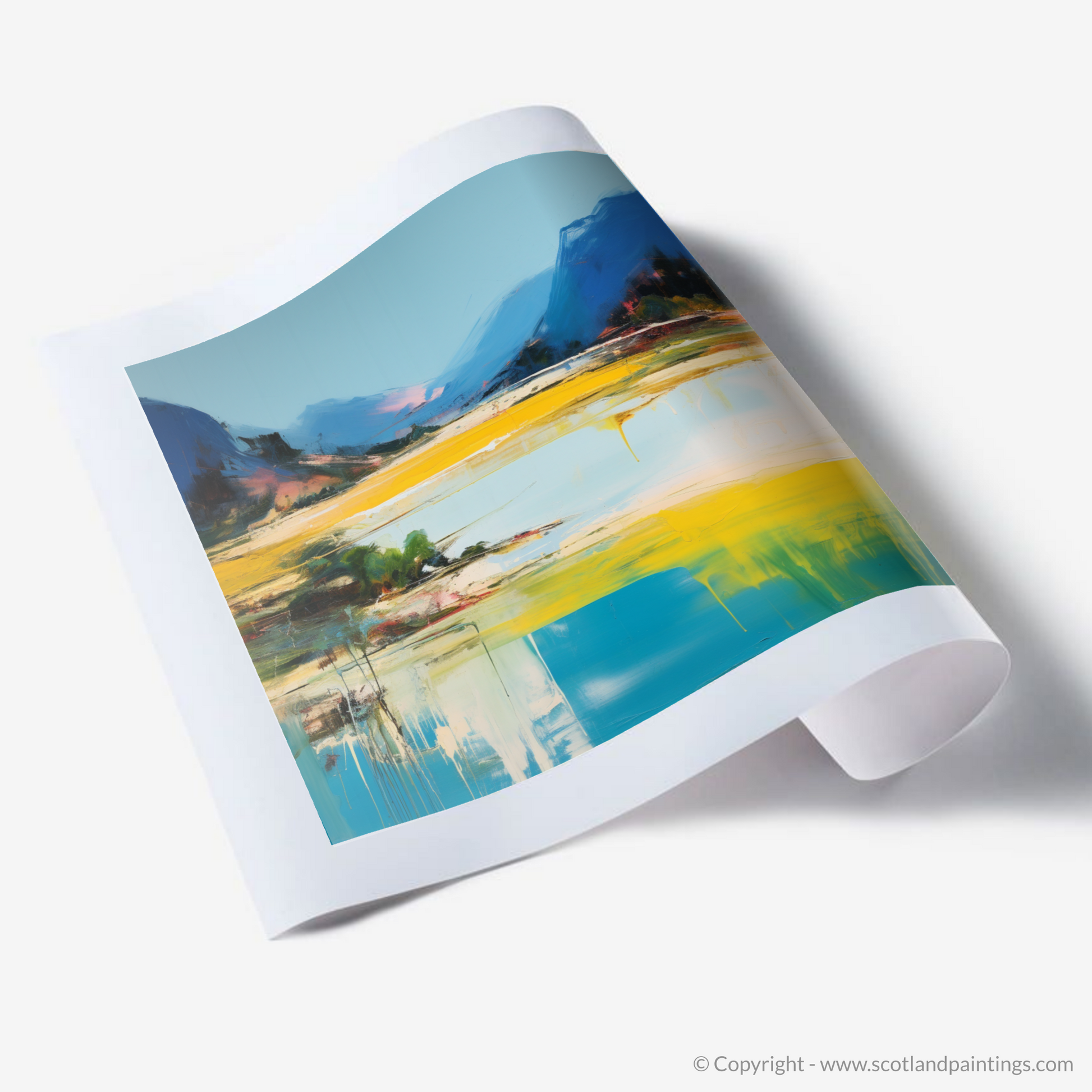 Let the essence of Scottish summertime enliven your space with this spellbinding abstract print, capturing the vibrant soul of Loch Achray. The piece is an amalgamation of exuberant yellows that dance across the canvas, representing the warmth and vivacity of summer days. Hues of cool azure mirror the refreshing waters of the loch, while deep midnight blues hint at the shadows cast by the surrounding hills during the long, lingering twilights.