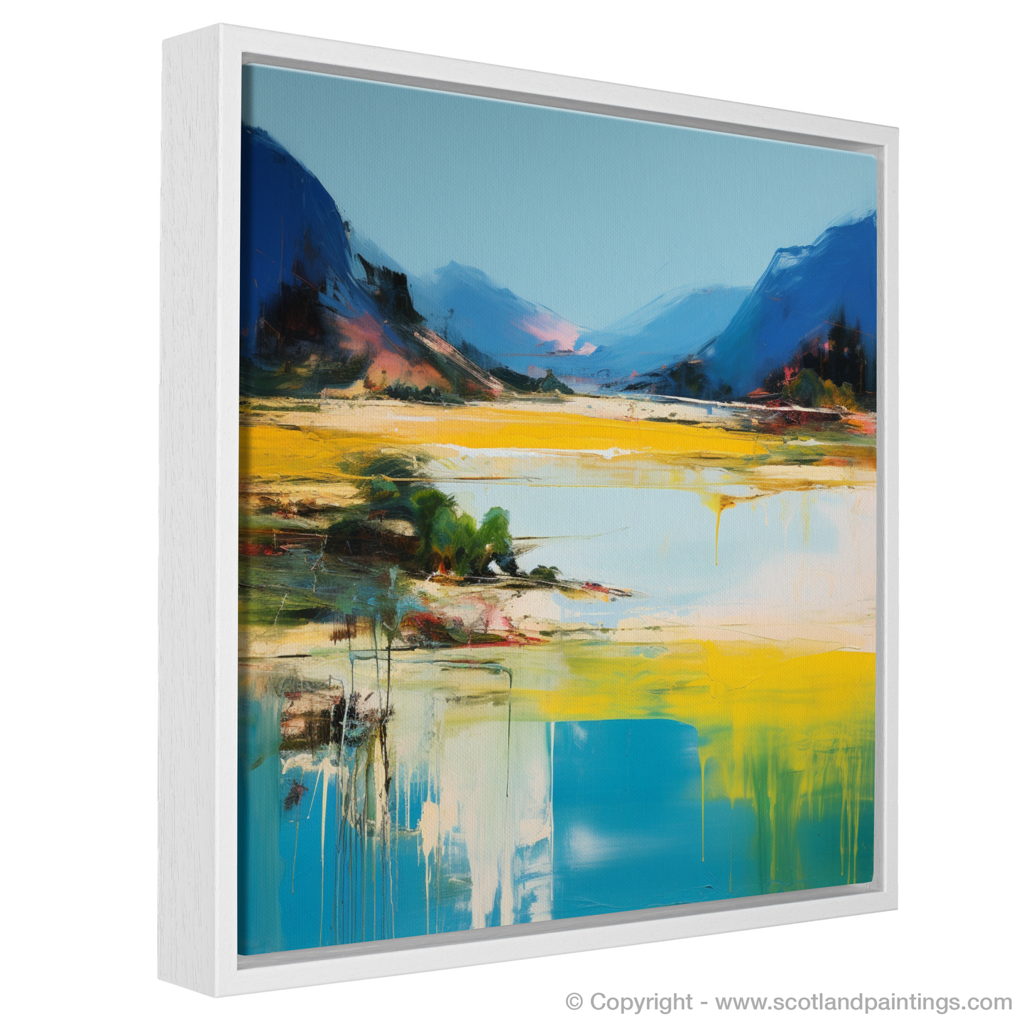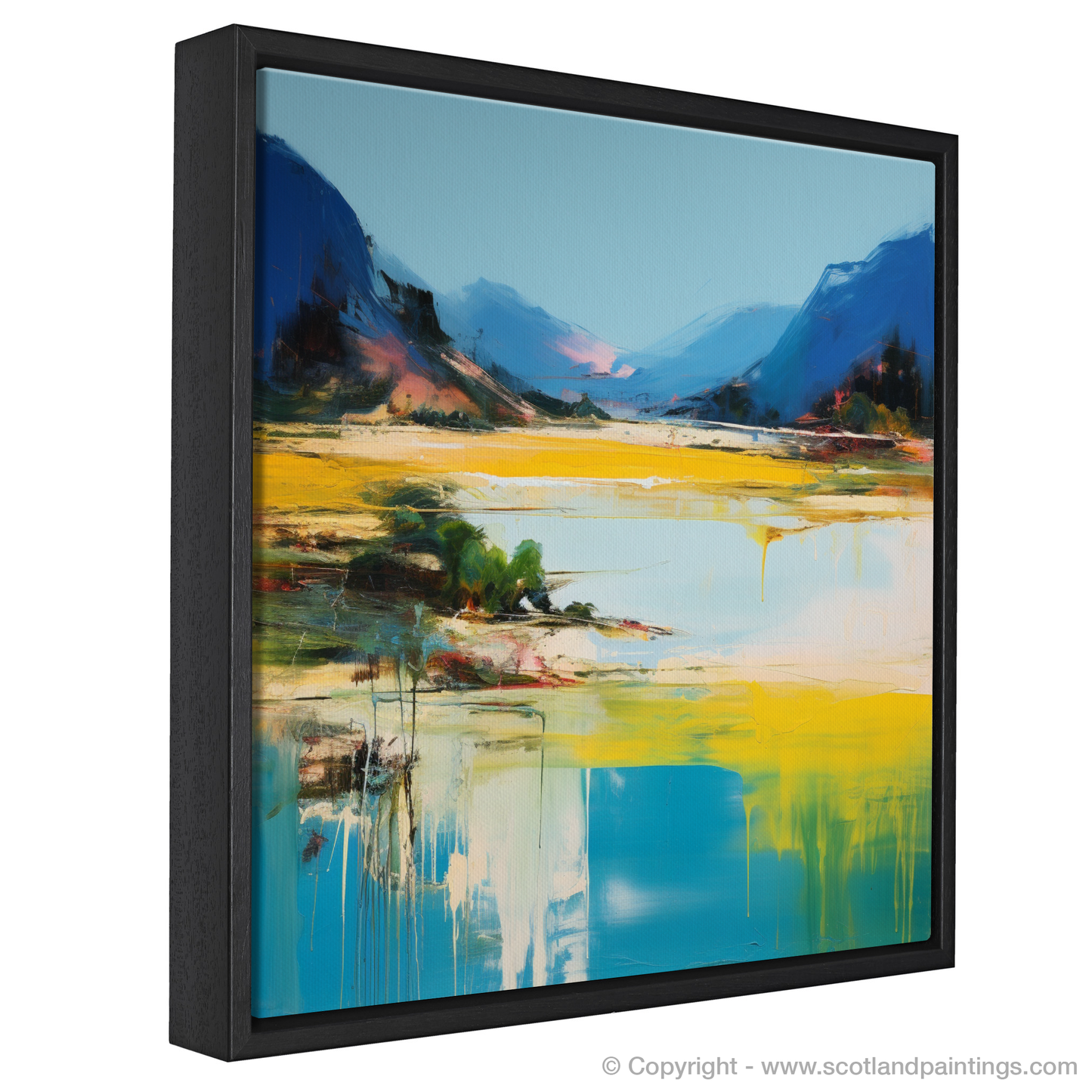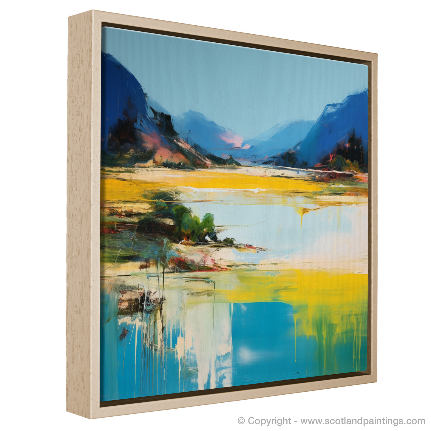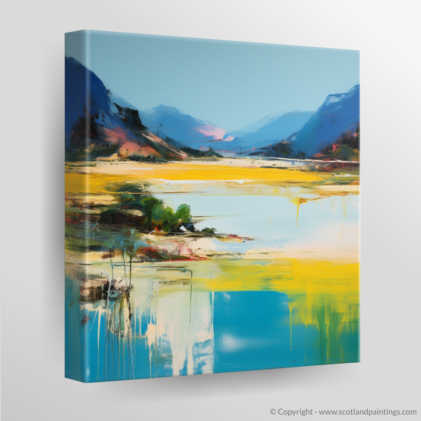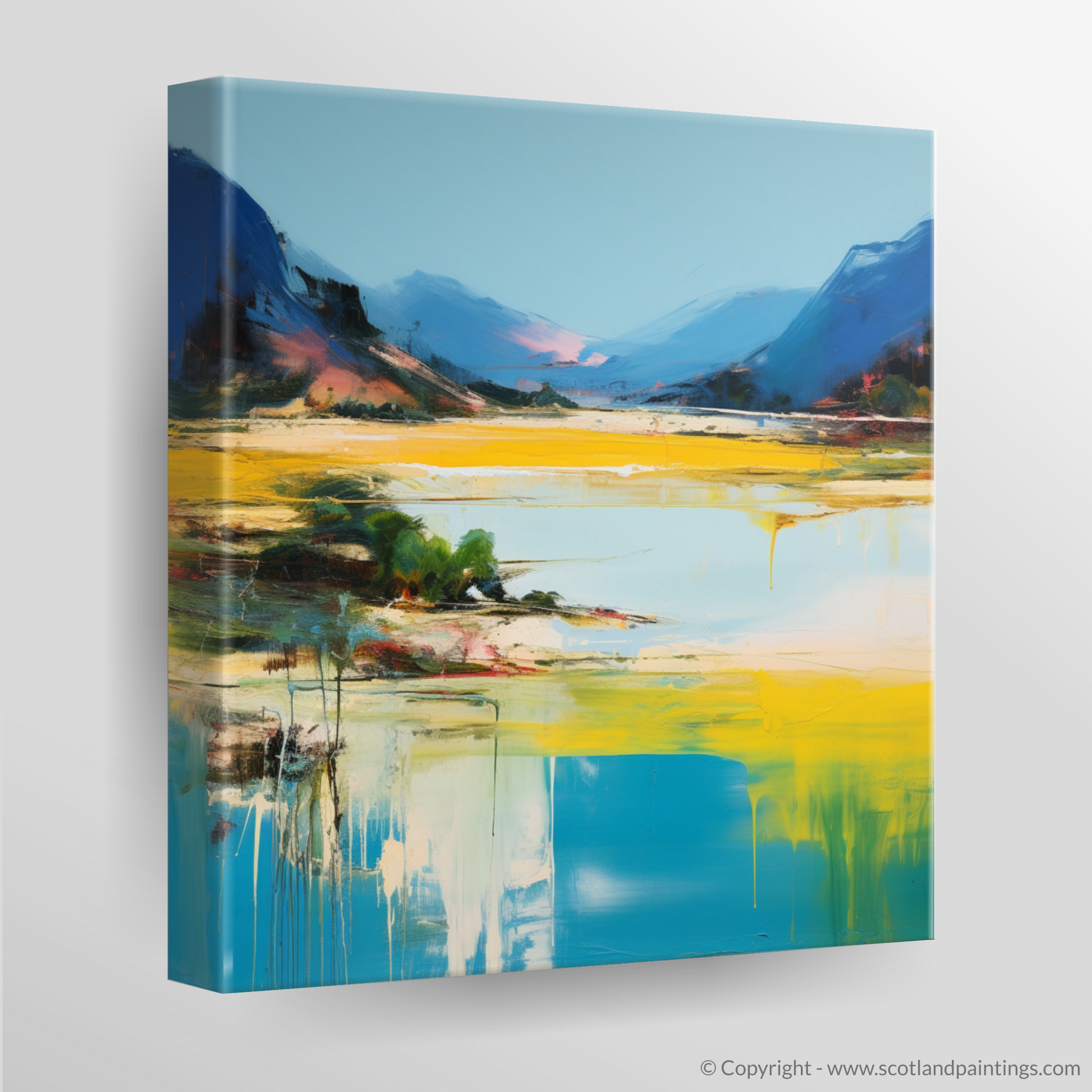 Let the essence of Scottish summertime enliven your space with this spellbinding abstract print, capturing the vibrant soul of Loch Achray. The piece is an amalgamation of exuberant yellows that dance across the canvas, representing the warmth and vivacity of summer days. Hues of cool azure mirror the refreshing waters of the loch, while deep midnight blues hint at the shadows cast by the surrounding hills during the long, lingering twilights.