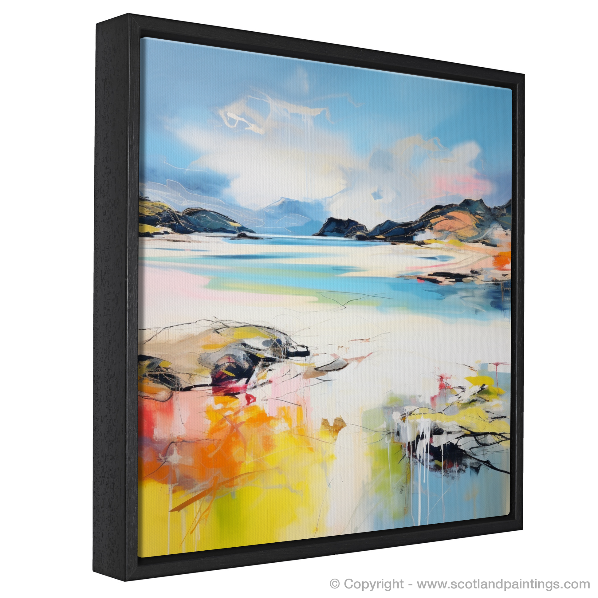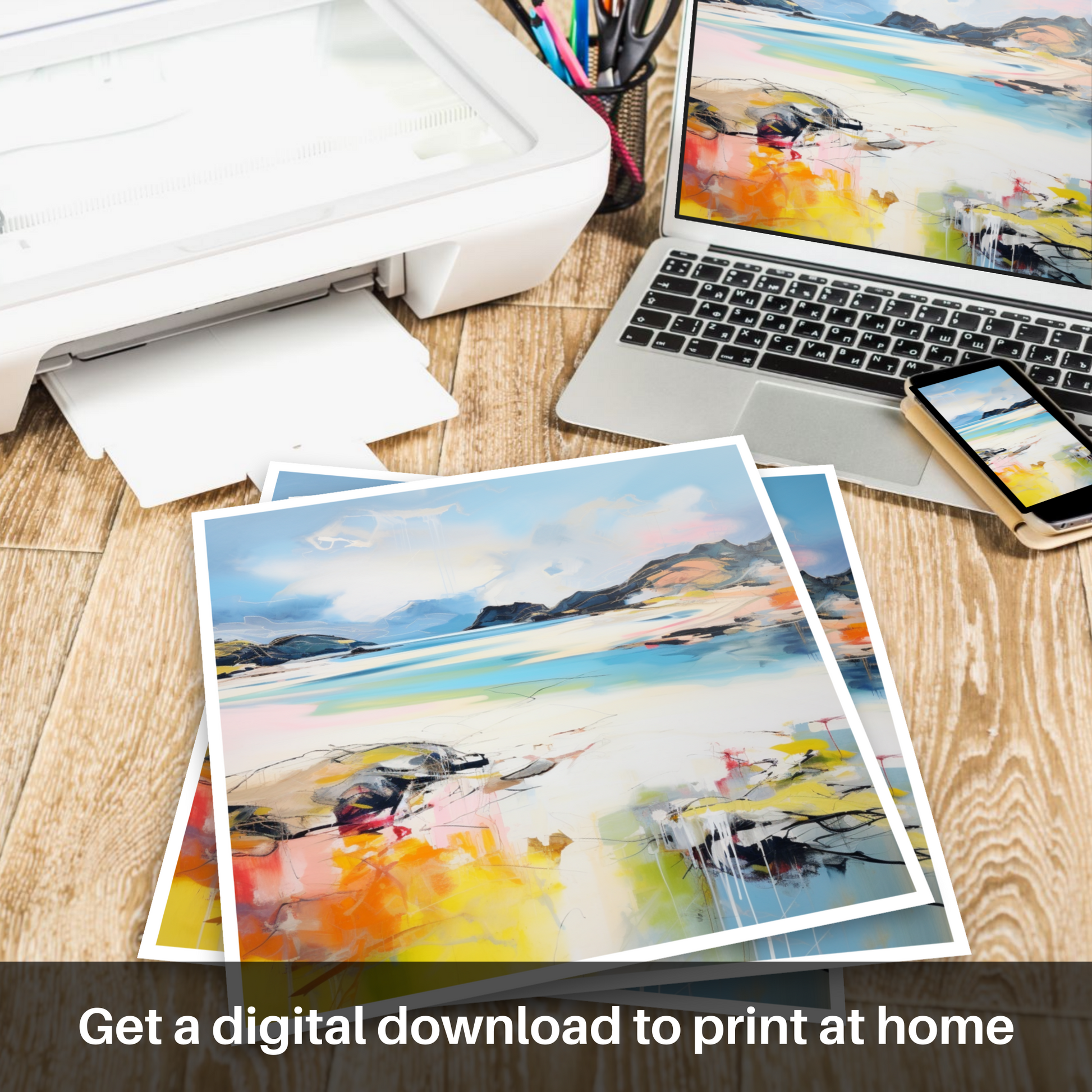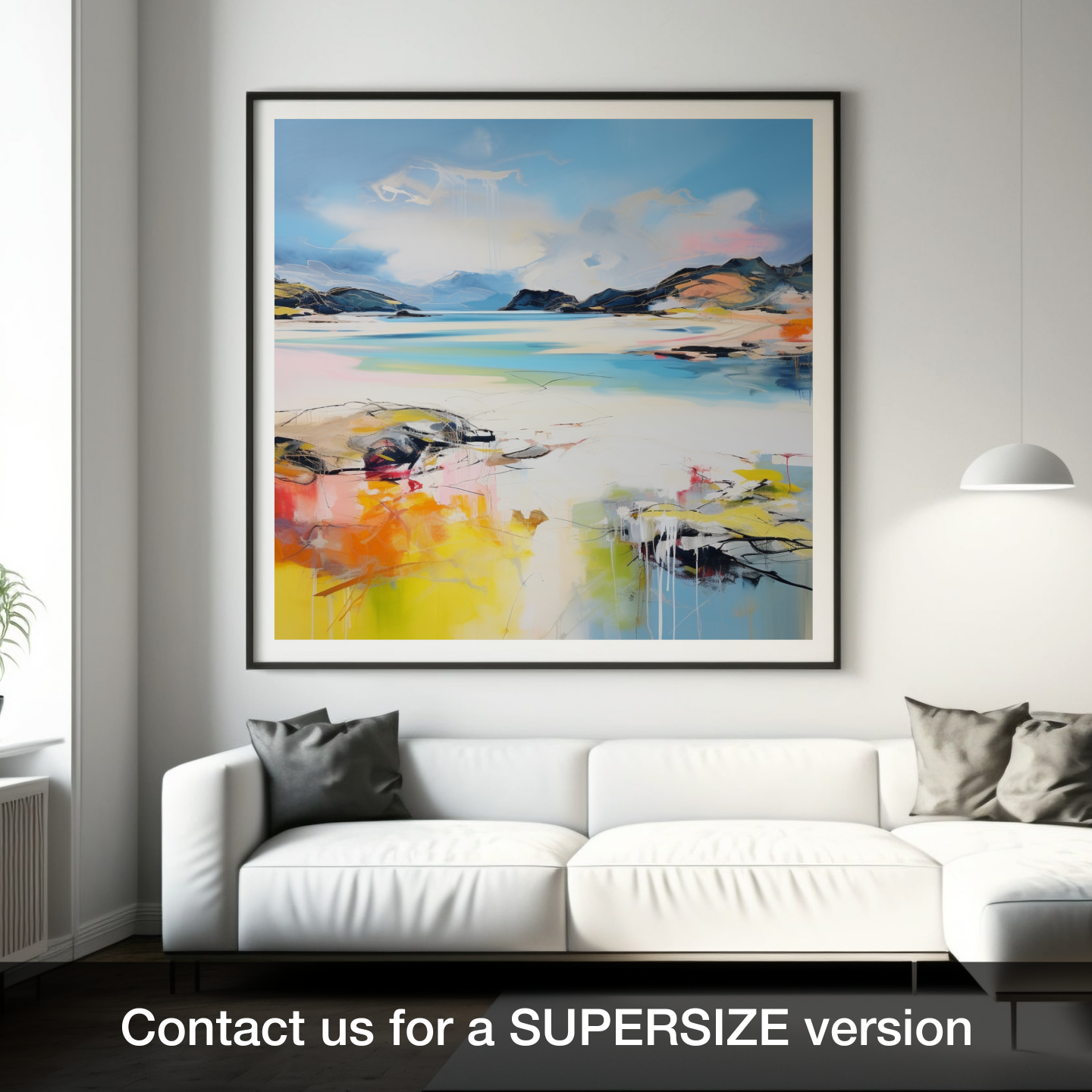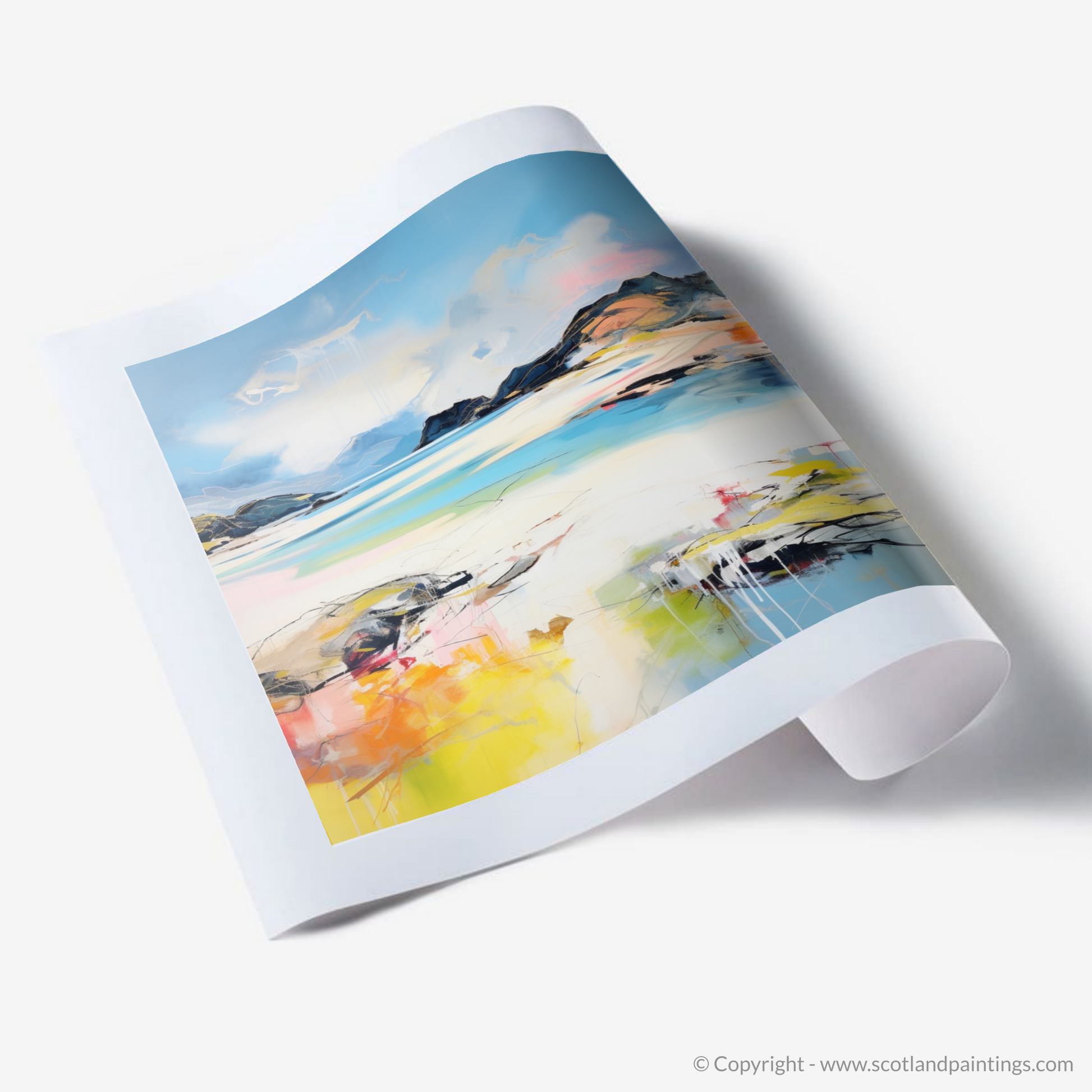 Evoke the serene beauty of Kiloran Bay with this evocative abstract print, capturing the essence of Scottish shores during the balmy summer months. Streaks of vivid blues and gentle whites mimic the clear skies above, as they reflect on tranquil waters, creating a harmonious intersection of sky and sea. Bold strokes of yellow and orange imbue the scene with the warmth of the summer sun, as it bathes the landscape in its golden glow.